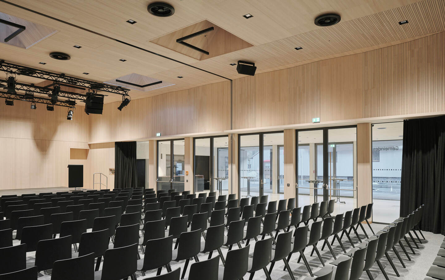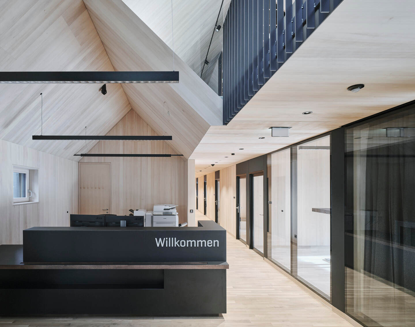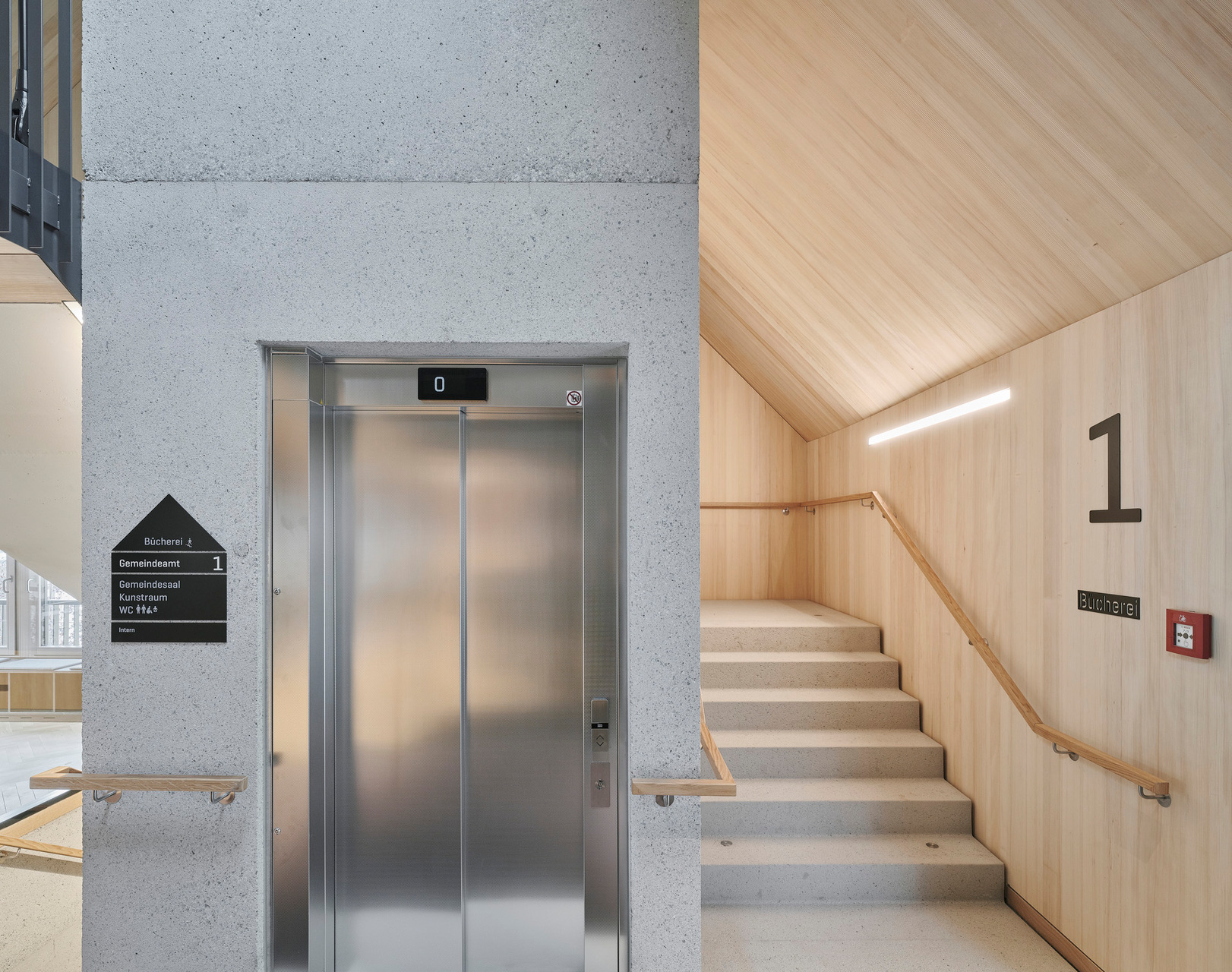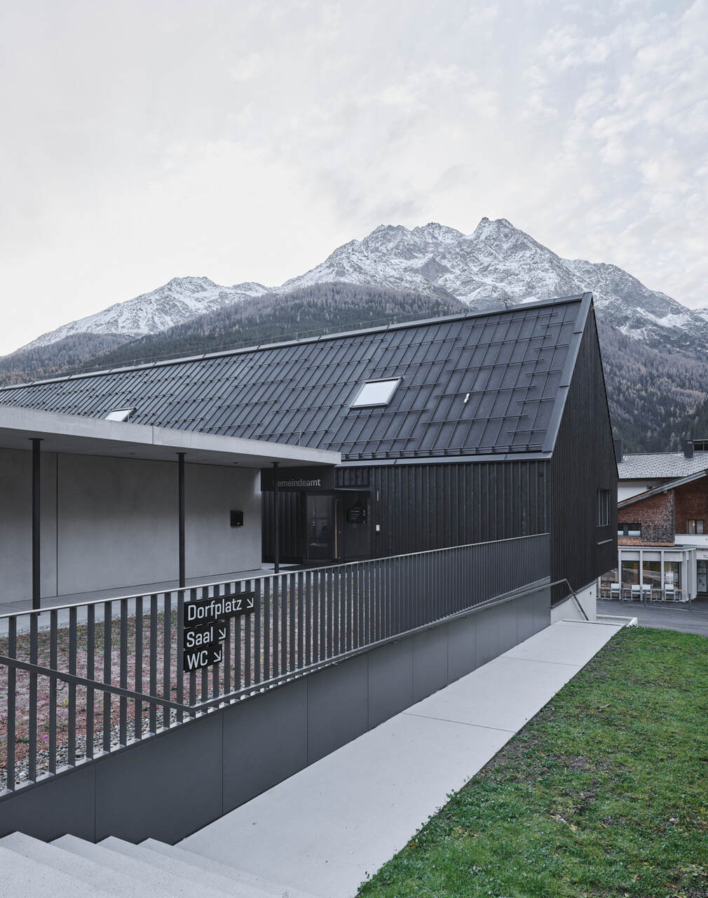 Der großzügige Vorplatz dient einerseits als adäquates Entree mit Aufenthaltsqualität, andererseits ist er als Dorfplatz für Feste und Veranstaltungen gut bespielbar. Über den durch die Auskragung geschützten Eingangsbereich gelangt man in das Foyer, an das der Mehrzwecksaal über ein bewegliches, transparentes Raumtrennsystem angebunden ist. Der über trichterförmige Lichtkörper in der Decke belichtete Saal ist durch hochwertige Holzoberflächen geprägt, die eine entsprechende Akustik gewährleisten. Vom Foyer aus werden auch die im 1. Obergeschoß liegenden Amtsräume erschlossen, die zudem direkt von einem neuen gemeindeeigenen Parkplatz aus erreichbar sind. Das Satteldach mit seinen 45° steilen Schrägen setzt sich im Inneren als Haus-im-Haus-Thema fort und schafft überaus spannende Raumkonfigurationen. Im Dachraum befindet sich über die gesamte Länge hinweg die Dorfbibliothek, von der aus man hinunter in die Gemeindeverwaltung oder über gezielt gesetzte Öffnungen in die Berge blicken kann. Eine reduzierte Materialisierung – fein geschliffene Betonoberflächen, Glas und Holz – bestimmt sowohl die Atmosphäre der öffentlichen Veranstaltungsbereiche als auch die Büros und Sitzungszimmer der Gemeindeverwaltung. (Text: Claudia Wedekind)