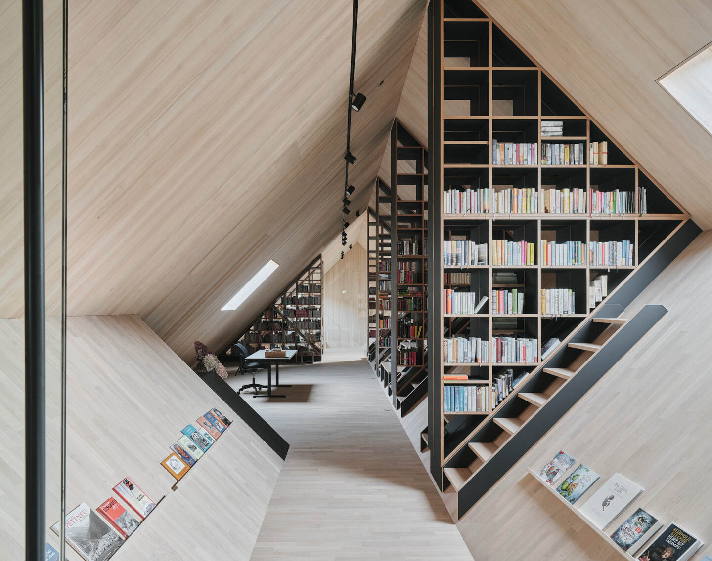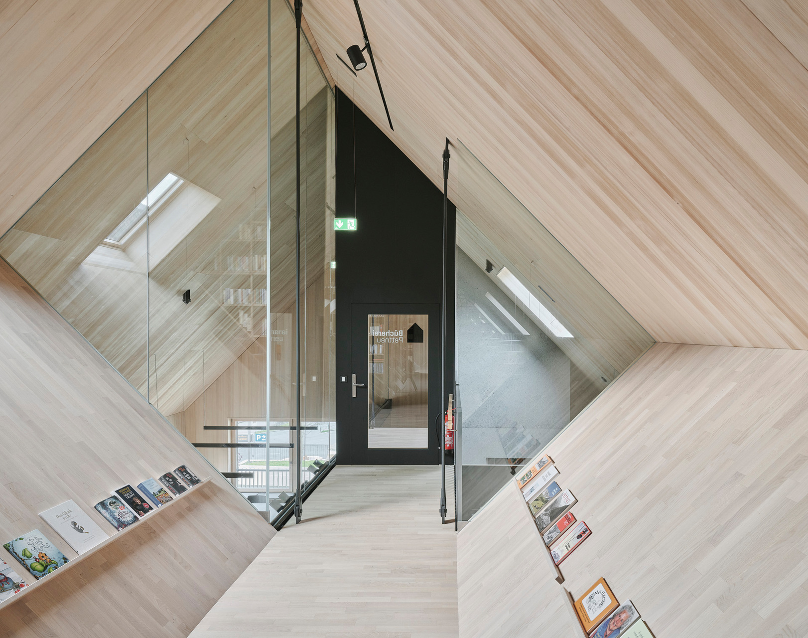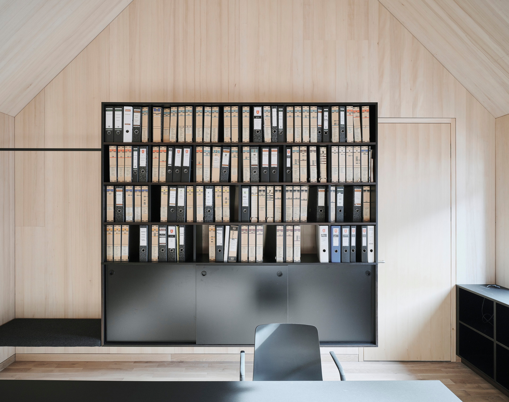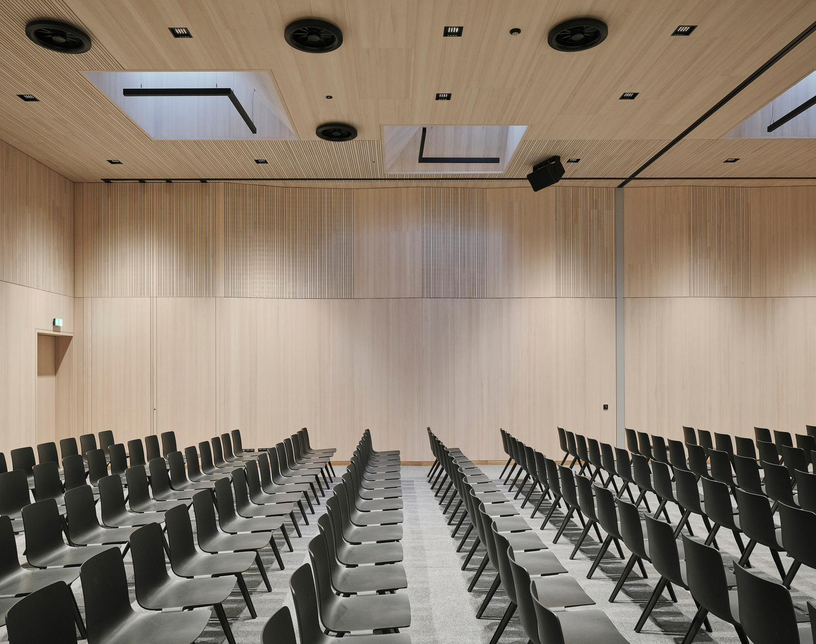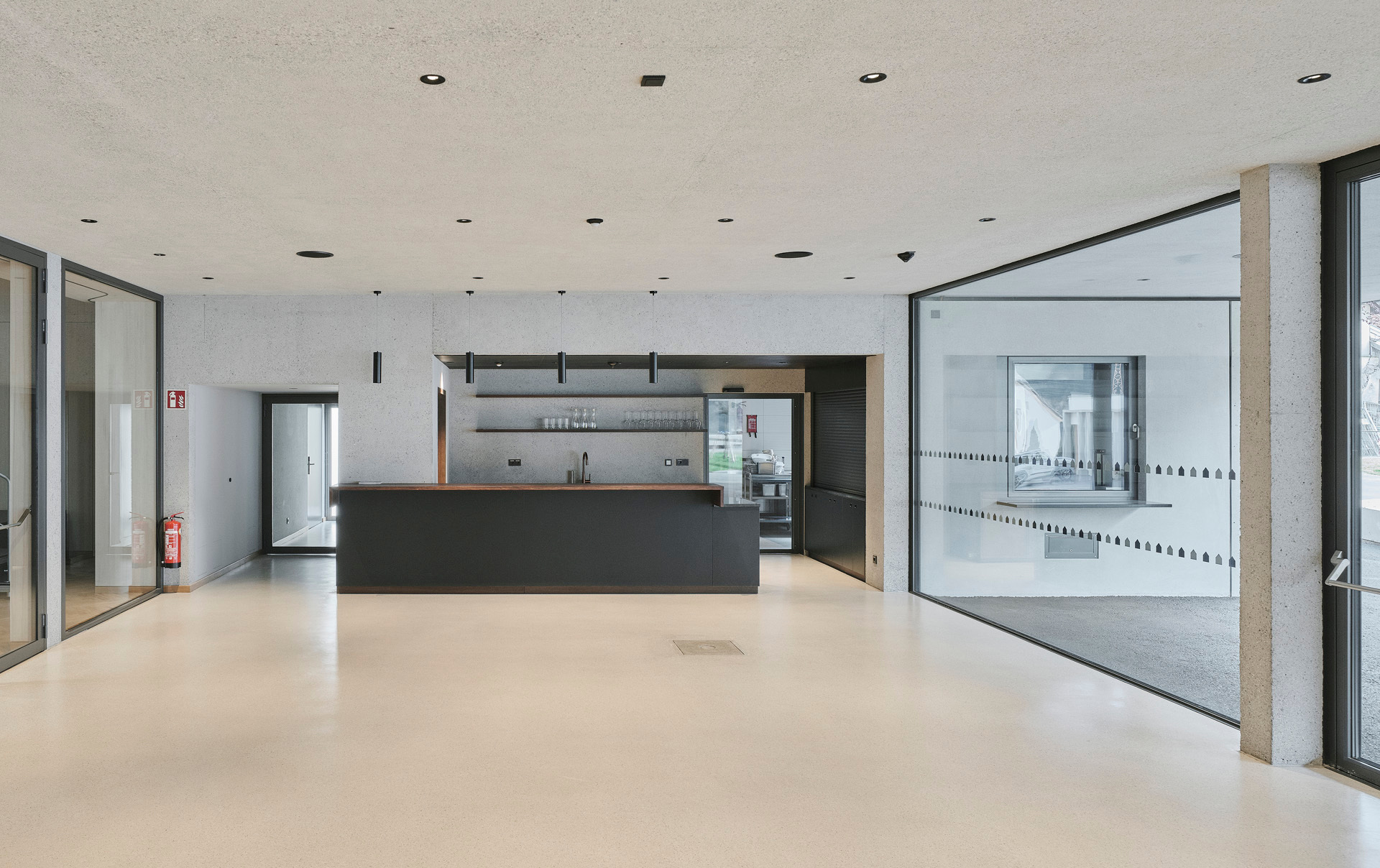 Der großzügige Vorplatz dient einerseits als adäquates Entree mit Aufenthaltsqualität, andererseits ist er als Dorfplatz für Feste und Veranstaltungen gut bespielbar. Über den durch die Auskragung geschützten Eingangsbereich gelangt man in das Foyer, an das der Mehrzwecksaal über ein bewegliches, transparentes Raumtrennsystem angebunden ist. Der über trichterförmige Lichtkörper in der Decke belichtete Saal ist durch hochwertige Holzoberflächen geprägt, die eine entsprechende Akustik gewährleisten. Vom Foyer aus werden auch die im 1. Obergeschoß liegenden Amtsräume erschlossen, die zudem direkt von einem neuen gemeindeeigenen Parkplatz aus erreichbar sind. Das Satteldach mit seinen 45° steilen Schrägen setzt sich im Inneren als Haus-im-Haus-Thema fort und schafft überaus spannende Raumkonfigurationen. Im Dachraum befindet sich über die gesamte Länge hinweg die Dorfbibliothek, von der aus man hinunter in die Gemeindeverwaltung oder über gezielt gesetzte Öffnungen in die Berge blicken kann. Eine reduzierte Materialisierung – fein geschliffene Betonoberflächen, Glas und Holz – bestimmt sowohl die Atmosphäre der öffentlichen Veranstaltungsbereiche als auch die Büros und Sitzungszimmer der Gemeindeverwaltung. (Text: Claudia Wedekind)