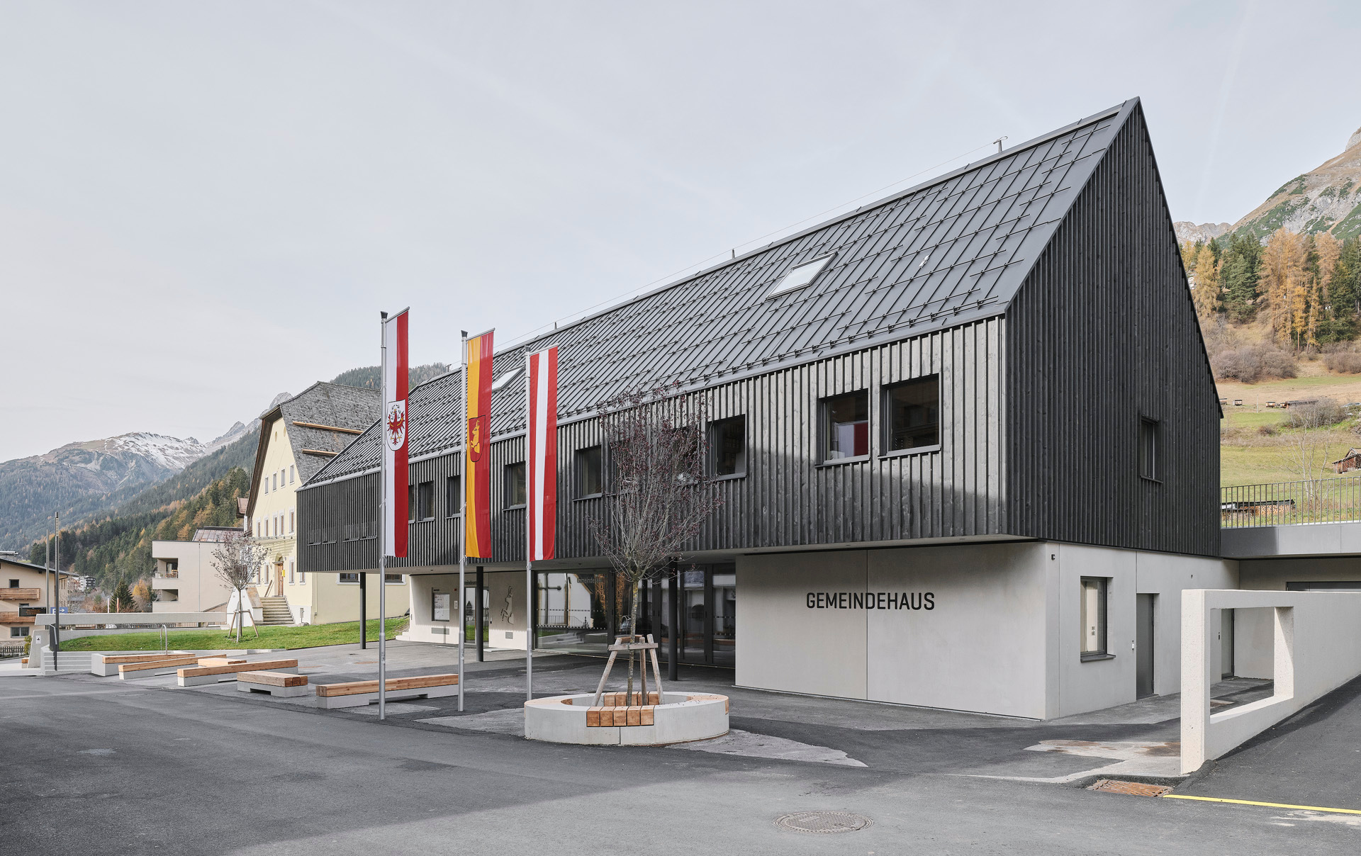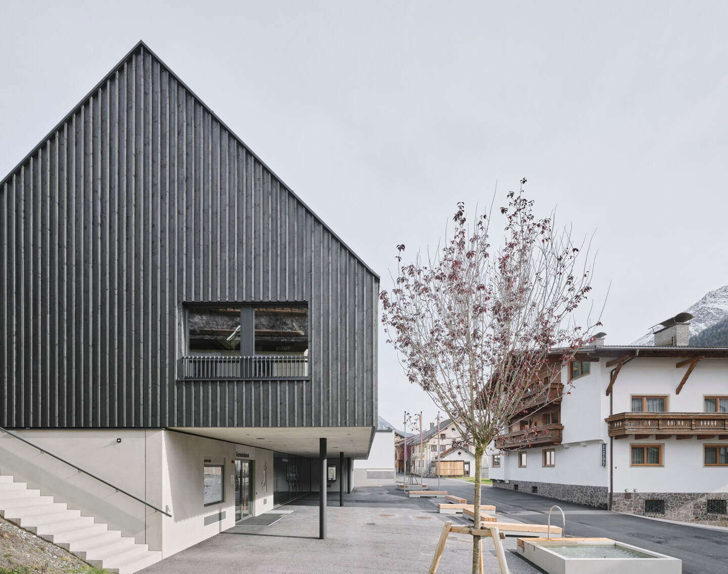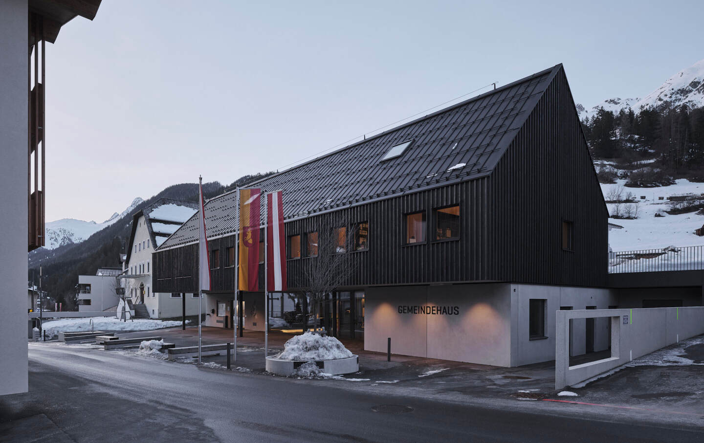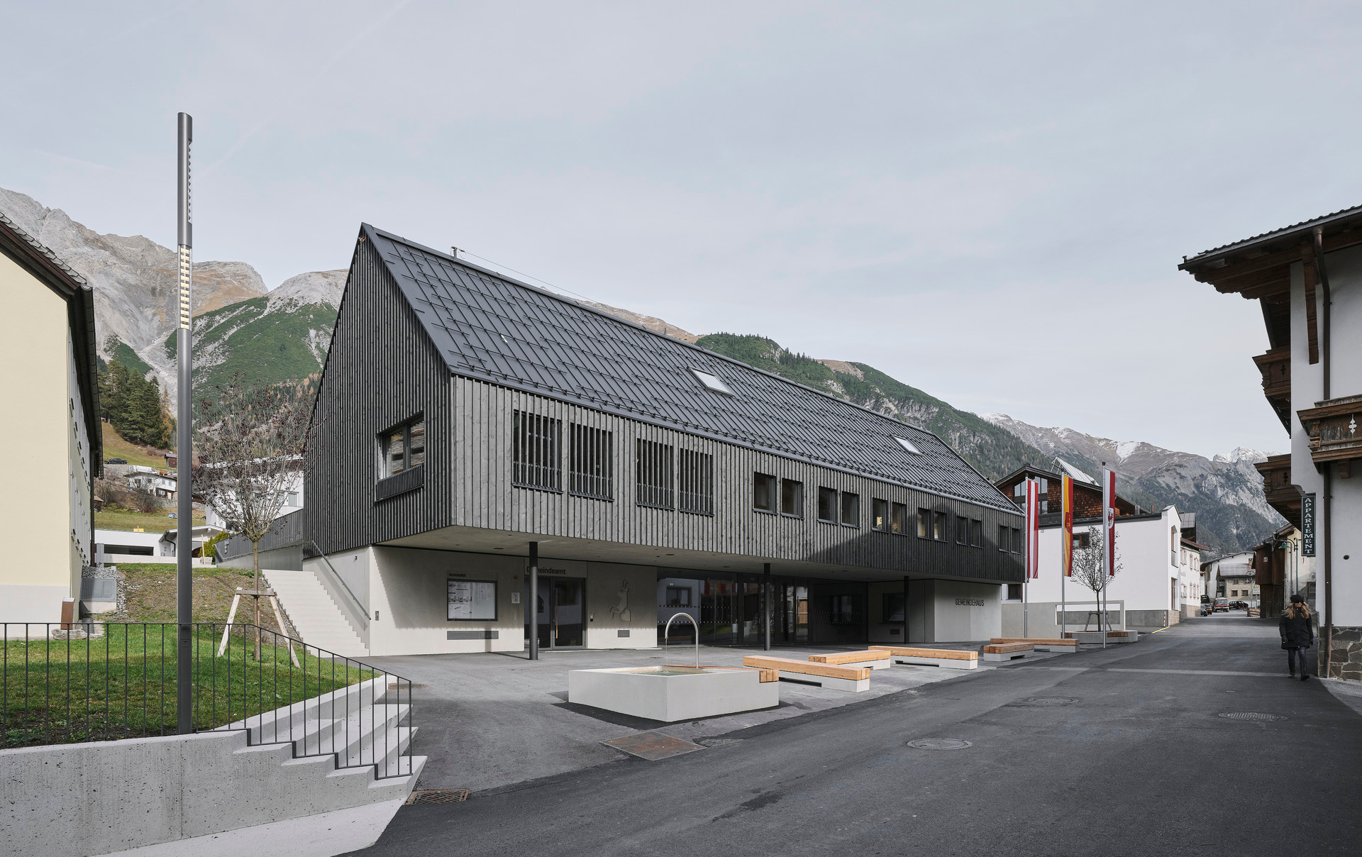 Ausgangspunkt für das siegreiche Projekt von Erich Strolz war es, den Neubau so zu konzipieren, dass er sich möglichst gut in das vorherrschende Erscheinungsbild der Dorfstraße einfügt. Der parallel zur Straße situierte Baukörper ist zweigeteilt. In einem zurückgesetzten, als Massivbau ausgeführten Sockelgeschoß liegen das Foyer und dahinter der zum Teil eingegrabene Veranstaltungssaal. Darauf wurde zur Straße hin ein auskragendes Satteldachhaus für das Gemeindeamt als Holzbau aufgesetzt, der in einer zeitgemäßen Architektursprache an lokale Bautraditionen anknüpft.