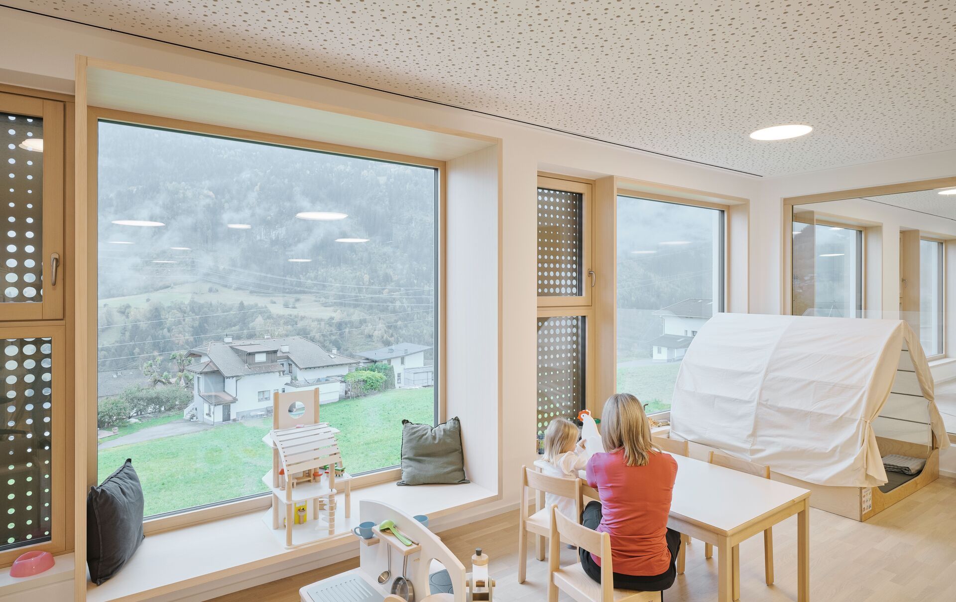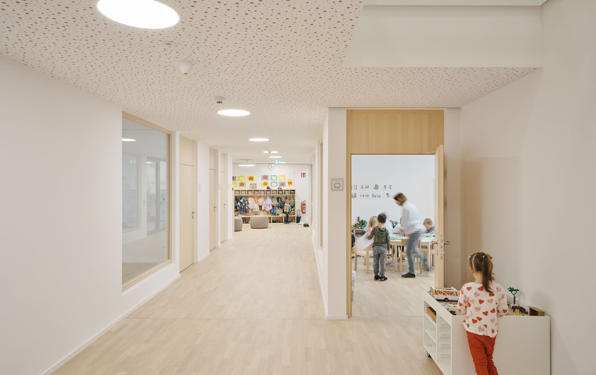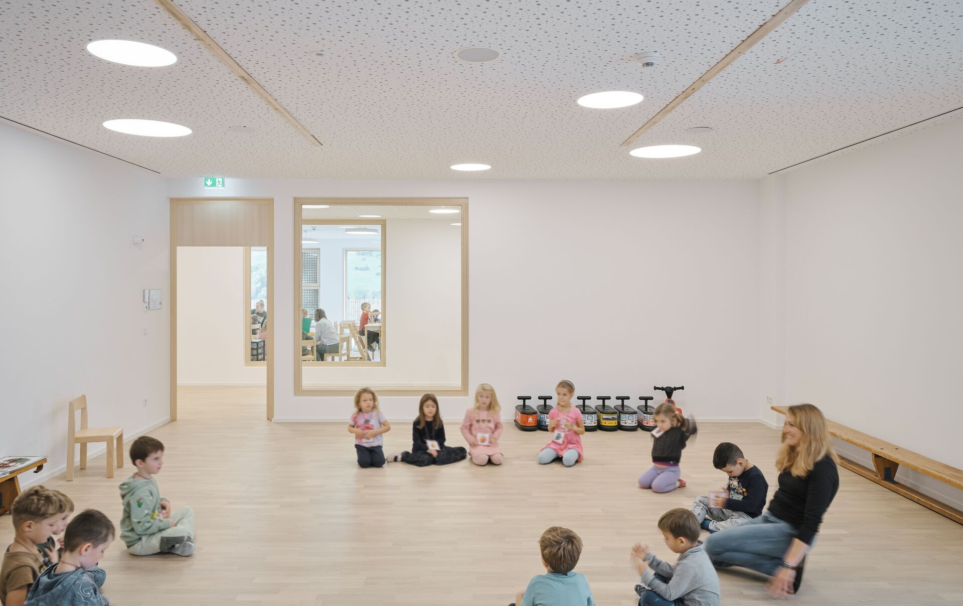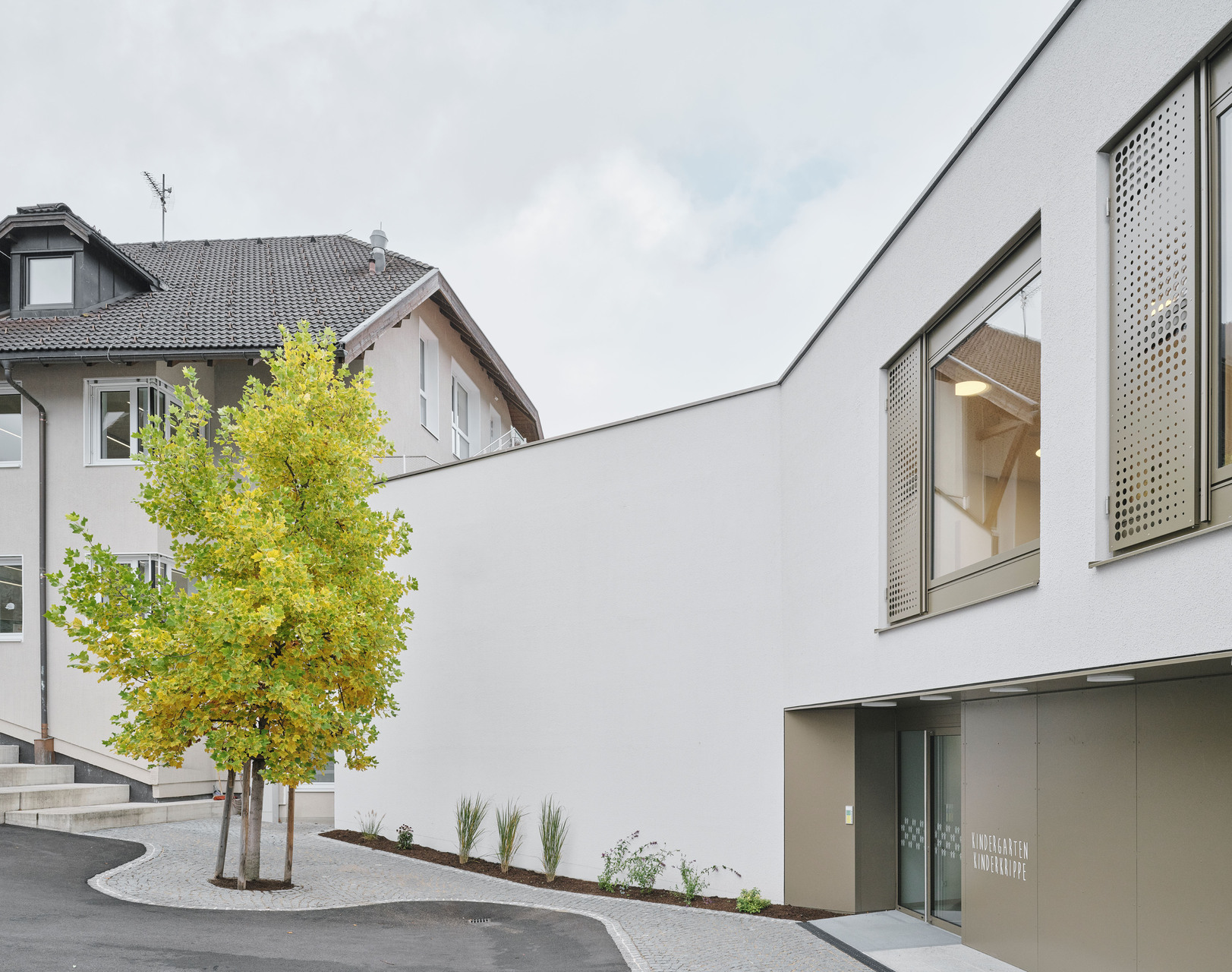 Das neue Bauvolumen ist so konzipiert, dass es sich in Proportion und Struktur harmonisch in die Umgebung einfügt und gleichzeitig eine klare, zeitgemäße Architektursprache spricht. Direkt an den Turnsaal wurde ein tortenstückförmiger Erschließungstrakt angebaut, der mit Stiegenhaus und Aufzug einen barrierefreien Zugang zu allen Ebenen gewährleistet. Der Baukörper für den viergruppigen Kindergarten und die zweigruppige Kinderkrippe fügt sich im Westen Richtung Ortszentrum und Kirche passgenau in die gewachsene Struktur ein. Nach Osten hin öffnet sich das Gebäude zum Hanggrundstück und der unbebauten Wiese, wodurch eine optimale Belichtung der dahinterliegenden Gruppenräume gewährleistet wird. Im Inneren wurde besonderer Wert auf offene Grundrisse gelegt, um ein freundliches und kindgerechtes Umfeld für Kinder und Betreuer:innen zu schaffen.