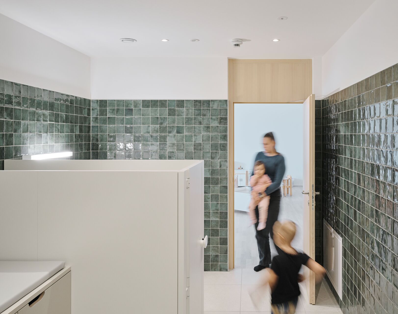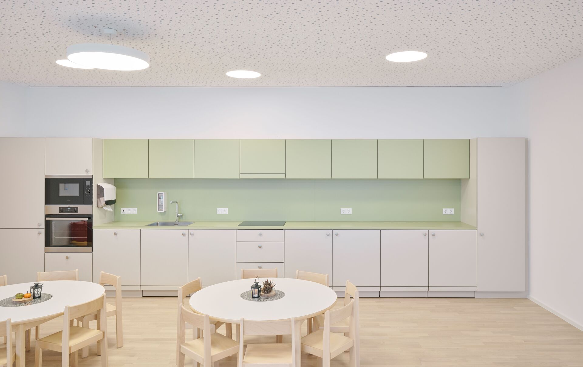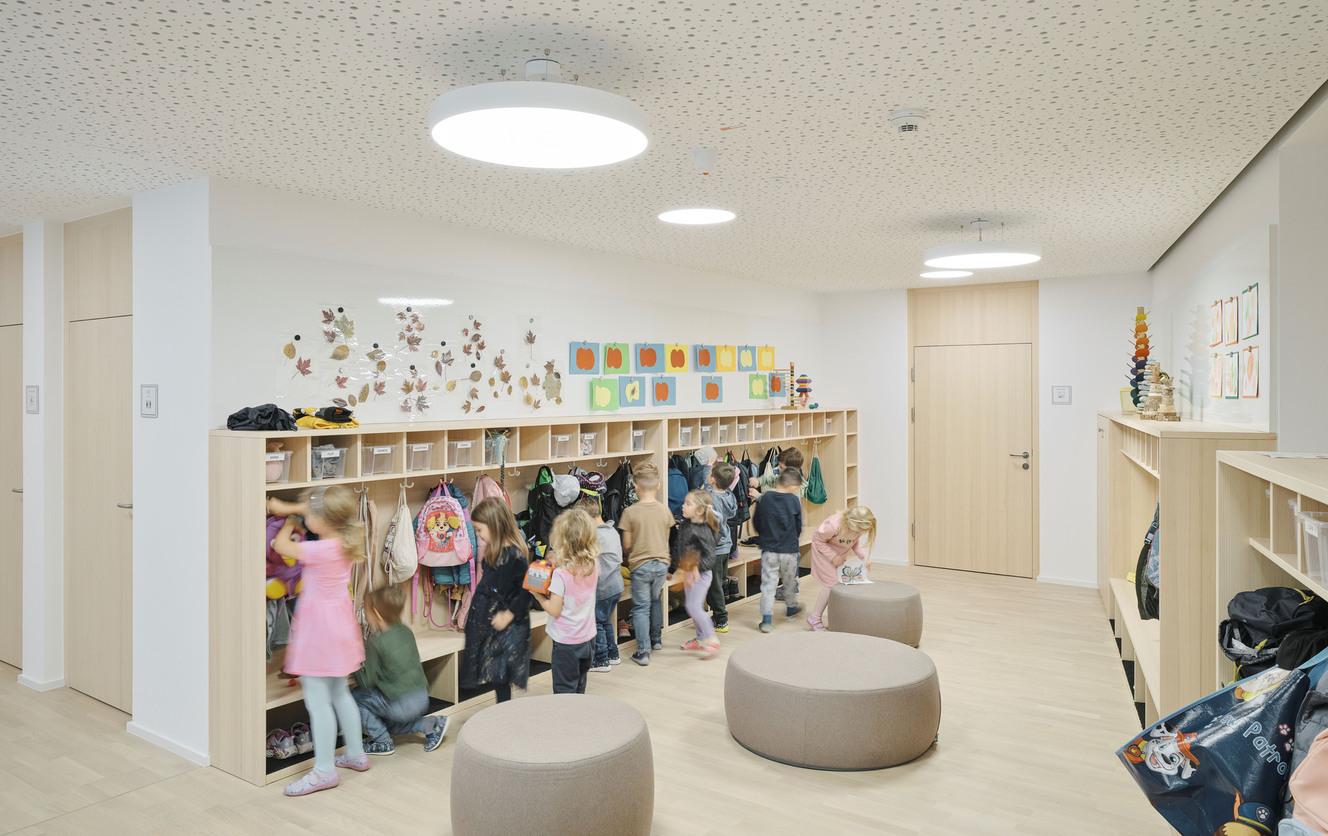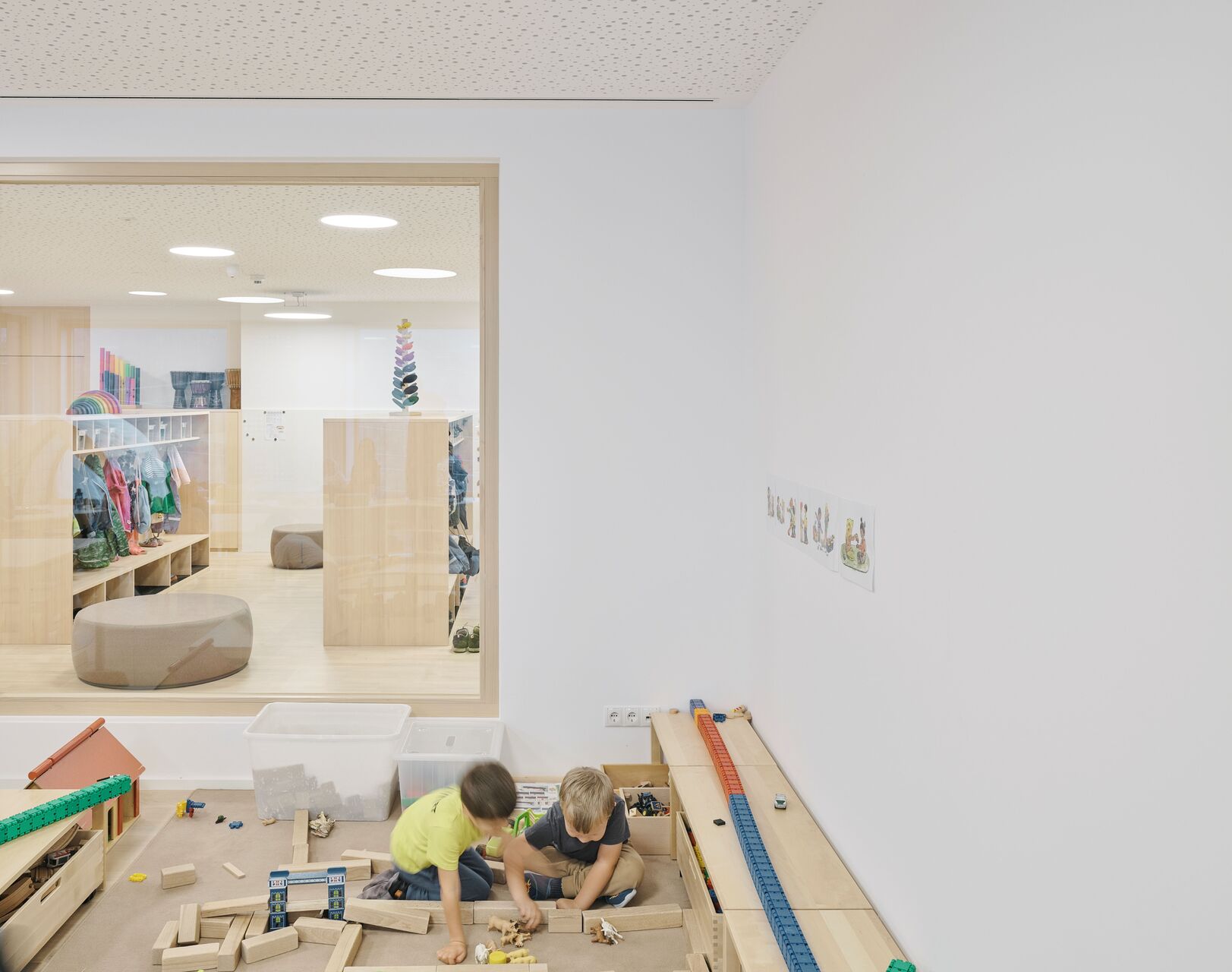 Das neue Bauvolumen ist so konzipiert, dass es sich in Proportion und Struktur harmonisch in die Umgebung einfügt und gleichzeitig eine klare, zeitgemäße Architektursprache spricht. Direkt an den Turnsaal wurde ein tortenstückförmiger Erschließungstrakt angebaut, der mit Stiegenhaus und Aufzug einen barrierefreien Zugang zu allen Ebenen gewährleistet. Der Baukörper für den viergruppigen Kindergarten und die zweigruppige Kinderkrippe fügt sich im Westen Richtung Ortszentrum und Kirche passgenau in die gewachsene Struktur ein. Nach Osten hin öffnet sich das Gebäude zum Hanggrundstück und der unbebauten Wiese, wodurch eine optimale Belichtung der dahinterliegenden Gruppenräume gewährleistet wird. Im Inneren wurde besonderer Wert auf offene Grundrisse gelegt, um ein freundliches und kindgerechtes Umfeld für Kinder und Betreuer:innen zu schaffen.
