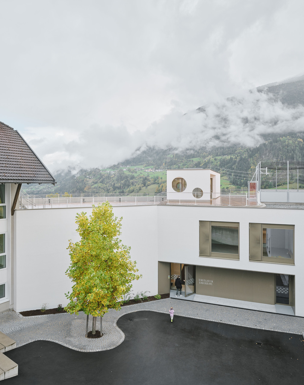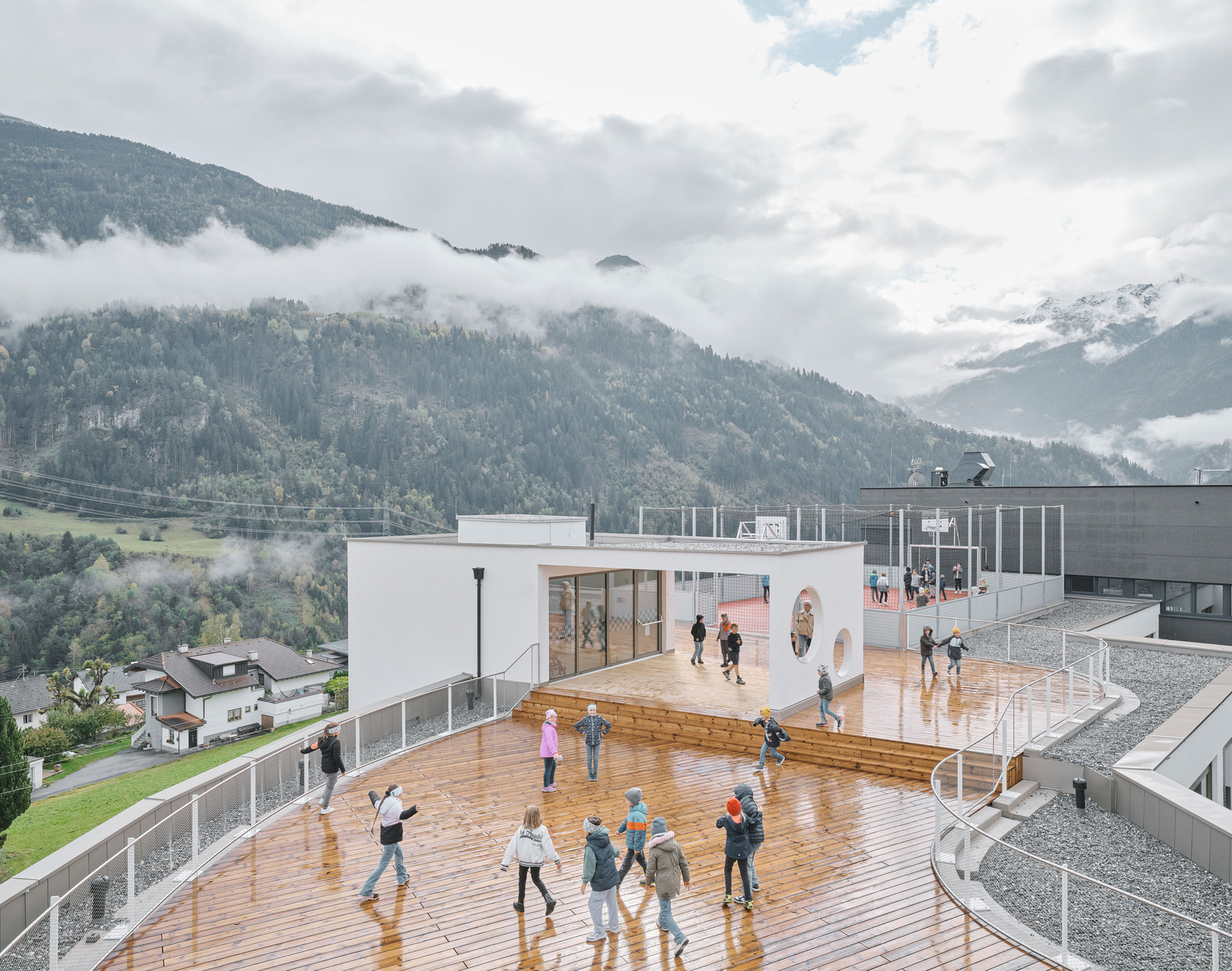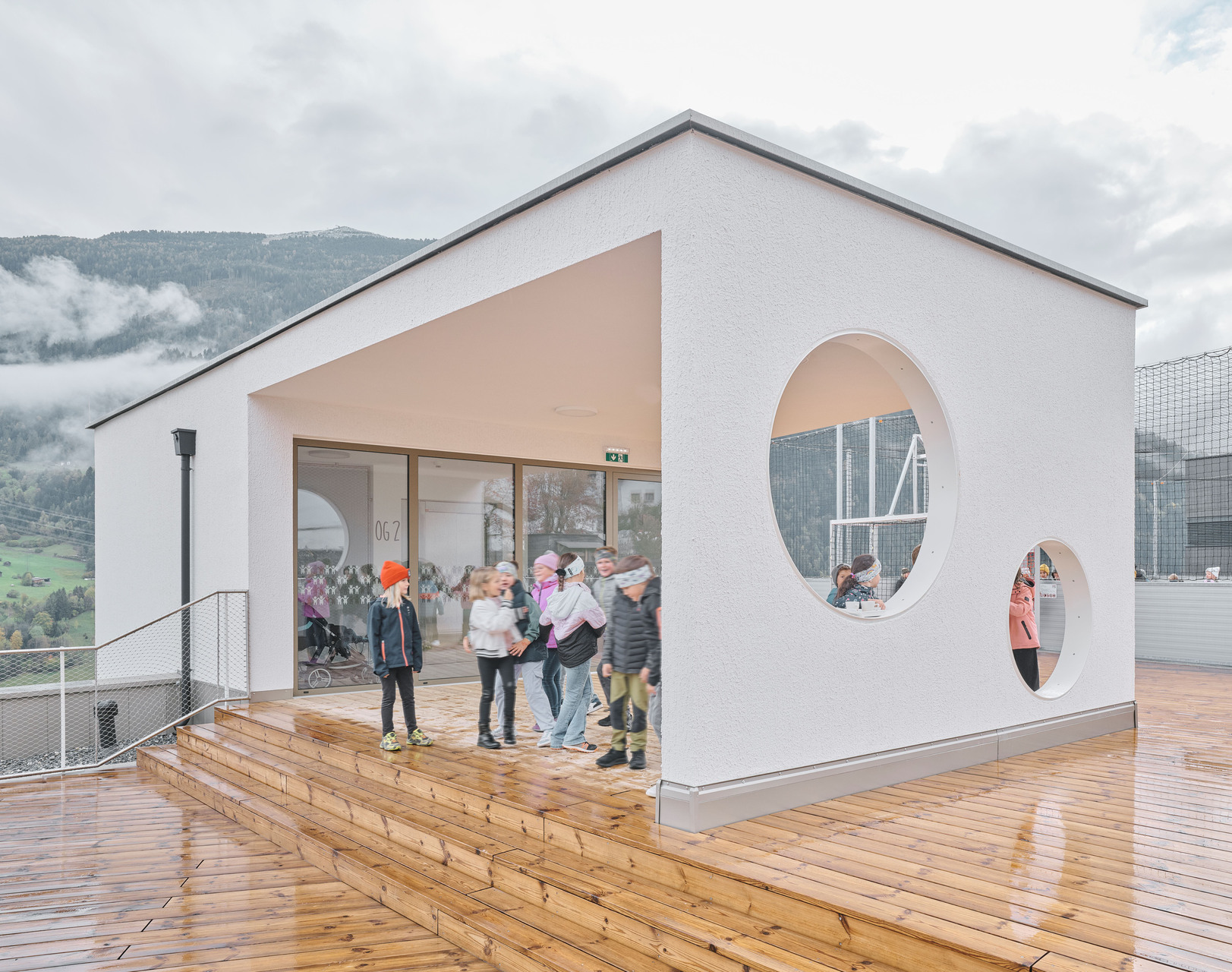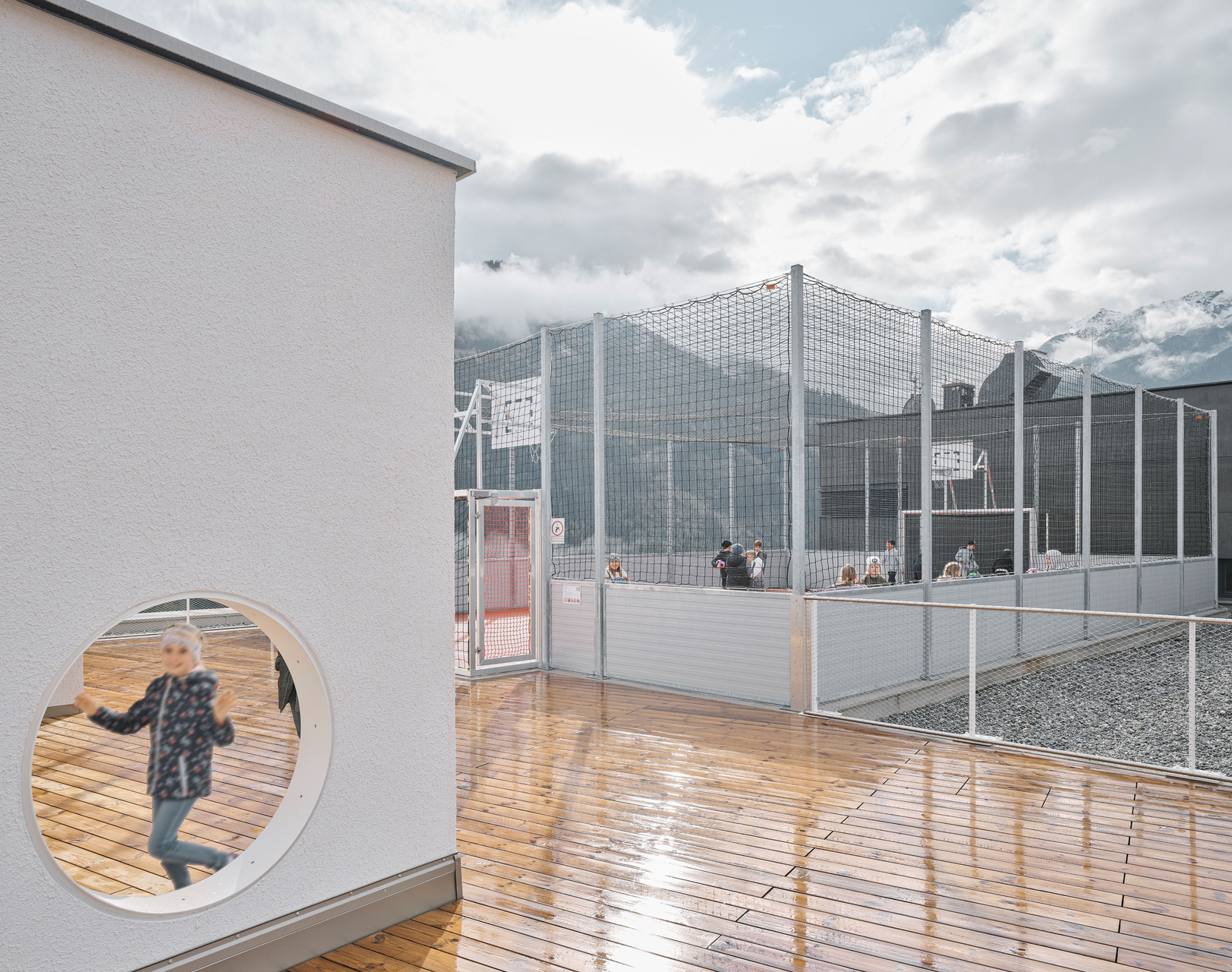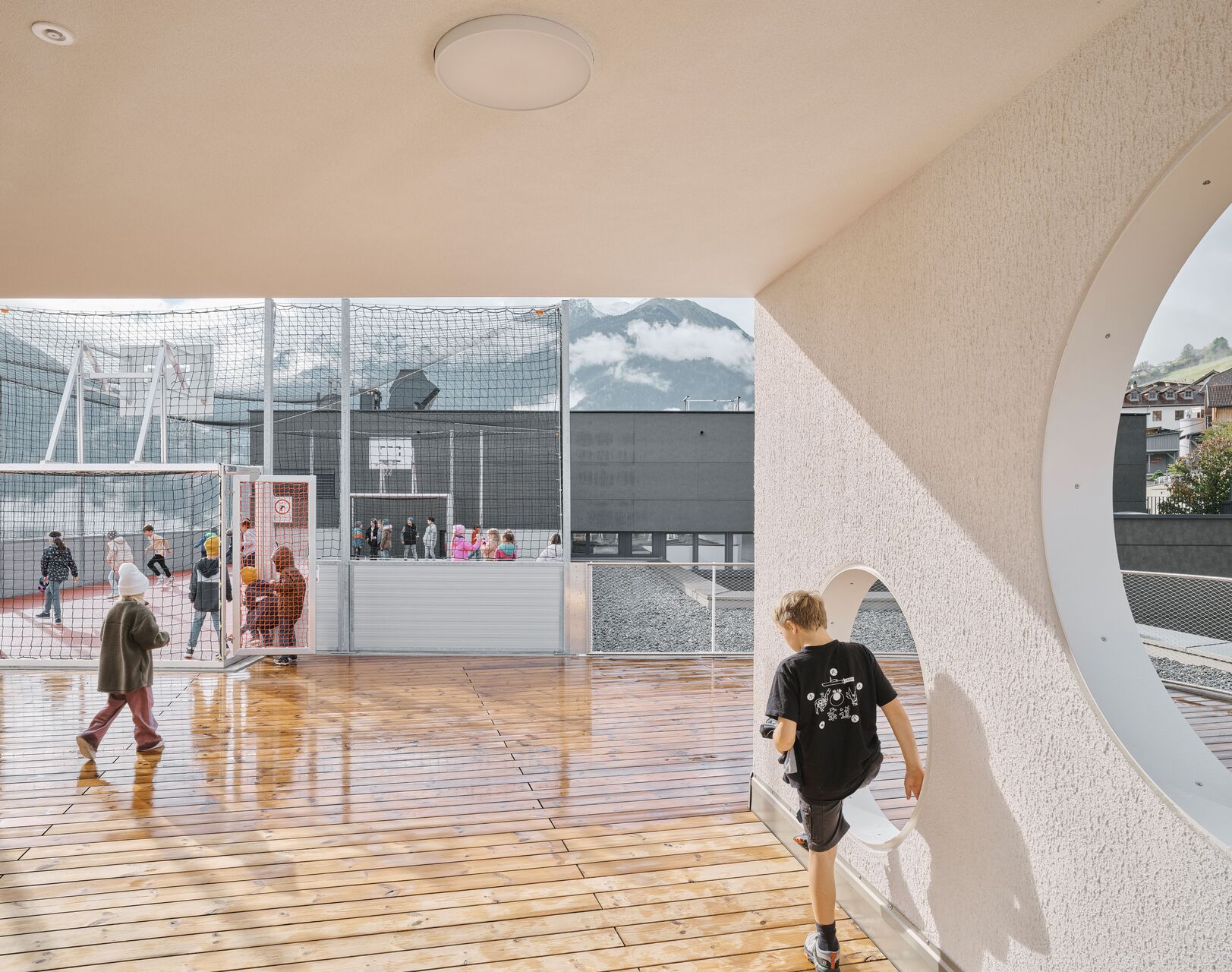 Über den Erschließungstrakt, der im Osten als eigenständiger, turmartiger Baukörper mit runden Fensteröffnungen in Erscheinung tritt, gelangt man auch auf das Flachdach des Kindergartens und des Turnsaals, wo den Kindern aller Altersgruppen eine großzügige Terrasse mit Ballspielkäfig zur Verfügung steht. Diese multifunktionale, teilweise überdachte Dachlandschaft ist ein zentraler Bestandteil der neuen Bildungsinfrastruktur: Sie dient nicht nur als Spiel- und Bewegungsfläche, sondern kann auch als „Freiluftklasse“ für den Unterricht im Freien genutzt werden. (Text: Claudia Wedekind)