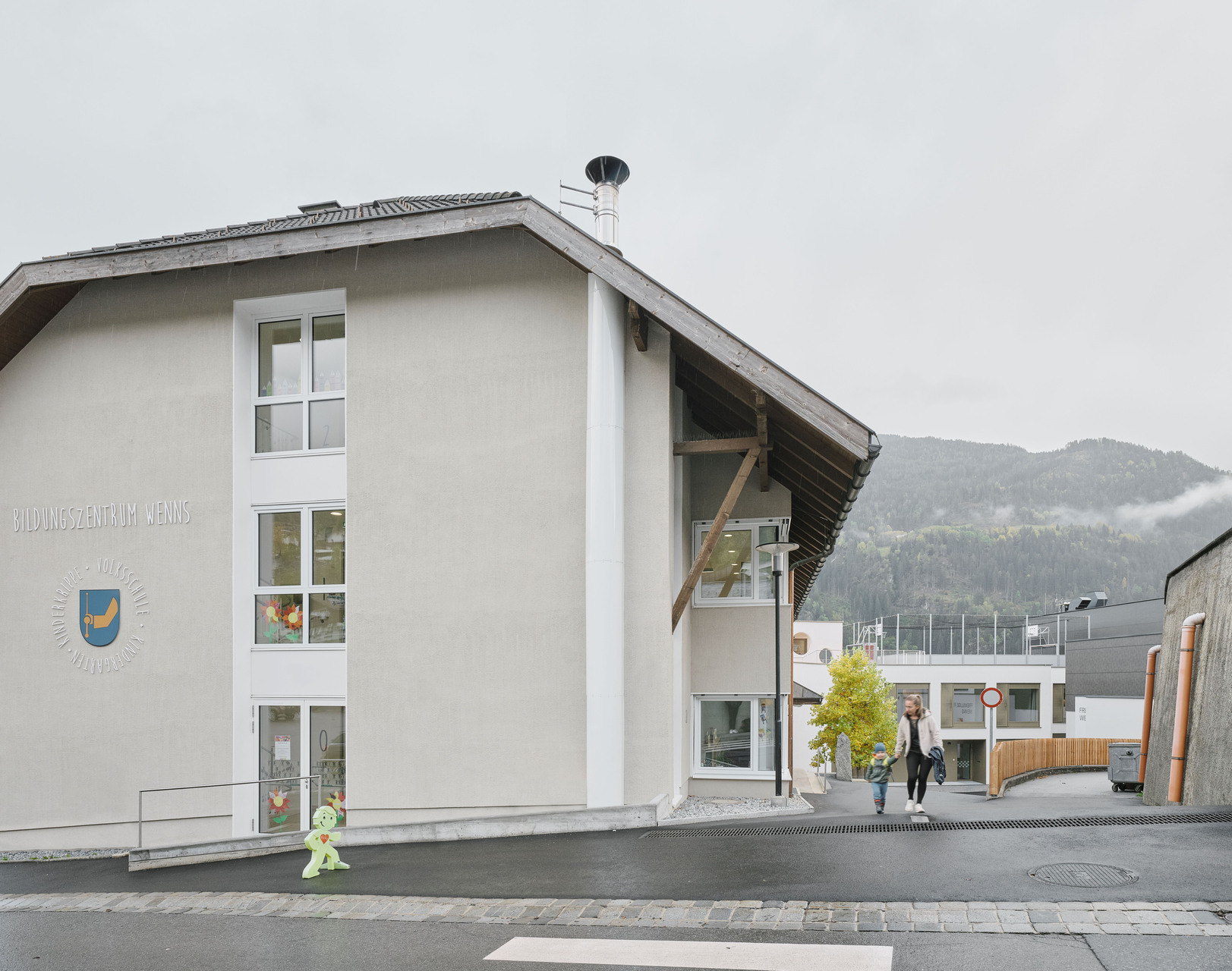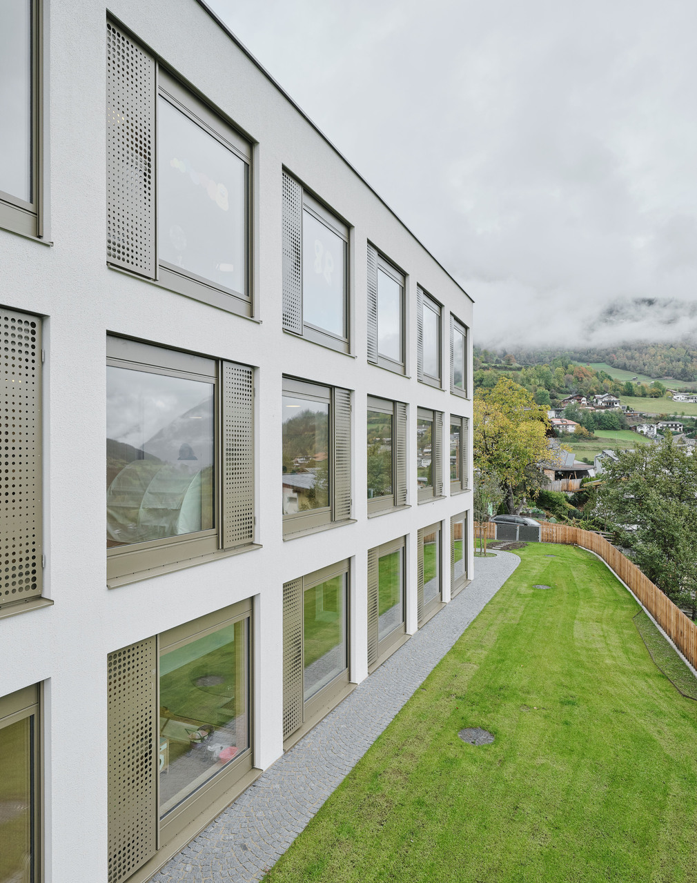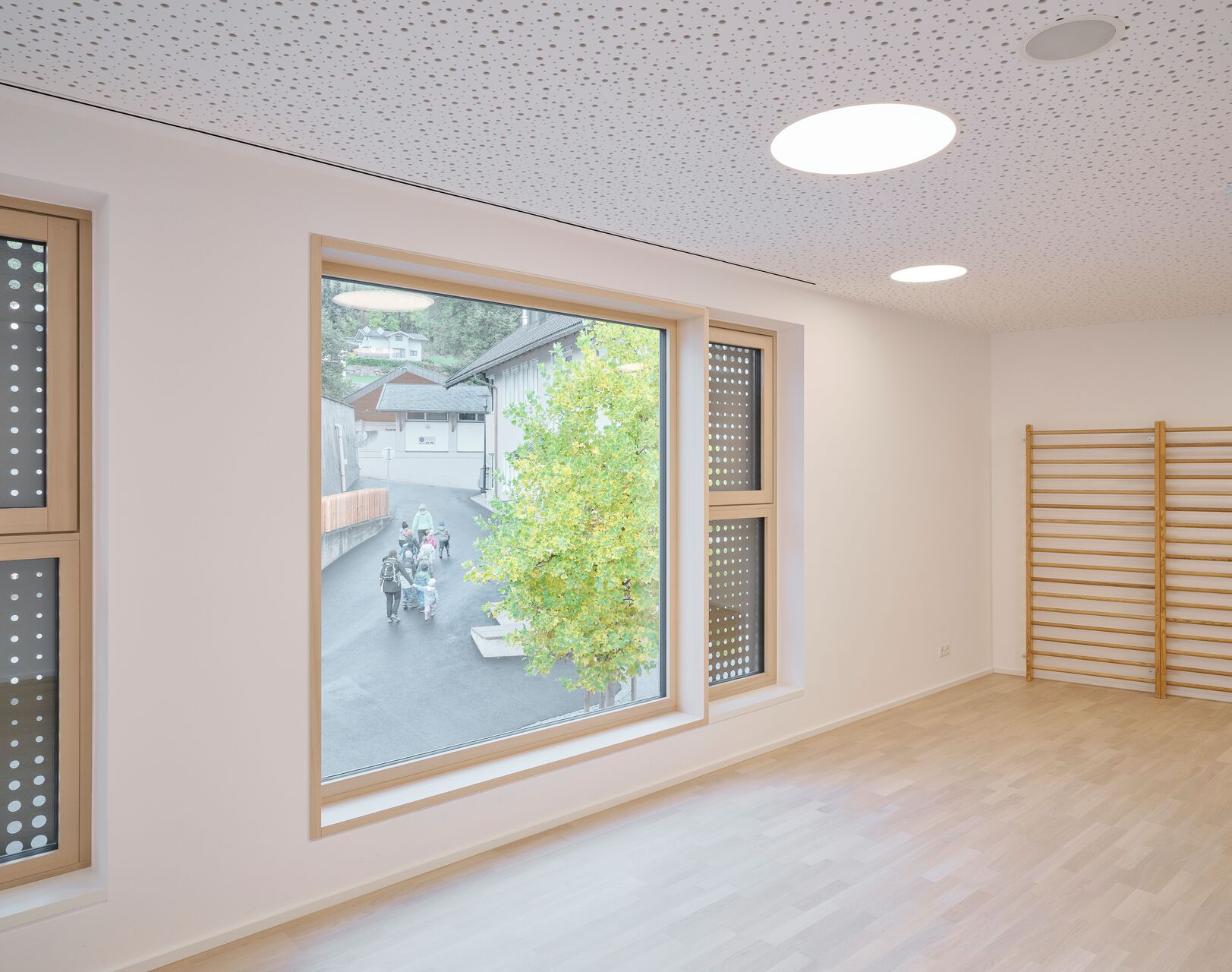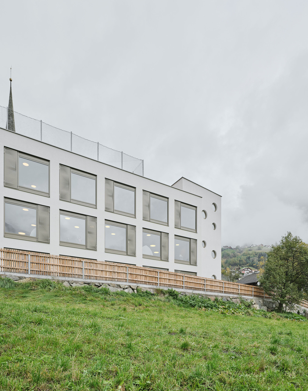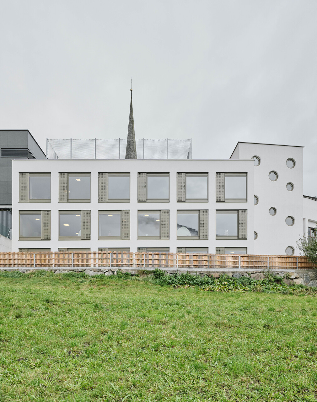 Über den Erschließungstrakt, der im Osten als eigenständiger, turmartiger Baukörper mit runden Fensteröffnungen in Erscheinung tritt, gelangt man auch auf das Flachdach des Kindergartens und des Turnsaals, wo den Kindern aller Altersgruppen eine großzügige Terrasse mit Ballspielkäfig zur Verfügung steht. Diese multifunktionale, teilweise überdachte Dachlandschaft ist ein zentraler Bestandteil der neuen Bildungsinfrastruktur: Sie dient nicht nur als Spiel- und Bewegungsfläche, sondern kann auch als „Freiluftklasse“ für den Unterricht im Freien genutzt werden. (Text: Claudia Wedekind)
