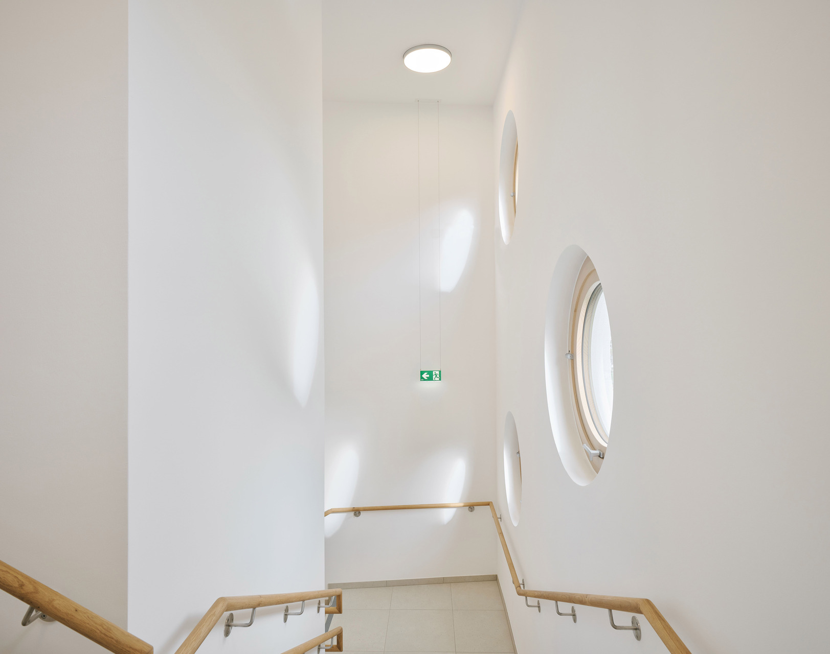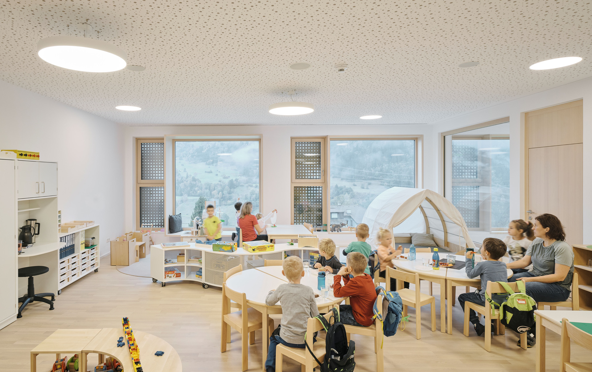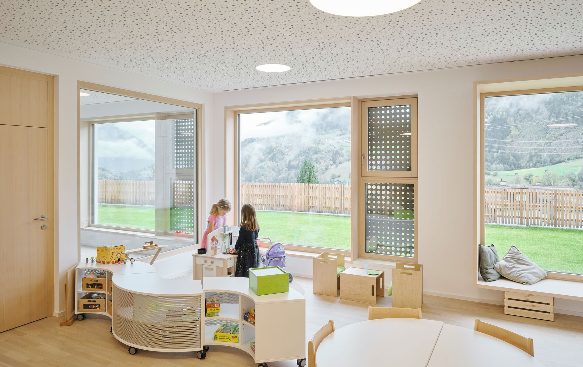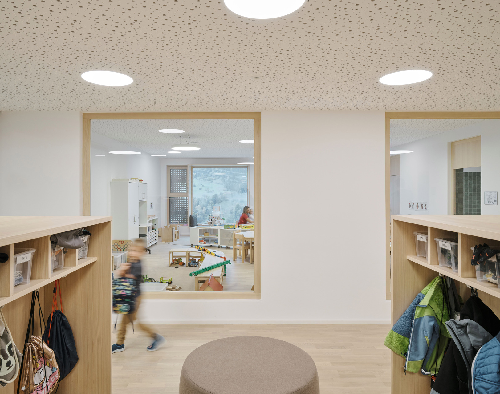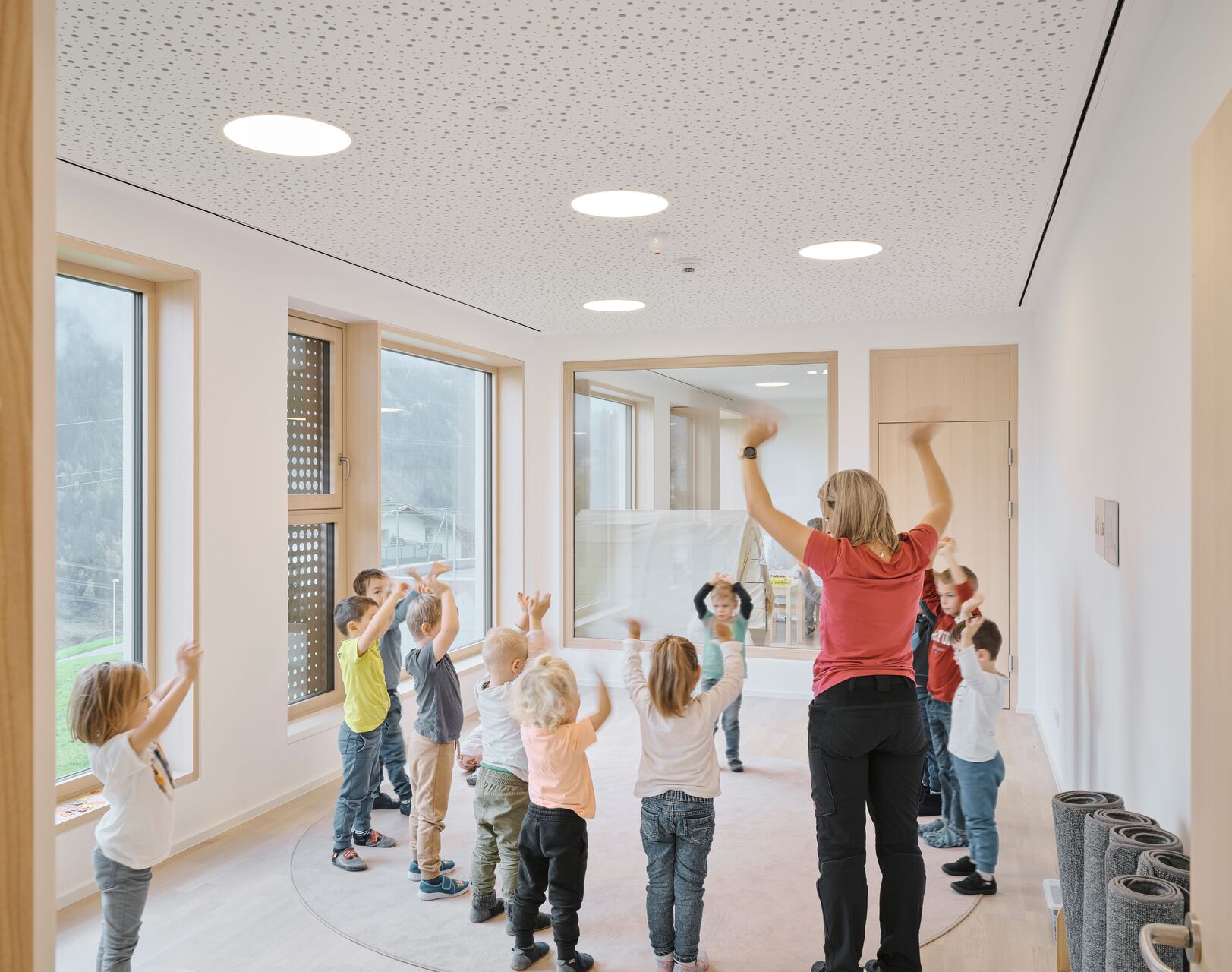 Über den Erschließungstrakt, der im Osten als eigenständiger, turmartiger Baukörper mit runden Fensteröffnungen in Erscheinung tritt, gelangt man auch auf das Flachdach des Kindergartens und des Turnsaals, wo den Kindern aller Altersgruppen eine großzügige Terrasse mit Ballspielkäfig zur Verfügung steht. Diese multifunktionale, teilweise überdachte Dachlandschaft ist ein zentraler Bestandteil der neuen Bildungsinfrastruktur: Sie dient nicht nur als Spiel- und Bewegungsfläche, sondern kann auch als „Freiluftklasse“ für den Unterricht im Freien genutzt werden. (Text: Claudia Wedekind)