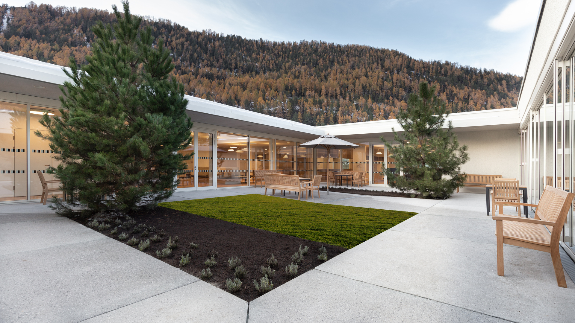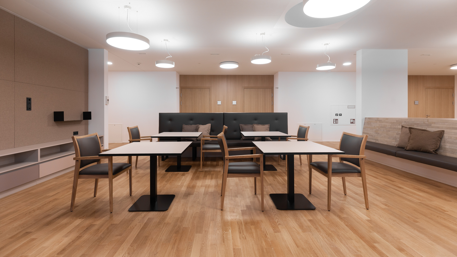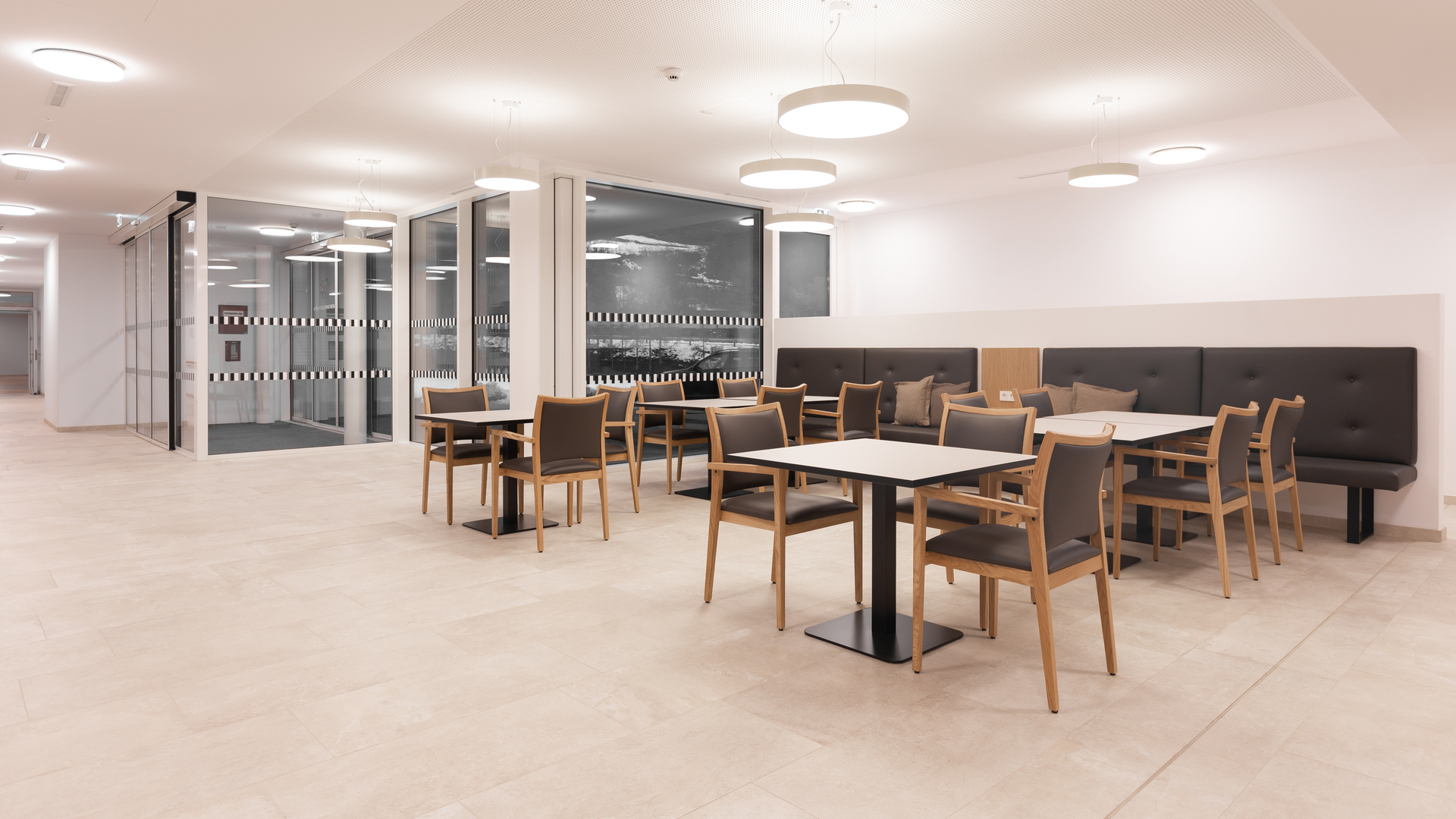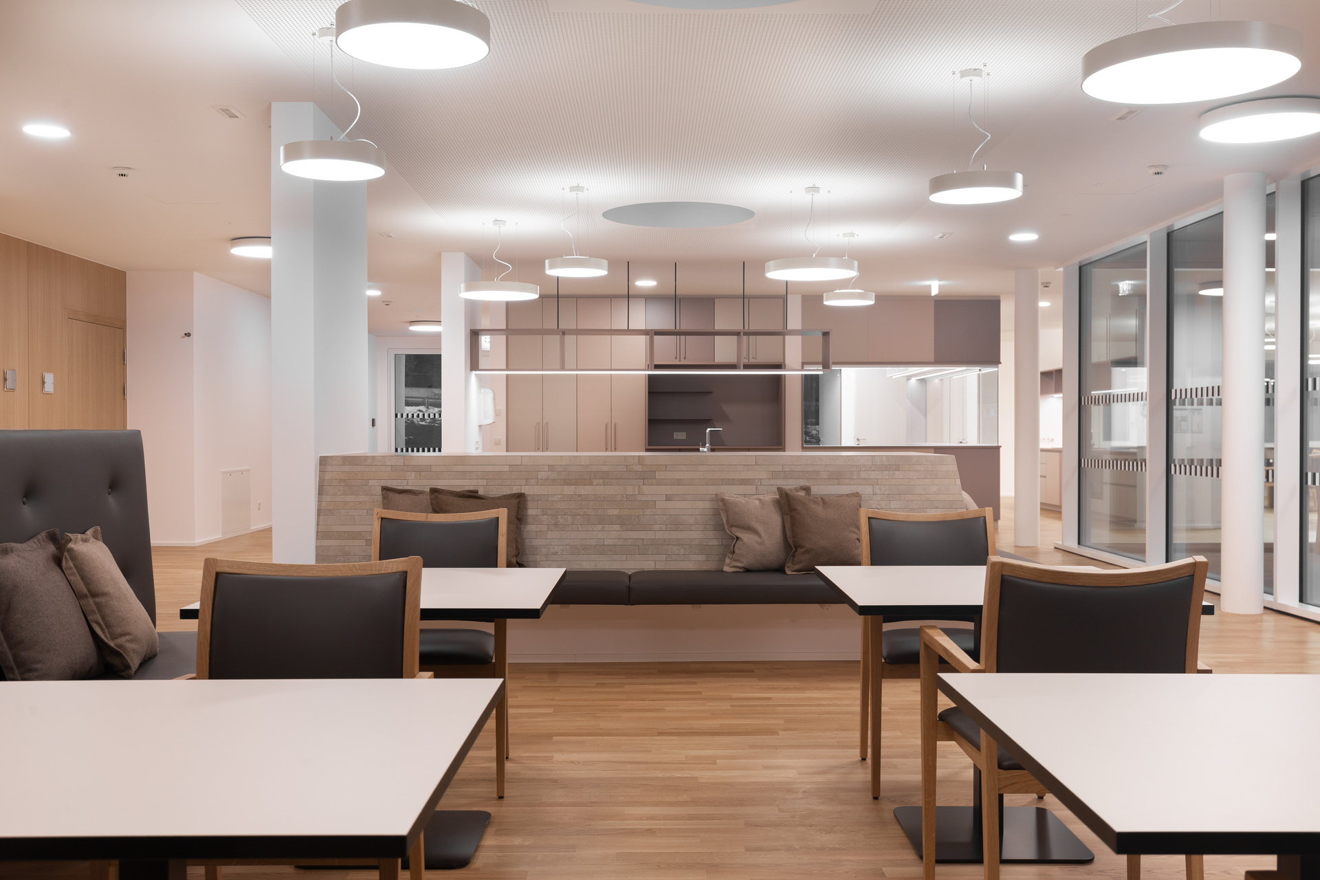 Grundgedanke des von ROECK Architekten entwickelten Konzepts war es, ein barrierefreies Gebäude zu entwickeln, dass auf die Anforderungen und Bedürfnisse der Bewohner:innen eingeht und ihnen dabei hilft, ihren Alltag zu bewältigen. Der auf einer Wiese errichtete eingeschoßige Neubau mit 33 gleichwertigen Einzelzimmern ist rund um einen großzügigen Innenhof organisiert. Sowohl die Fassaden als auch das Innere sind durch eine klare Formensprache und ein reduziertes Farbkonzept geprägt. Verschiedene Oberflächen, die Kombination von harmonischen Farben und der Einsatz von heimischen Hölzern tragen dazu bei, dass die Bewohner:innen und Mitarbeiter:innen in einer familiären und freundlichen Atmosphäre leben und arbeiten können. Zwischen neuem und altem Trakt entstand außerdem eine zentrale Eingangshalle mit einem Tagescafé als Treffpunkt.