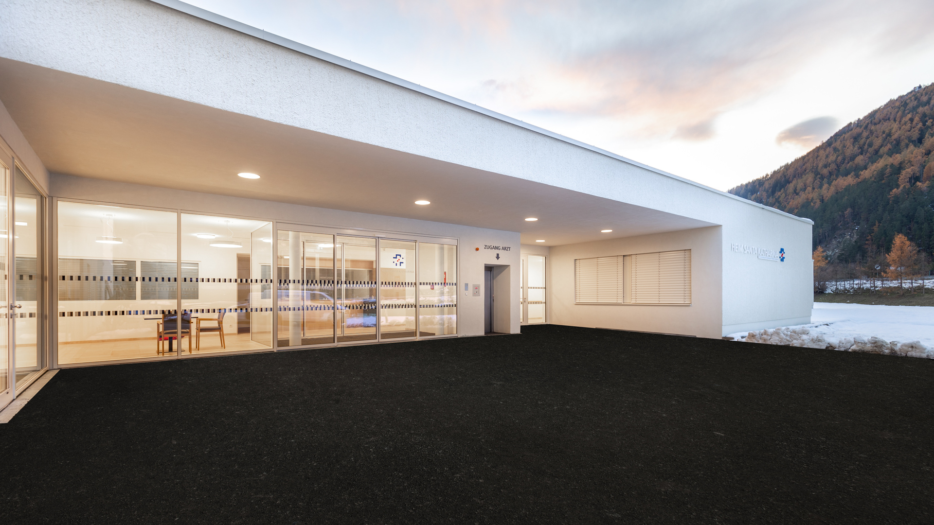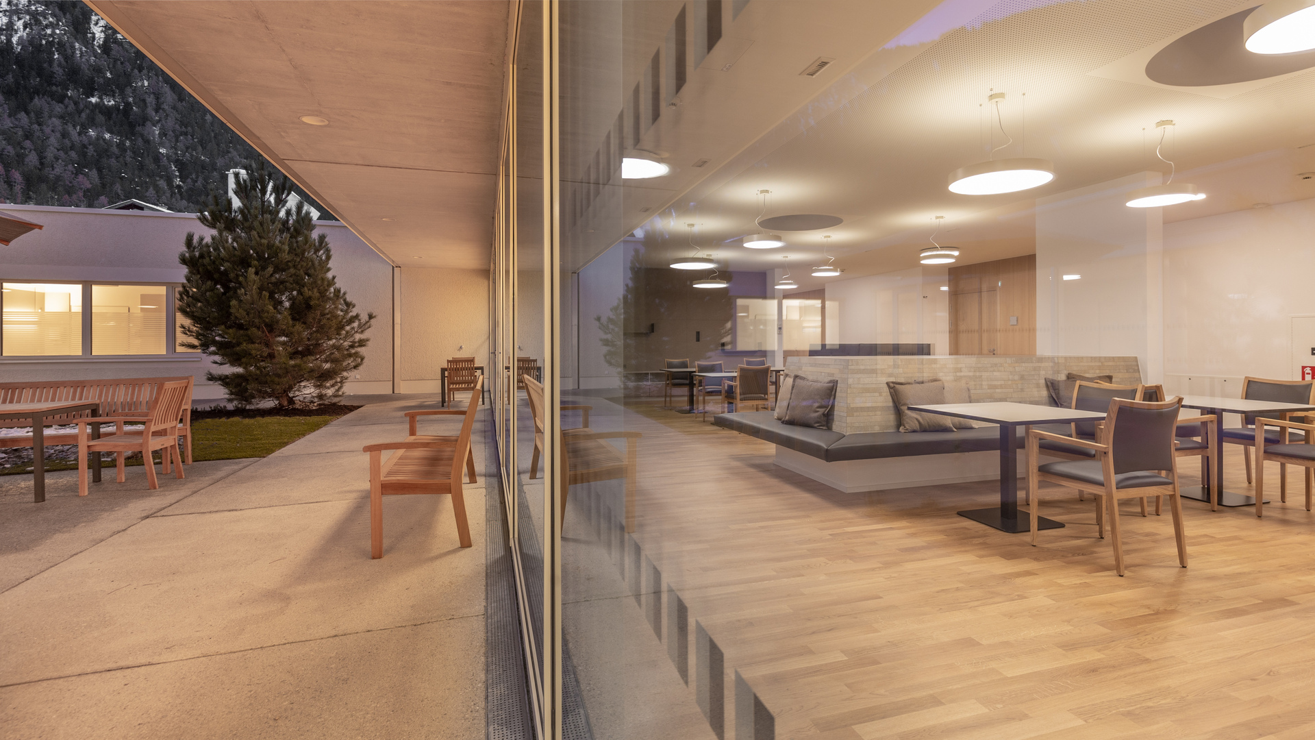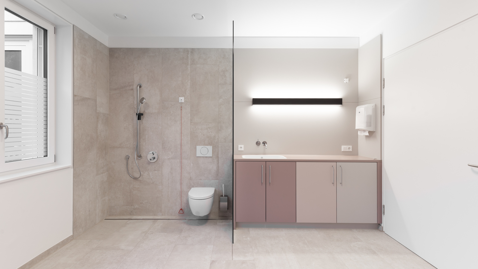 Grundgedanke des von ROECK Architekten entwickelten Konzepts war es, ein barrierefreies Gebäude zu entwickeln, dass auf die Anforderungen und Bedürfnisse der Bewohner:innen eingeht und ihnen dabei hilft, ihren Alltag zu bewältigen. Der auf einer Wiese errichtete eingeschoßige Neubau mit 33 gleichwertigen Einzelzimmern ist rund um einen großzügigen Innenhof organisiert. Sowohl die Fassaden als auch das Innere sind durch eine klare Formensprache und ein reduziertes Farbkonzept geprägt. Verschiedene Oberflächen, die Kombination von harmonischen Farben und der Einsatz von heimischen Hölzern tragen dazu bei, dass die Bewohner:innen und Mitarbeiter:innen in einer familiären und freundlichen Atmosphäre leben und arbeiten können. Zwischen neuem und altem Trakt entstand außerdem eine zentrale Eingangshalle mit einem Tagescafé als Treffpunkt.