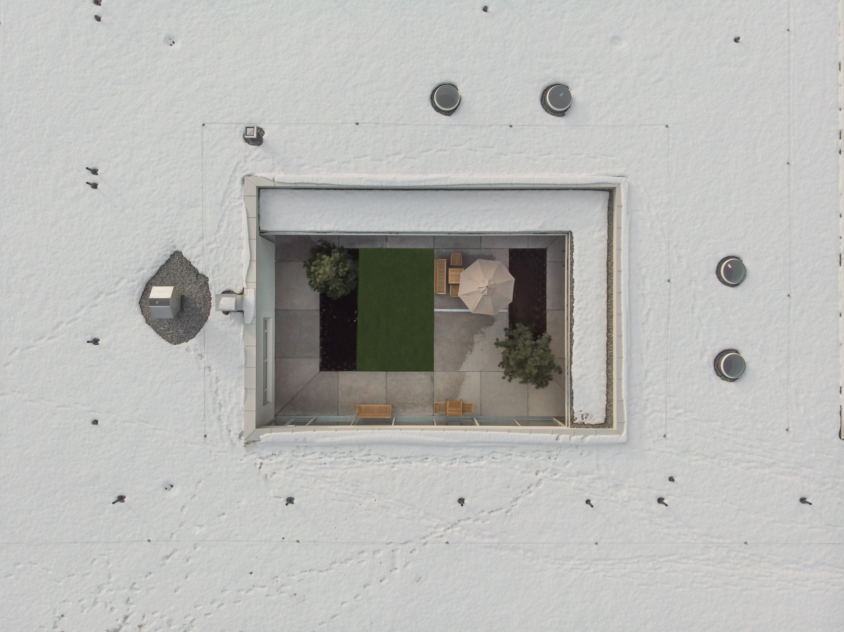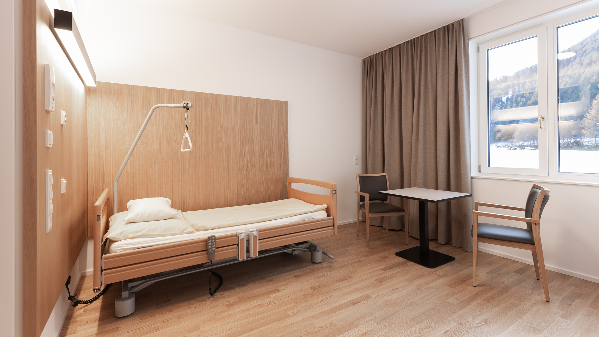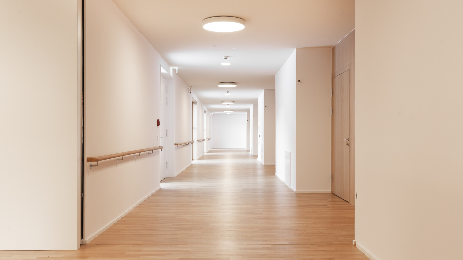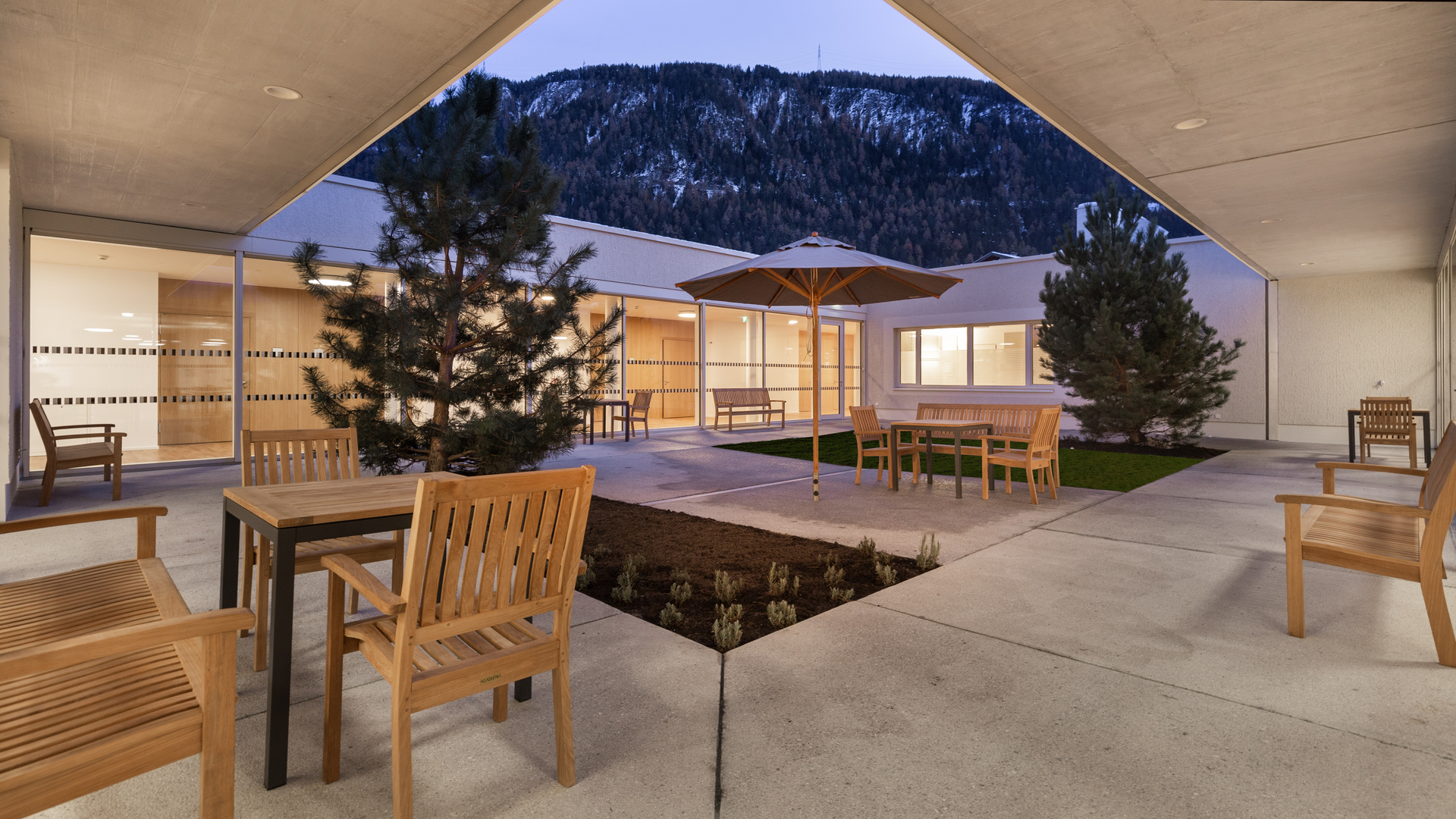 Grundgedanke des von ROECK Architekten entwickelten Konzepts war es, ein barrierefreies Gebäude zu entwickeln, dass auf die Anforderungen und Bedürfnisse der Bewohner:innen eingeht und ihnen dabei hilft, ihren Alltag zu bewältigen. Der auf einer Wiese errichtete eingeschoßige Neubau mit 33 gleichwertigen Einzelzimmern ist rund um einen großzügigen Innenhof organisiert. Sowohl die Fassaden als auch das Innere sind durch eine klare Formensprache und ein reduziertes Farbkonzept geprägt. Verschiedene Oberflächen, die Kombination von harmonischen Farben und der Einsatz von heimischen Hölzern tragen dazu bei, dass die Bewohner:innen und Mitarbeiter:innen in einer familiären und freundlichen Atmosphäre leben und arbeiten können. Zwischen neuem und altem Trakt entstand außerdem eine zentrale Eingangshalle mit einem Tagescafé als Treffpunkt.