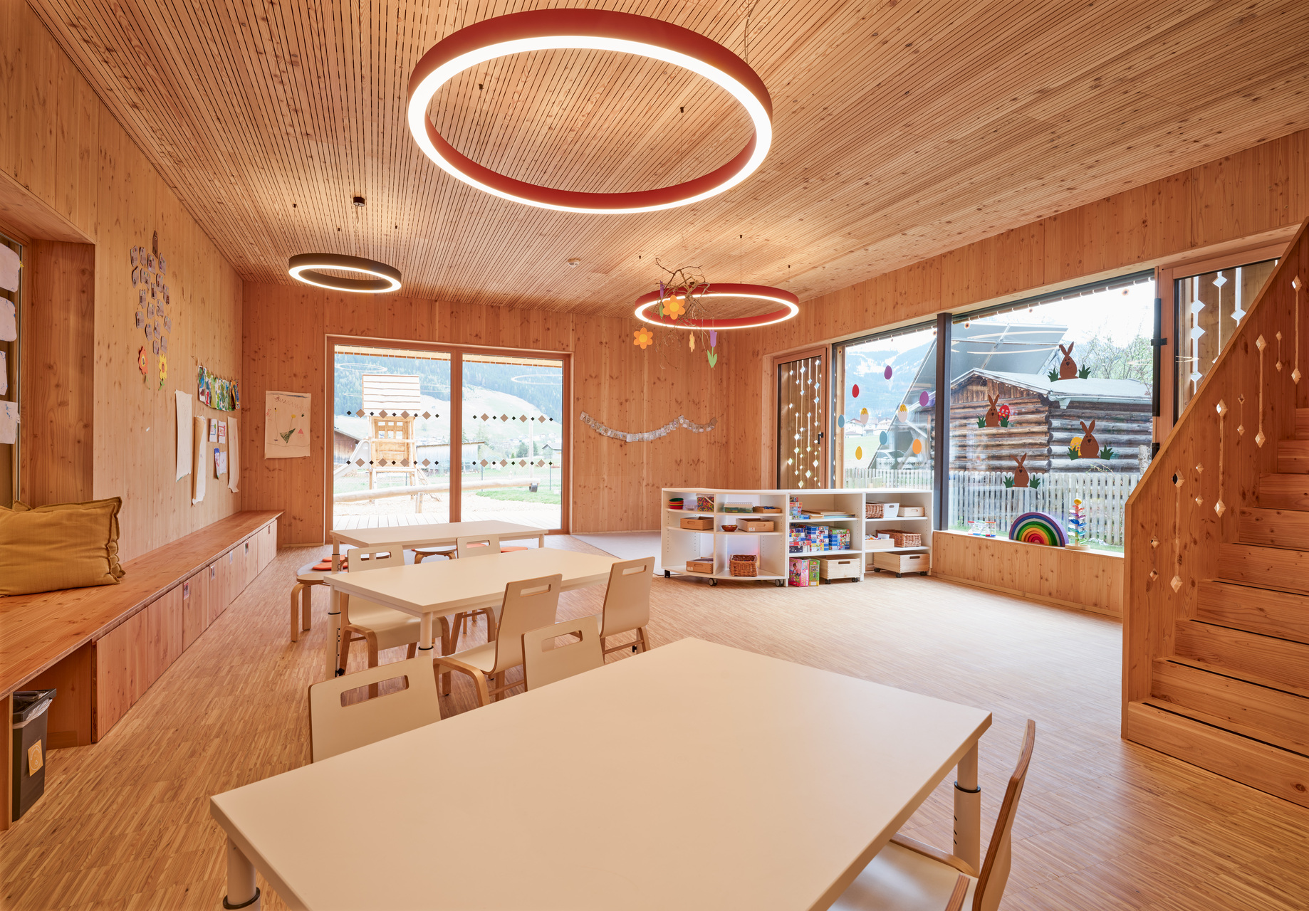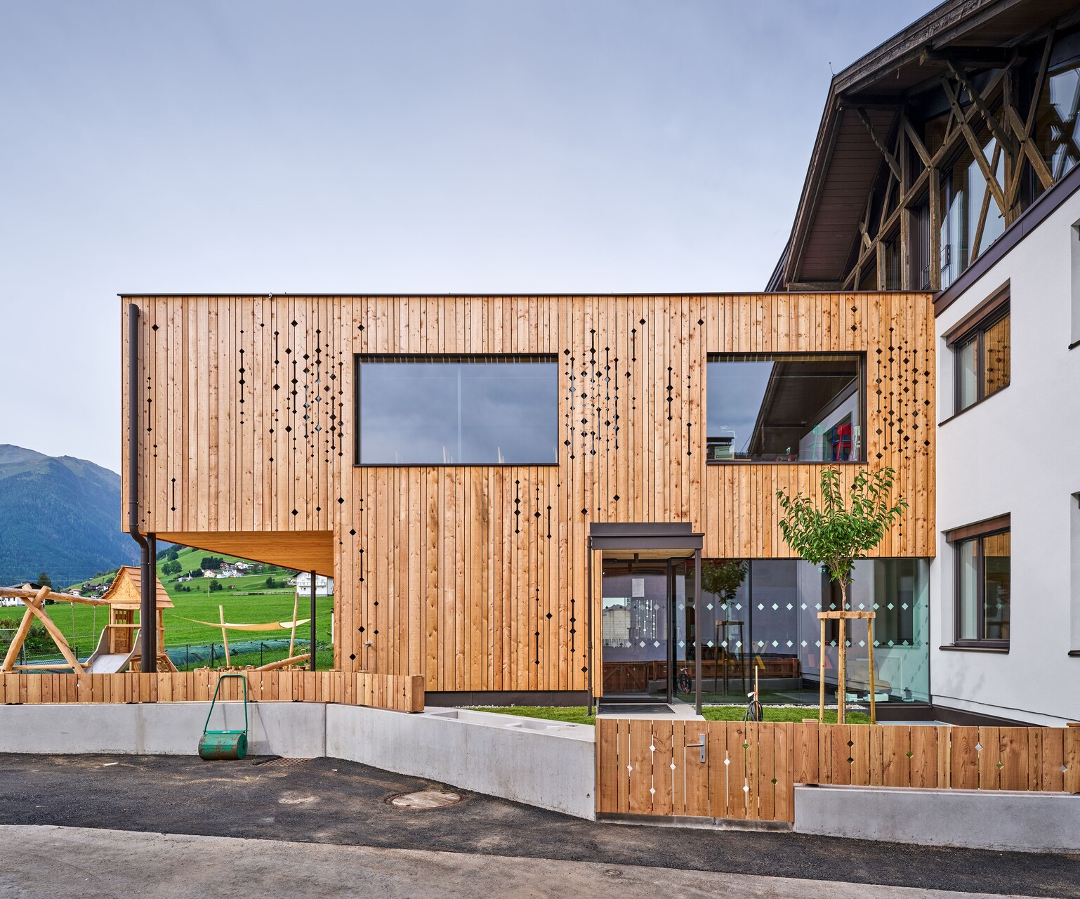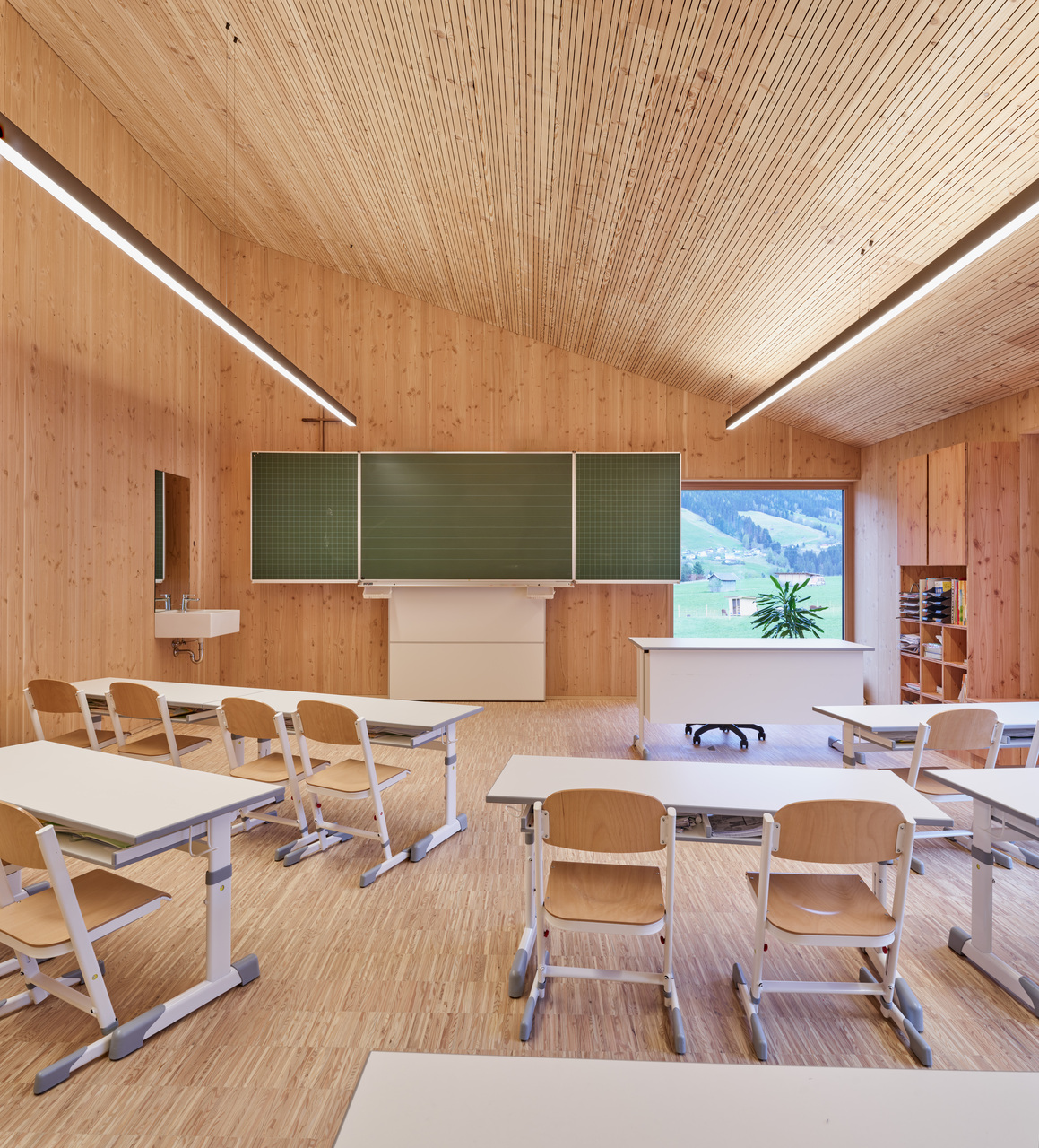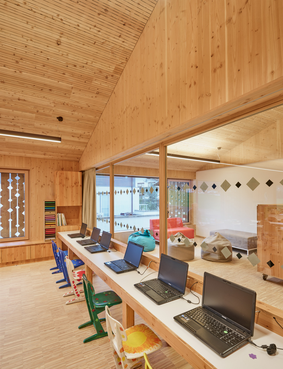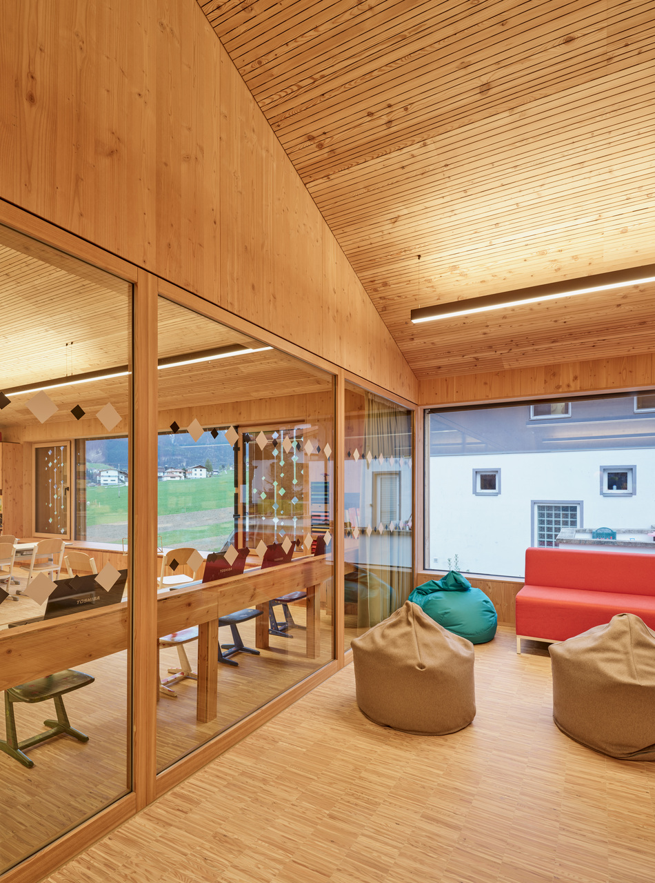 Die Zugänge zu Volksschule und Kindergarten bzw. Kinderkrippe wurden entflochten – die Kleinkinder kommen nun durch einen Vorgarten von Norden her ins Gebäude, wo ein moderner „Dorfbrunnen“ die Verbindung zum öffentlichen Raum herstellt, die Volksschulkinder betreten das Haus durch den ursprünglichen Eingang im Süden und werden in den ersten Stock weitergeleitet. Die beiden Einheiten sind auf diese Weise organisatorisch klar getrennt und erhalten ihre jeweils passenden, intimen und wohnlichen Raumsituationen. Im Erdgeschoss sind dies je ein Gruppenraum für Kindergarten und Krippe sowie ein kleiner Bereich für den Mittagstisch. Die Räume im Zubau orientieren sich zur überdachten Terrasse und zum Garten hin, hinter dem bereits die landwirtschaftlichen Freiflächen und die Natur am Ortsrand beginnen. Im 1. Obergeschoss liegen die zwei Klassenzimmer für den altersübergreifenden Unterricht mit einer gemeinsamen offenen Lernzone, ein flexibler Zusatzraum, der zukünftiges Wachstum ermöglicht, die Direktion und das Lehrerzimmer. Luftige, helle Räume mit durchgängig hölzernen Oberflächen in Lärche bieten eine angenehme Lern- und Lehratmosphäre in diesem kleinen Schulhaus, das fast die Maßstäblichkeit eines Wohnhauses vermittelt.