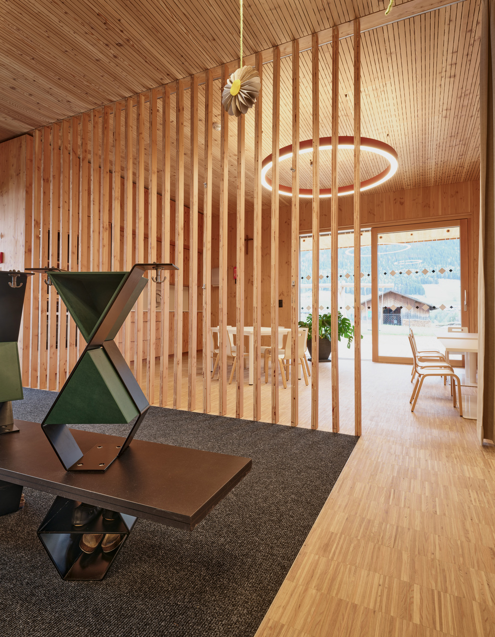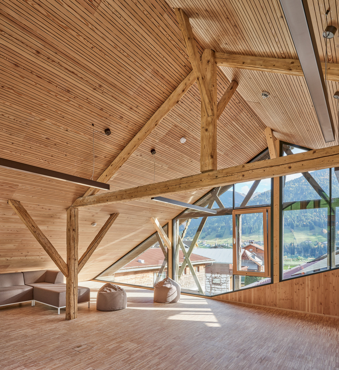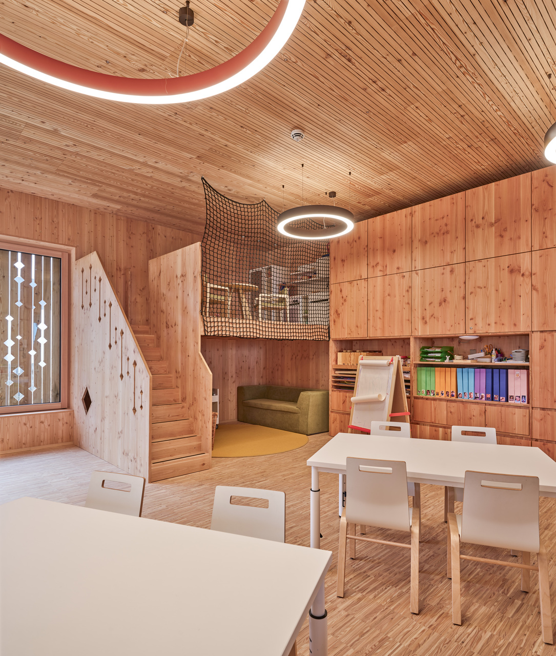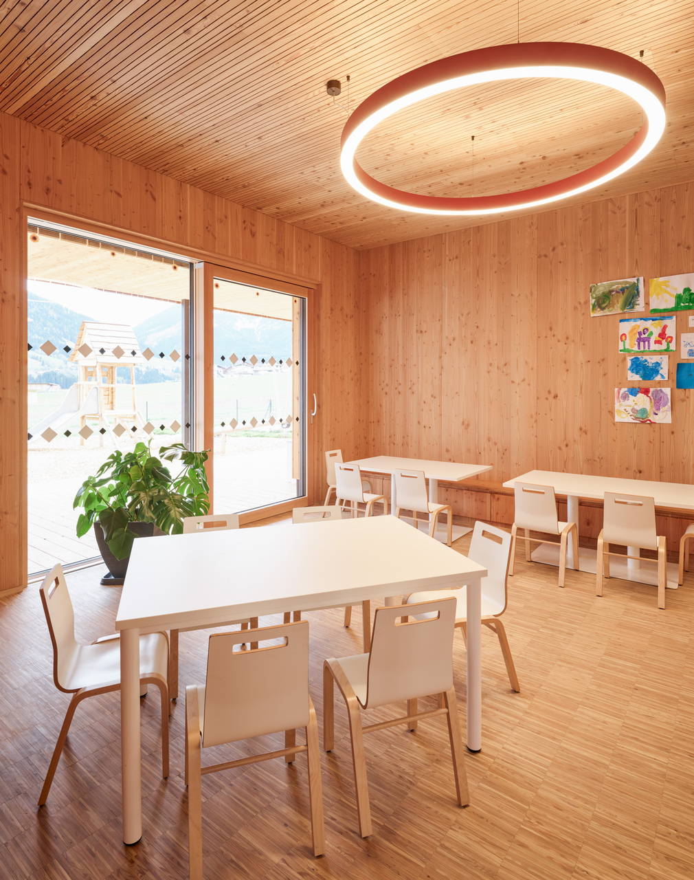 Die Zugänge zu Volksschule und Kindergarten bzw. Kinderkrippe wurden entflochten – die Kleinkinder kommen nun durch einen Vorgarten von Norden her ins Gebäude, wo ein moderner „Dorfbrunnen“ die Verbindung zum öffentlichen Raum herstellt, die Volksschulkinder betreten das Haus durch den ursprünglichen Eingang im Süden und werden in den ersten Stock weitergeleitet. Die beiden Einheiten sind auf diese Weise organisatorisch klar getrennt und erhalten ihre jeweils passenden, intimen und wohnlichen Raumsituationen. Im Erdgeschoss sind dies je ein Gruppenraum für Kindergarten und Krippe sowie ein kleiner Bereich für den Mittagstisch. Die Räume im Zubau orientieren sich zur überdachten Terrasse und zum Garten hin, hinter dem bereits die landwirtschaftlichen Freiflächen und die Natur am Ortsrand beginnen. Im 1. Obergeschoss liegen die zwei Klassenzimmer für den altersübergreifenden Unterricht mit einer gemeinsamen offenen Lernzone, ein flexibler Zusatzraum, der zukünftiges Wachstum ermöglicht, die Direktion und das Lehrerzimmer. Luftige, helle Räume mit durchgängig hölzernen Oberflächen in Lärche bieten eine angenehme Lern- und Lehratmosphäre in diesem kleinen Schulhaus, das fast die Maßstäblichkeit eines Wohnhauses vermittelt.