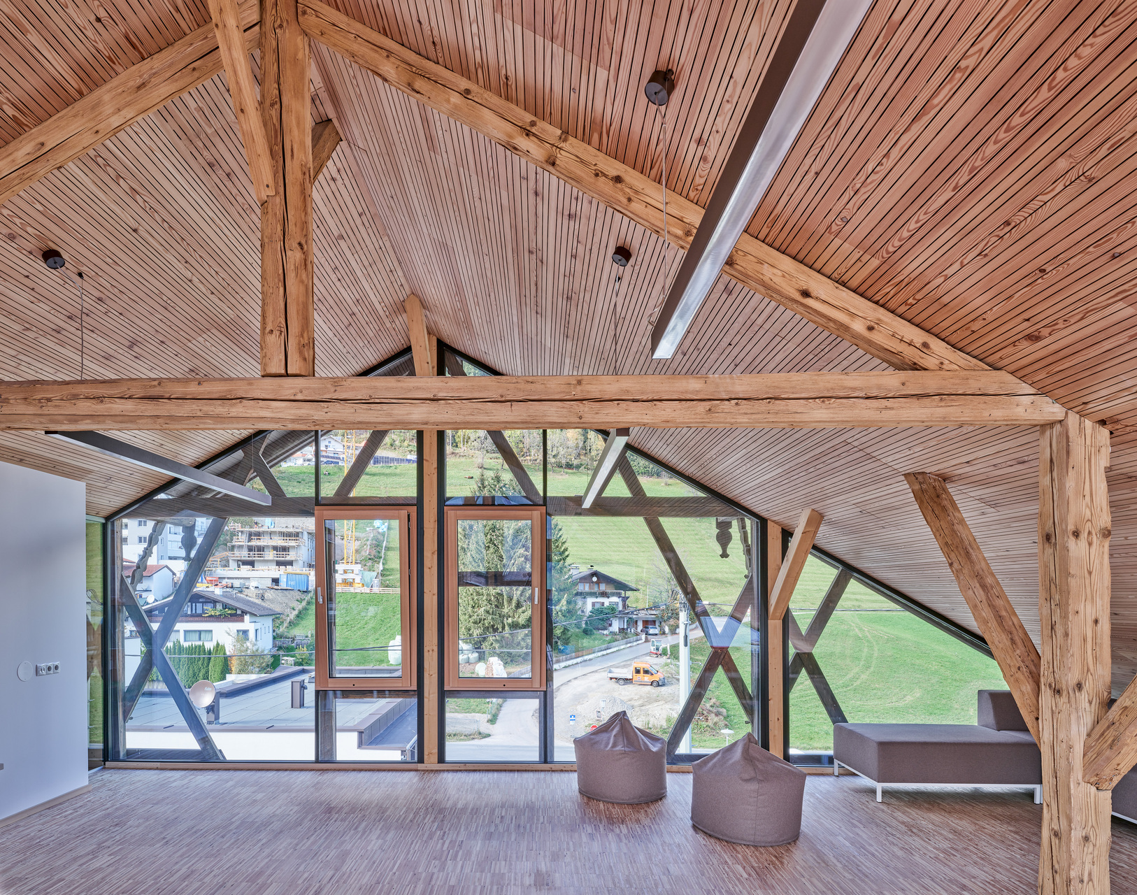 Im Dachgeschoss schließlich bekommt die ländliche Schule ohne große bauliche Eingriffe ein zusätzliches „Wohnzimmer“. Der bisher ungenutzte Dachboden wurde geöffnet, das alte Gebälk gereinigt und die Giebelwand durch Glas ersetzt. Entstanden ist ein gemütlicher Raum ohne festgelegten Zweck, der über die Häuser hinweg in die umgebende Natur blickt und für kleine Veranstaltungen, als Leseraum, oder Atelier genutzt werden kann. Durch ein Weiterbauen am Bestand wurde in kleinem Maßstab Baukultur erhalten und klug weiterentwickelt. (Text: Nicola Weber)