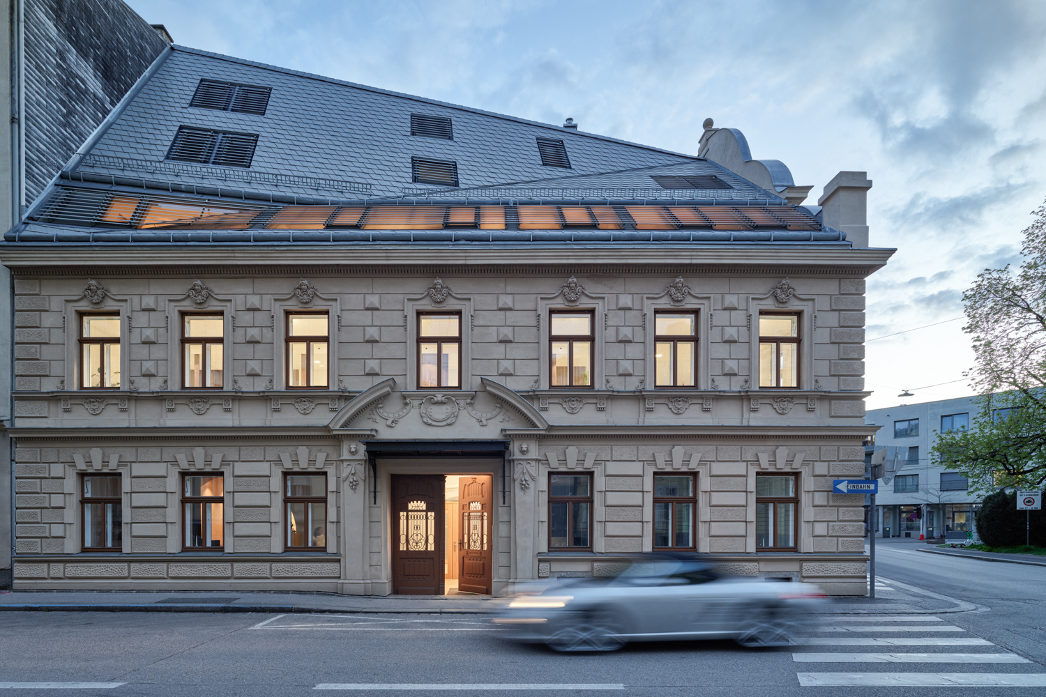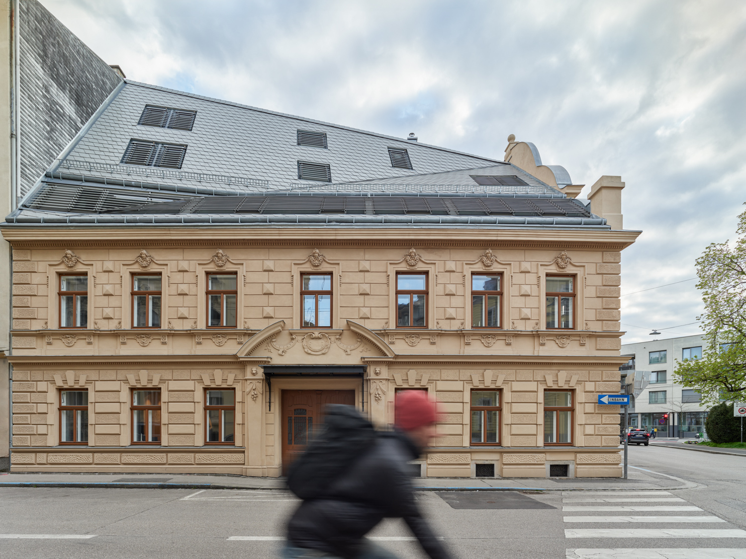 Der neue Aufbau nimmt die Traufe längs der Volksgartenstraße als Ausgangshöhe, setzt hinter dem geschwungenen Giebelfeld am Auerspergplatz an und entwickelt die Firstlinie bis zur Höhe des Nachbarhauses, womit sich hofseitig ein Vollgeschoss mit entsprechenden Freiräumen in Form von Balkonen realisieren ließ. Straßenseitig gewährleistet ein durchgehendes Fensterband optimalen Lichteinfall für die erste Dachgeschossebene. Sowohl das Fensterband als auch die in spezieller Konstruktion vertieft eingebauten Dachfenster sind mit Lamellen bedeckt, die bündig mit der kleinteiligen Eternitdeckung abschließen. Die hofseitige Dachbekleidung in Blech wird durch lose gesetzte Fenster perforiert und bis zu den Schiebetürelementen des zweiten Obergeschosses als hinterlüftete Fassade weitergeführt.