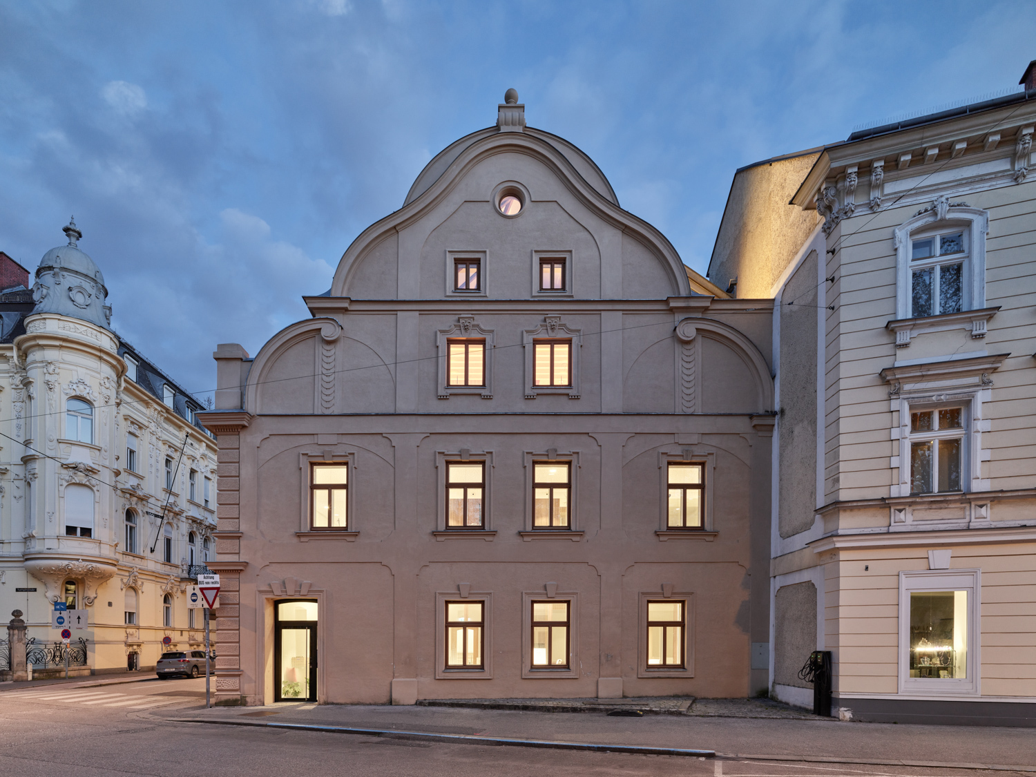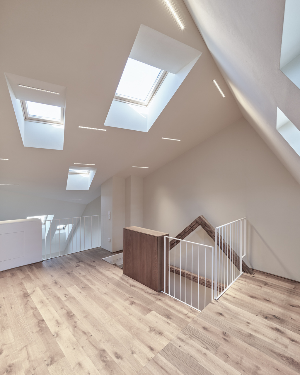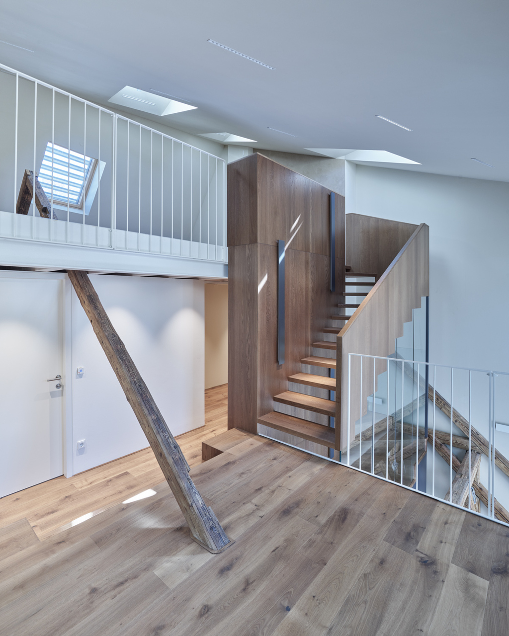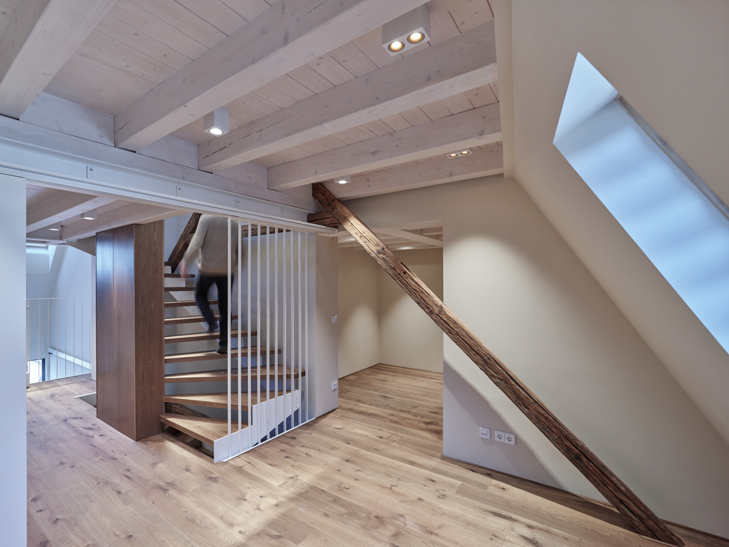 In den beiden Bestandsgeschossen entstanden offene Bürostrukturen zur Eigennutzung durch den Eigentümer und im neu aufgebauten Dachgeschoss drei unkonventionell zugeschnittene Wohnungen, die sich über zwei bis drei Geschosse mit großzügigen Galerieebenen in den Dachraum entwickeln. Glaswände ermöglichen die transparente Unterteilung in Einzel- und Doppelbüros und machen gemeinsam mit den raumhohen, 180 Grad öffenbaren Türen den entkernten Altbestand erlebbar. Einzelne Besprechungsboxen schaffen Rückzugsmöglichkeit und verbessern durch Bekleidung mit Schallschutzlamellen die Raumakustik. Für größere Besprechungen, für Pausen oder nach der Arbeit bietet sich der Cafebereich im Erdgeschoss an – eine leise Reminiszenz an den „Gasthof zum Stadtgut“, der hier einst beherbergt war. (Text: Tobias Hagleitner, nach einem Text der Architekten)
