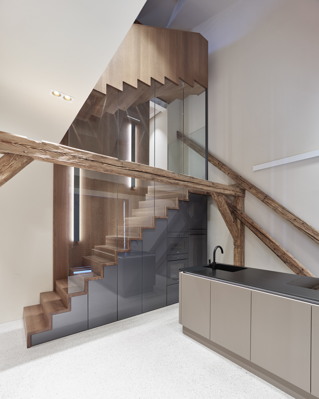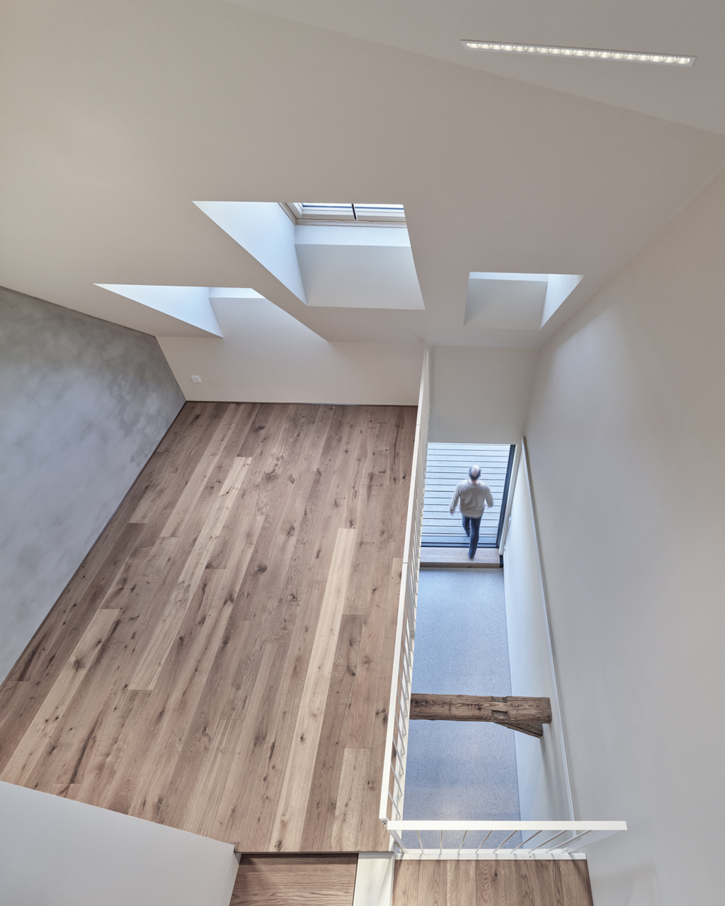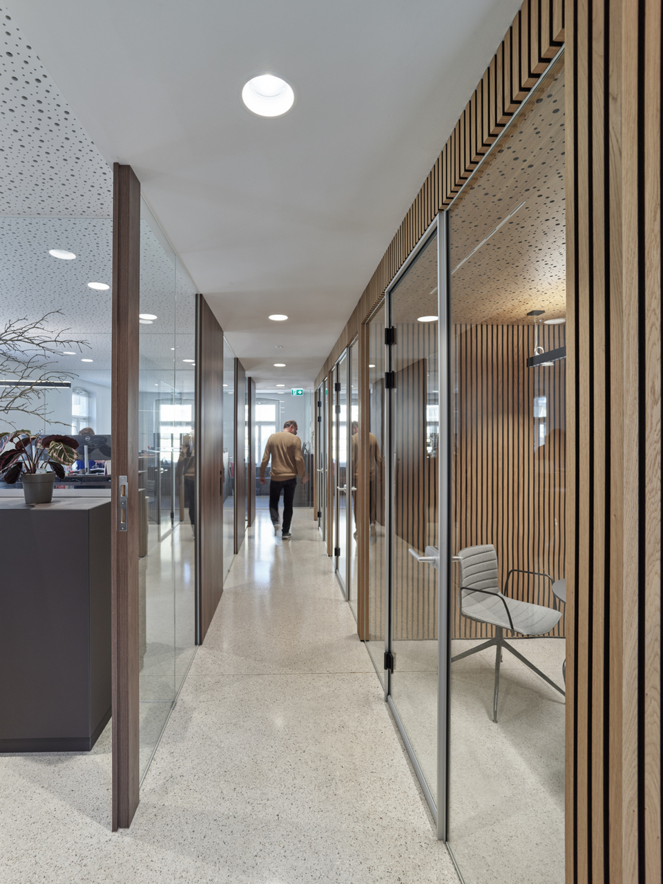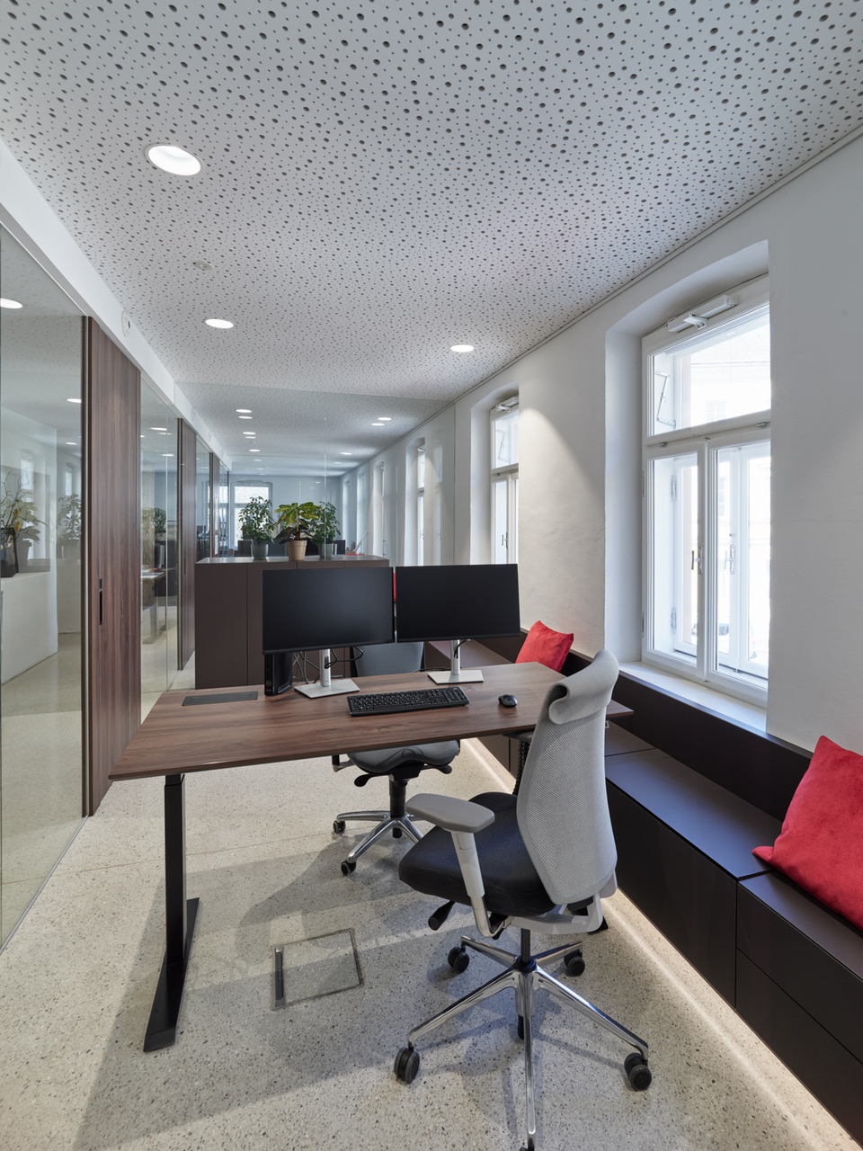 In den beiden Bestandsgeschossen entstanden offene Bürostrukturen zur Eigennutzung durch den Eigentümer und im neu aufgebauten Dachgeschoss drei unkonventionell zugeschnittene Wohnungen, die sich über zwei bis drei Geschosse mit großzügigen Galerieebenen in den Dachraum entwickeln. Glaswände ermöglichen die transparente Unterteilung in Einzel- und Doppelbüros und machen gemeinsam mit den raumhohen, 180 Grad öffenbaren Türen den entkernten Altbestand erlebbar. Einzelne Besprechungsboxen schaffen Rückzugsmöglichkeit und verbessern durch Bekleidung mit Schallschutzlamellen die Raumakustik. Für größere Besprechungen, für Pausen oder nach der Arbeit bietet sich der Cafebereich im Erdgeschoss an – eine leise Reminiszenz an den „Gasthof zum Stadtgut“, der hier einst beherbergt war. (Text: Tobias Hagleitner, nach einem Text der Architekten)
