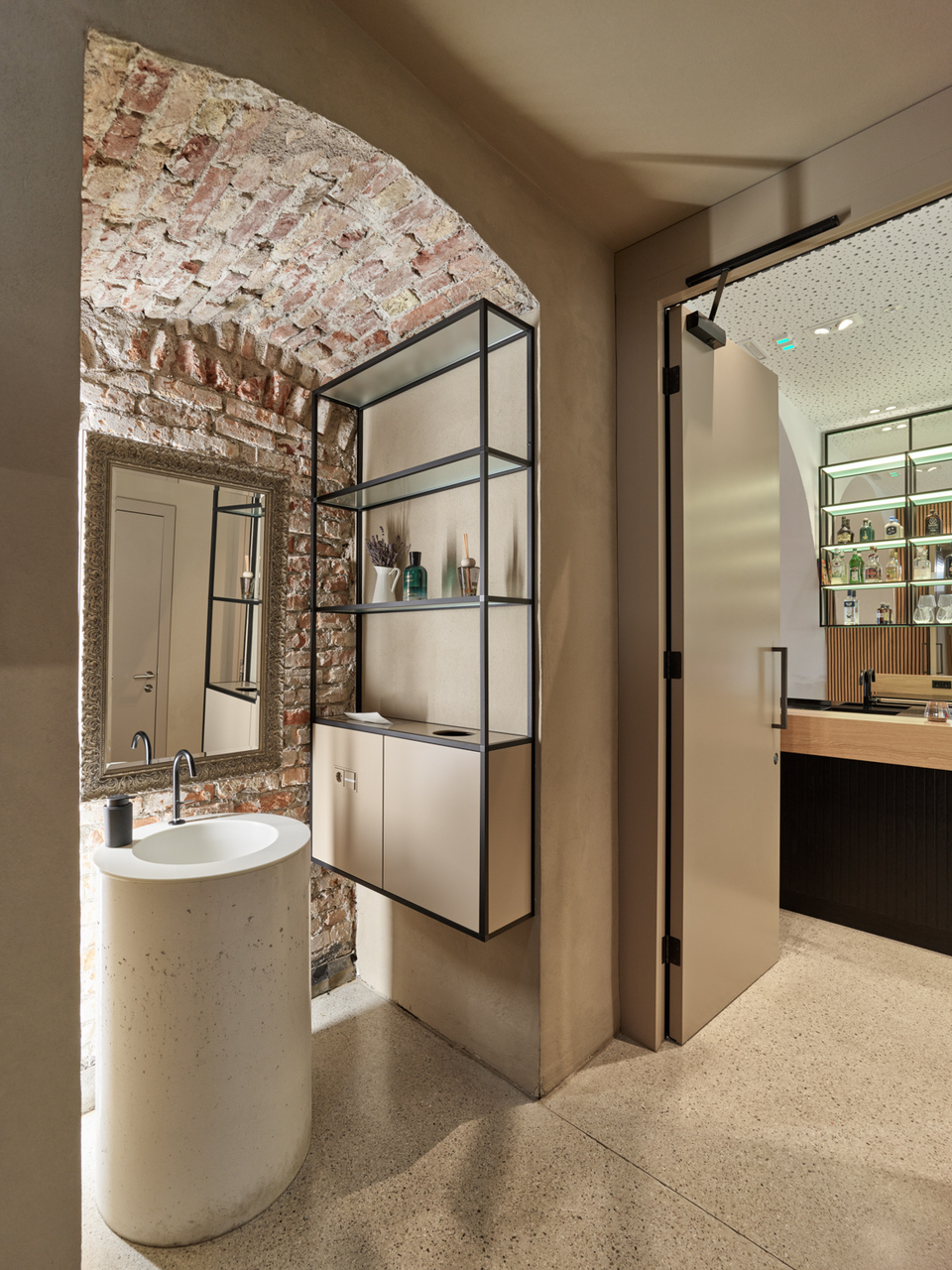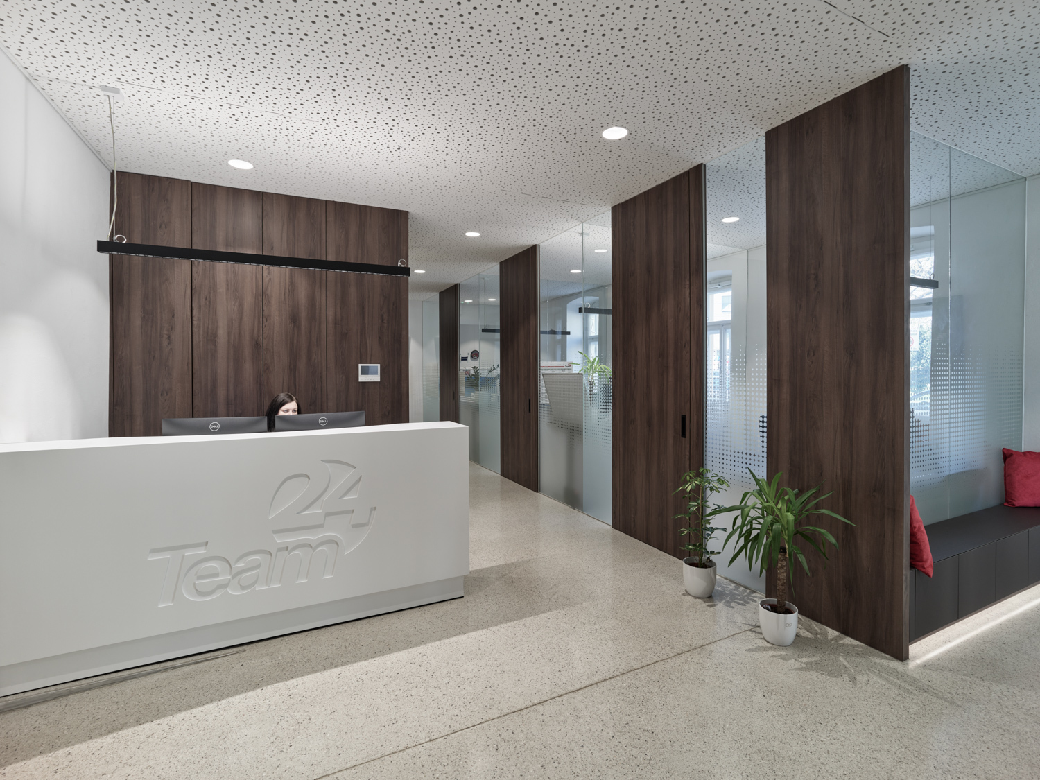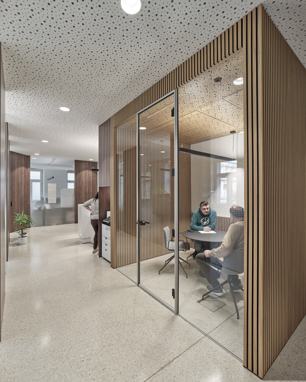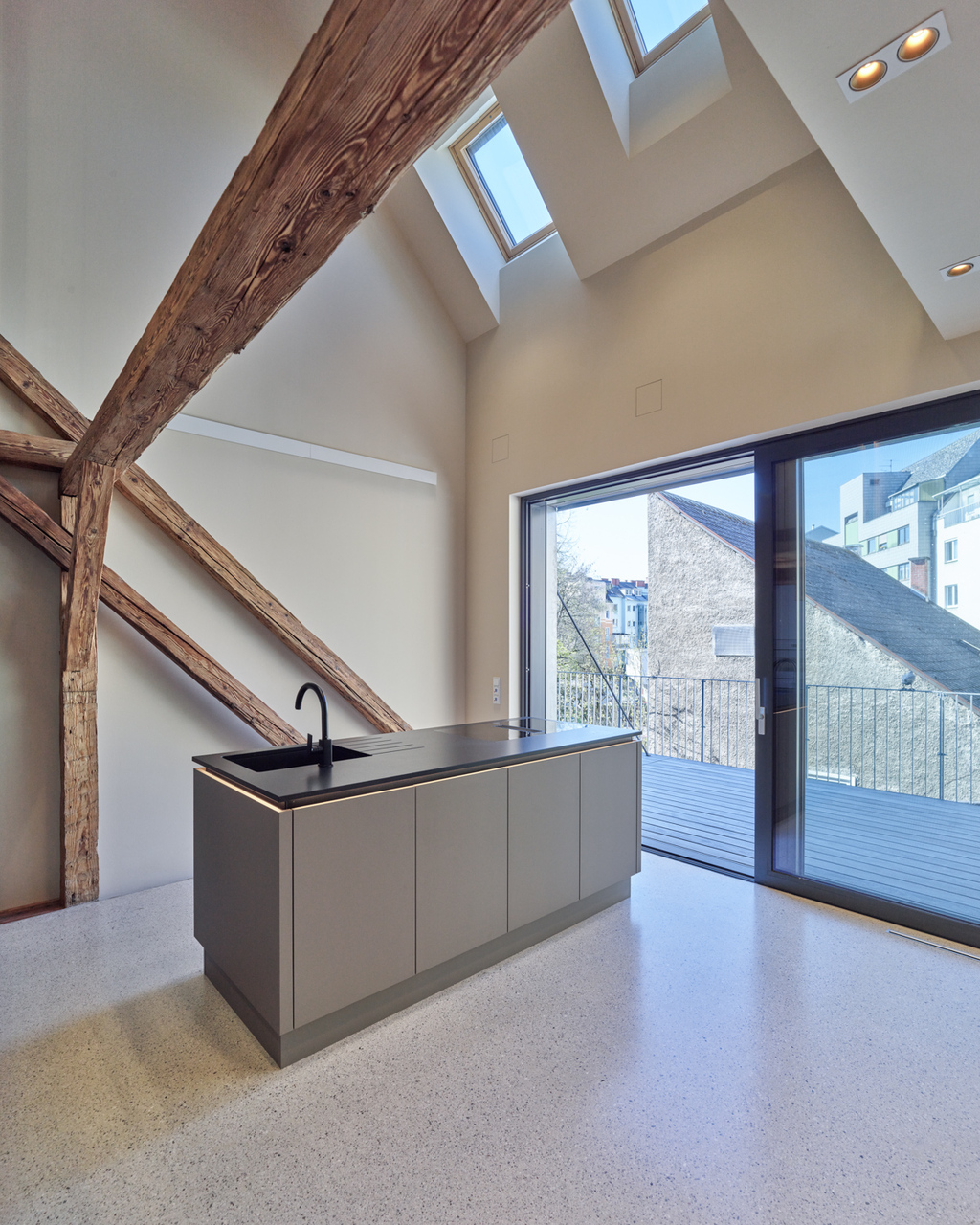 In den beiden Bestandsgeschossen entstanden offene Bürostrukturen zur Eigennutzung durch den Eigentümer und im neu aufgebauten Dachgeschoss drei unkonventionell zugeschnittene Wohnungen, die sich über zwei bis drei Geschosse mit großzügigen Galerieebenen in den Dachraum entwickeln. Glaswände ermöglichen die transparente Unterteilung in Einzel- und Doppelbüros und machen gemeinsam mit den raumhohen, 180 Grad öffenbaren Türen den entkernten Altbestand erlebbar. Einzelne Besprechungsboxen schaffen Rückzugsmöglichkeit und verbessern durch Bekleidung mit Schallschutzlamellen die Raumakustik. Für größere Besprechungen, für Pausen oder nach der Arbeit bietet sich der Cafebereich im Erdgeschoss an – eine leise Reminiszenz an den „Gasthof zum Stadtgut“, der hier einst beherbergt war. (Text: Tobias Hagleitner, nach einem Text der Architekten)