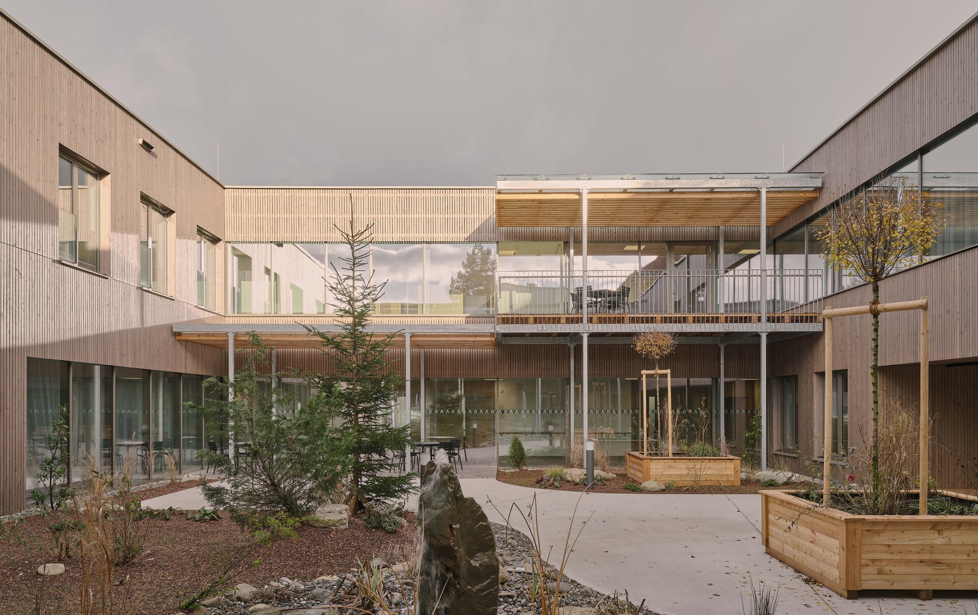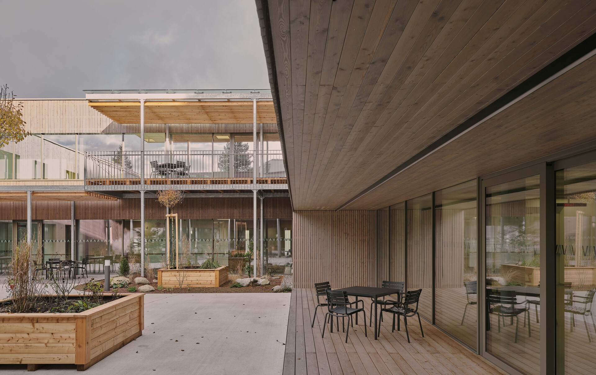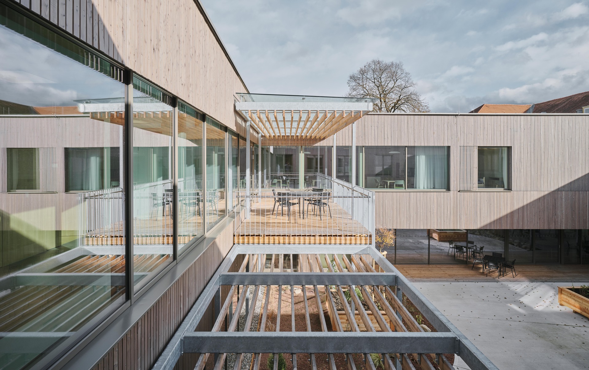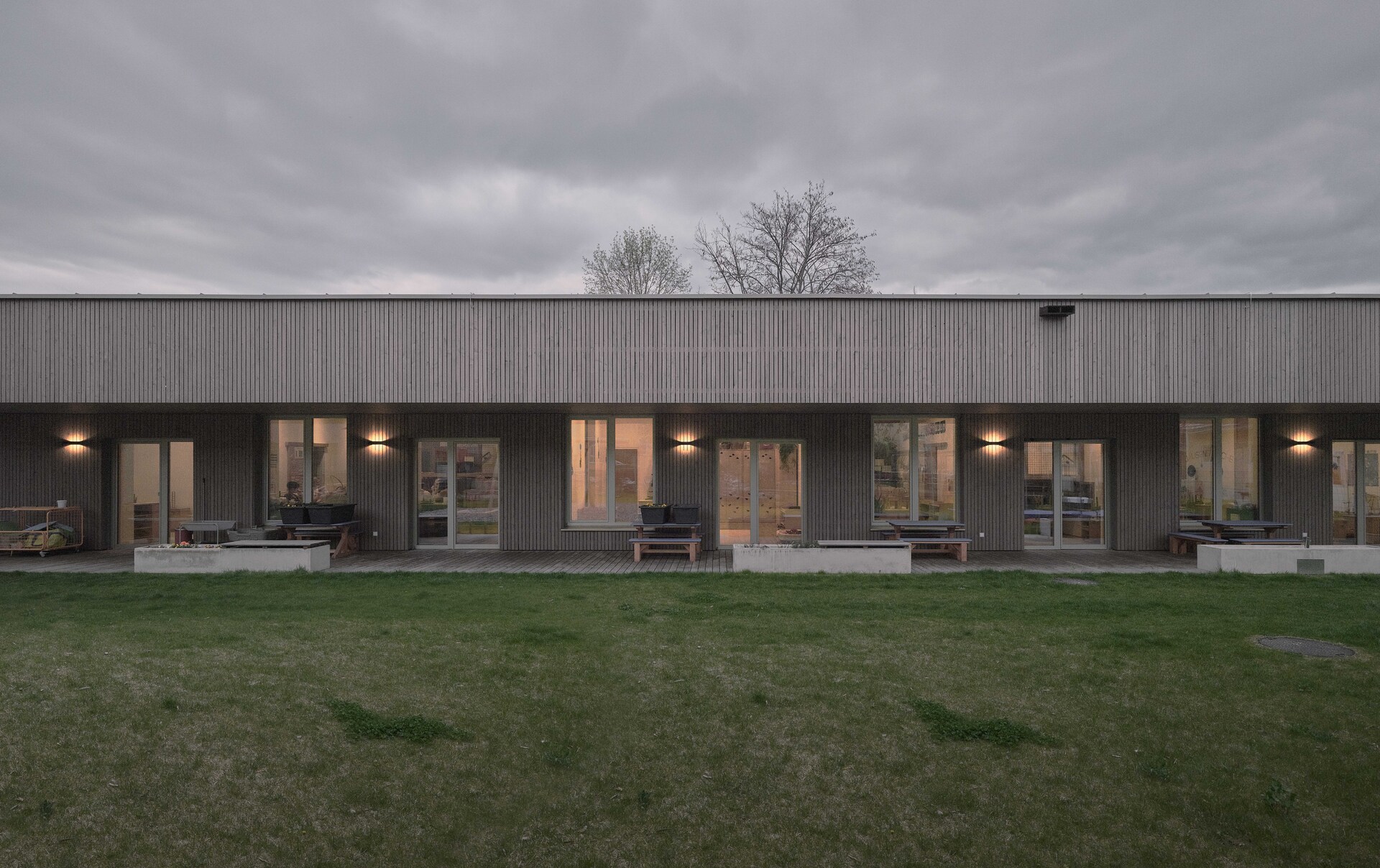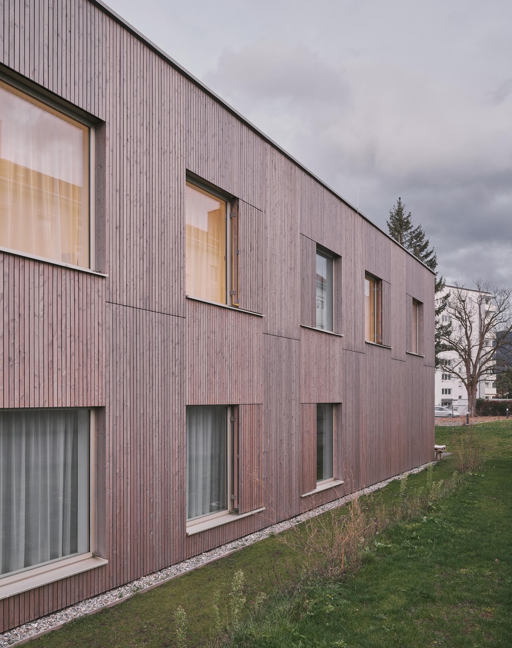 Der Charakter der Fassaden bildet durch subtile, gestalterische Eingriffe und die einheitliche Ausführung in Lärchenholz ein kohärentes Bild. Die Ansicht der Neubauten schafft zum einen mit durchlässigen Fassadenelementen ein spannendes Schattenspiel bei Nacht und zitiert zum anderen den regelmäßigen Rhythmus des Bestandes und bewirkt dadurch ein Zusammengehörigkeitsgefühl. Die Additionen sollen mit der Grundsubstanz nicht in Konkurrenz treten, sondern Offenheit und Harmonie einbringen. Großzügige Fensteröffnungen schaffen einen starken Außenraumbezug und laden durch Parapete in Sitzhöhe zum Verweilen ein. Sie dienen zudem als Ausgang und erweitern die Räumlichkeiten für Kommunikation und Gemeinschaft. So lebt es sich ganzjährig mit der Natur. (Text: Architekt:innen)