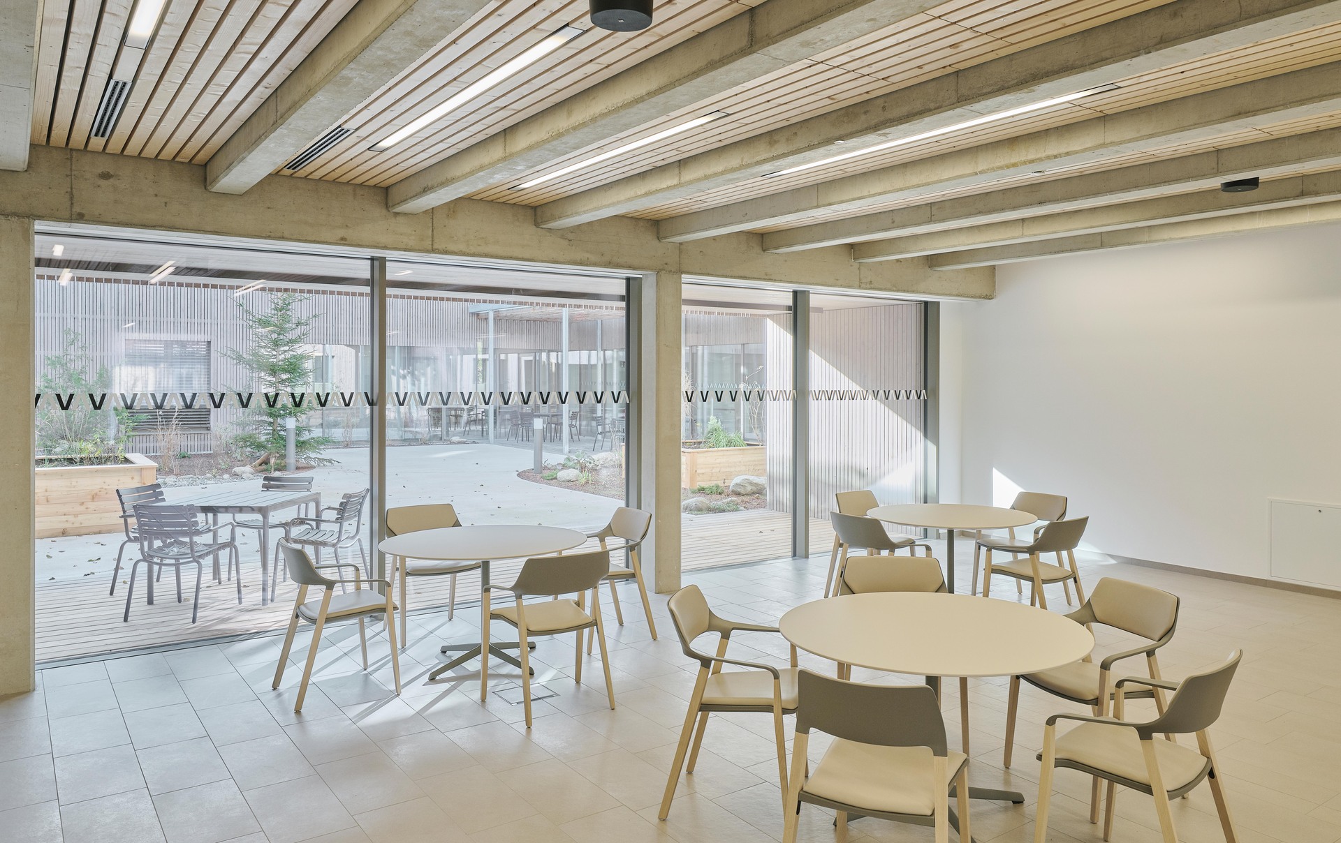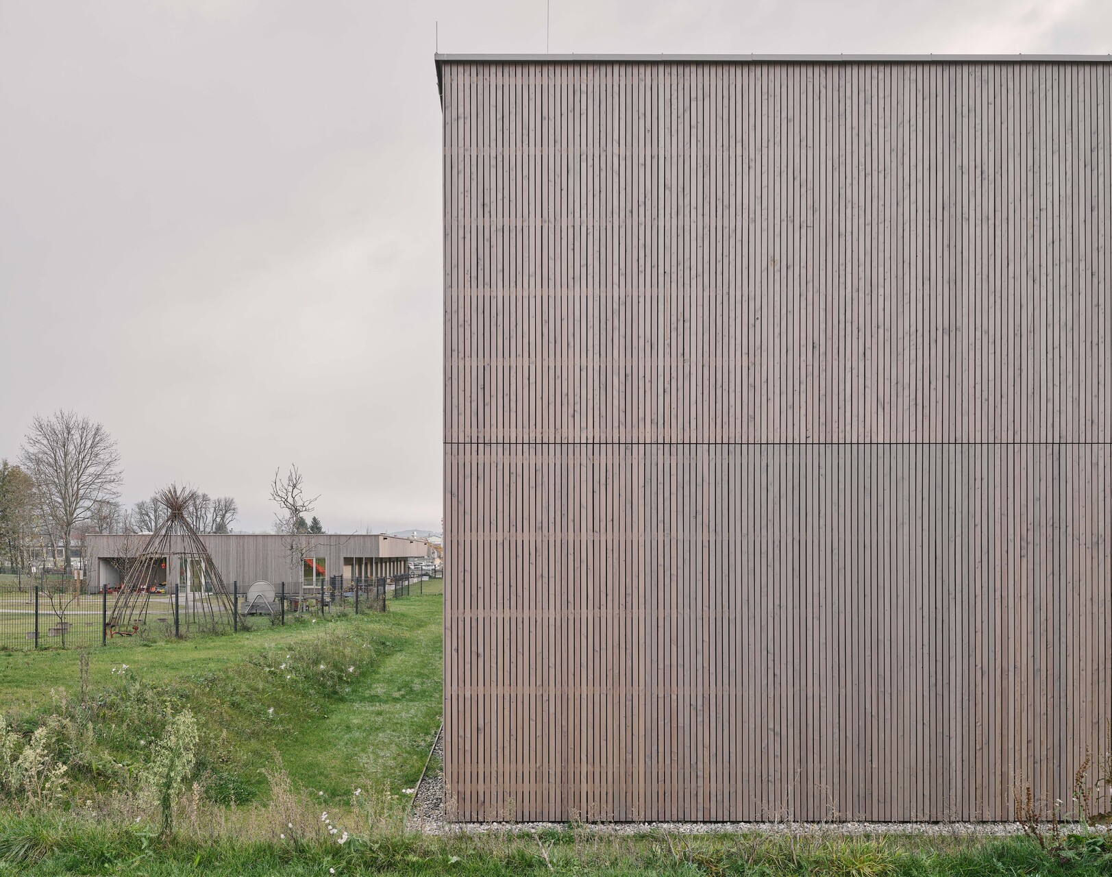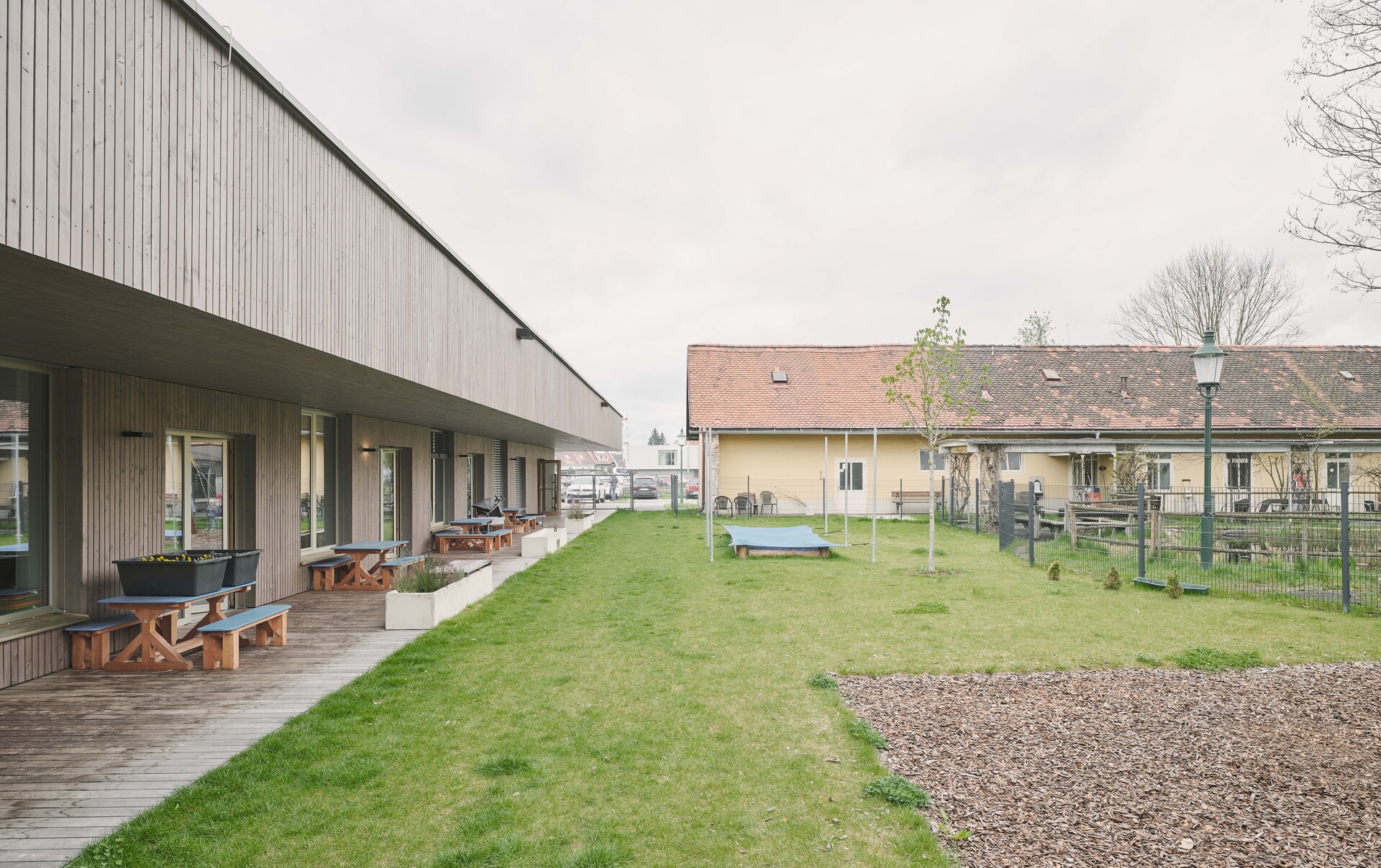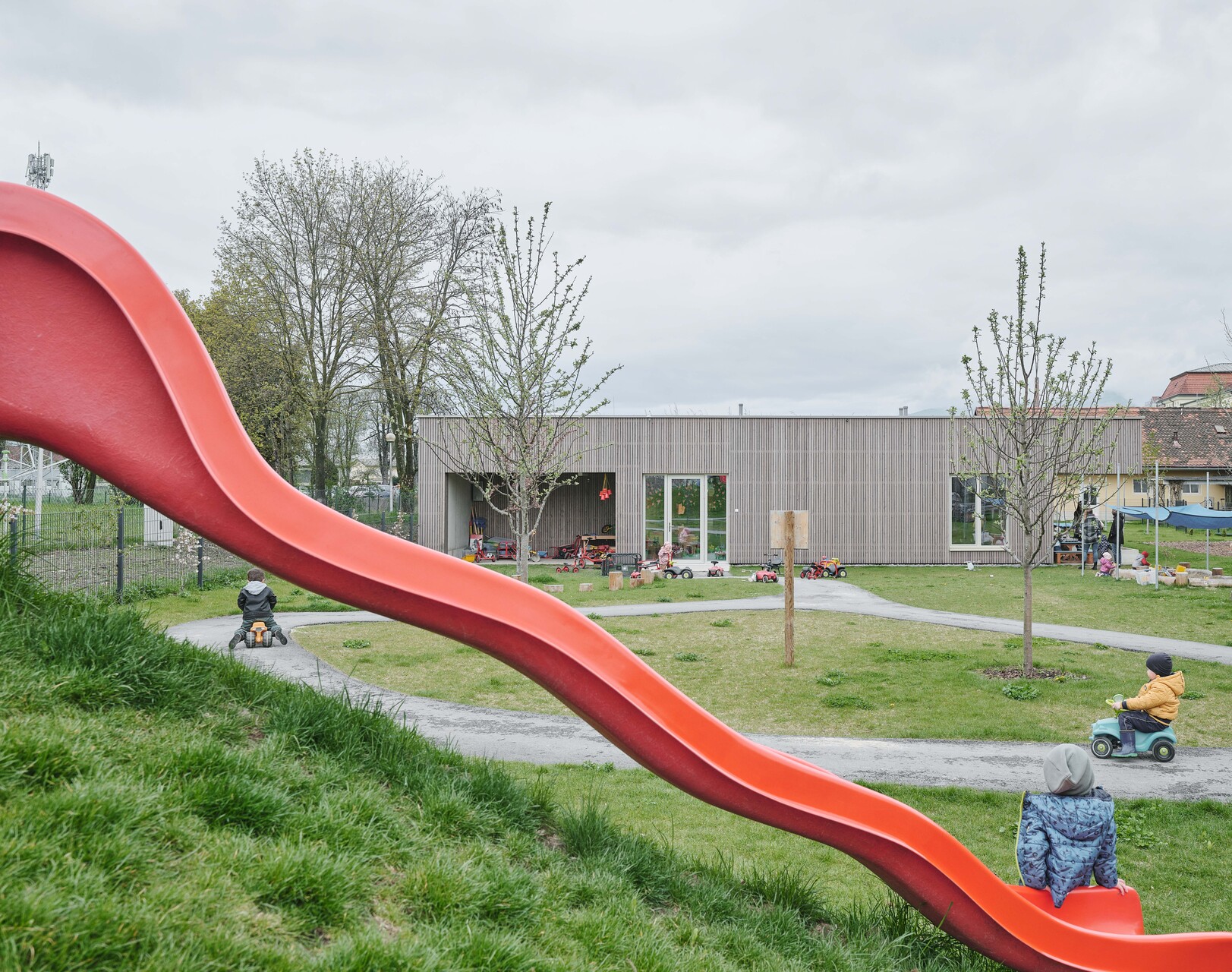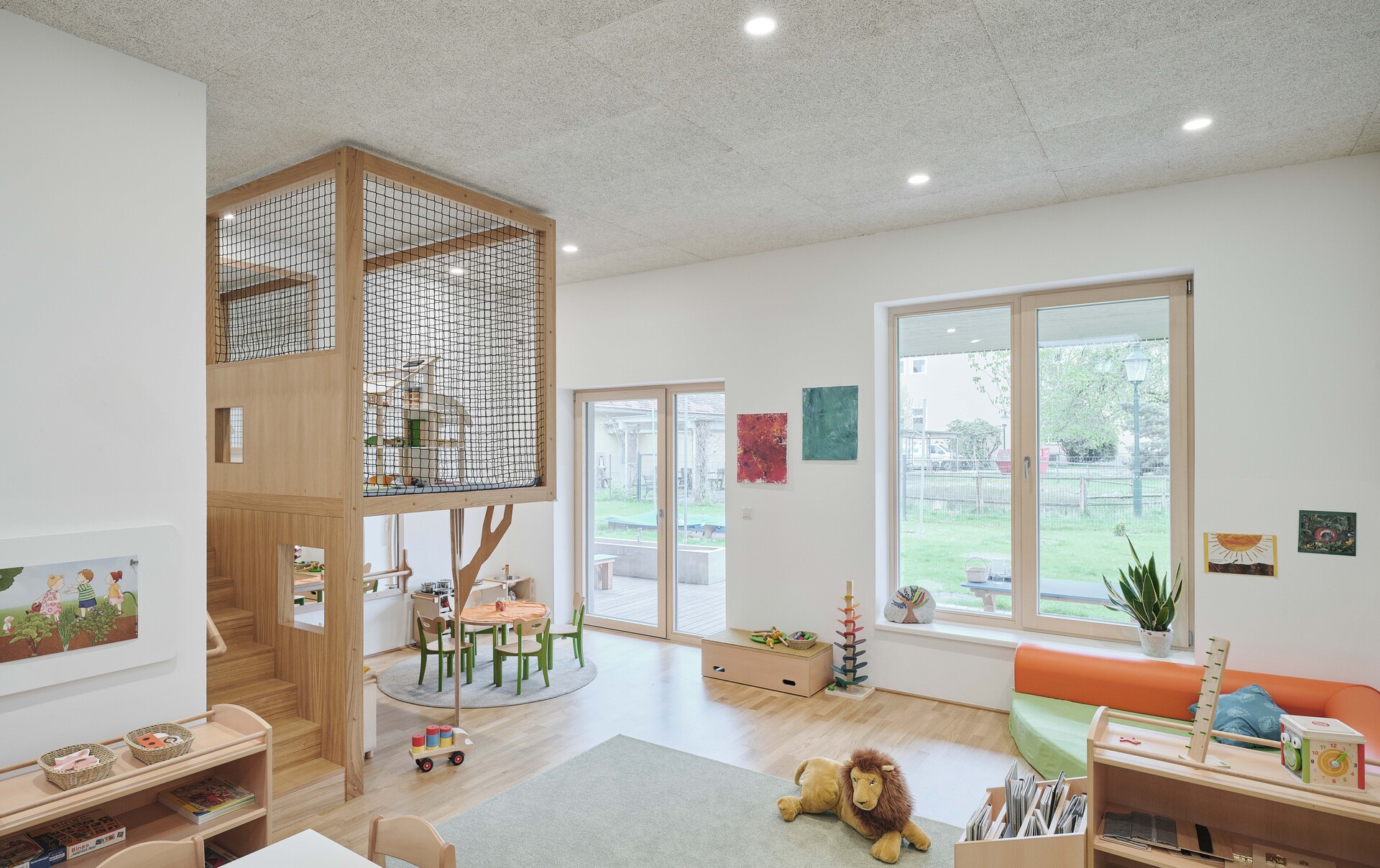 Das drei Gruppen umfassende Kinderbetreuungsangebot variiert von Kinderkrippengruppen bis Kindergartengruppen, welche in drei großzügigen lichtdurchfluteten Gruppenräumen untergebracht werden. Diese erhalten mit einer südlich umlaufenden, überdachten Veranda einen Schwellenraum und zusätzlichen Sonnenschutz. Die Funktionsbereiche befinden sich auf der nördlichen Seite des Riegels. Durch die Südorientierung ist die Kinderbetreuung der Nachbarschaft abgewandt, nimmt also eine introvertierte Haltung ein, ohne sich komplett zu verschließen.