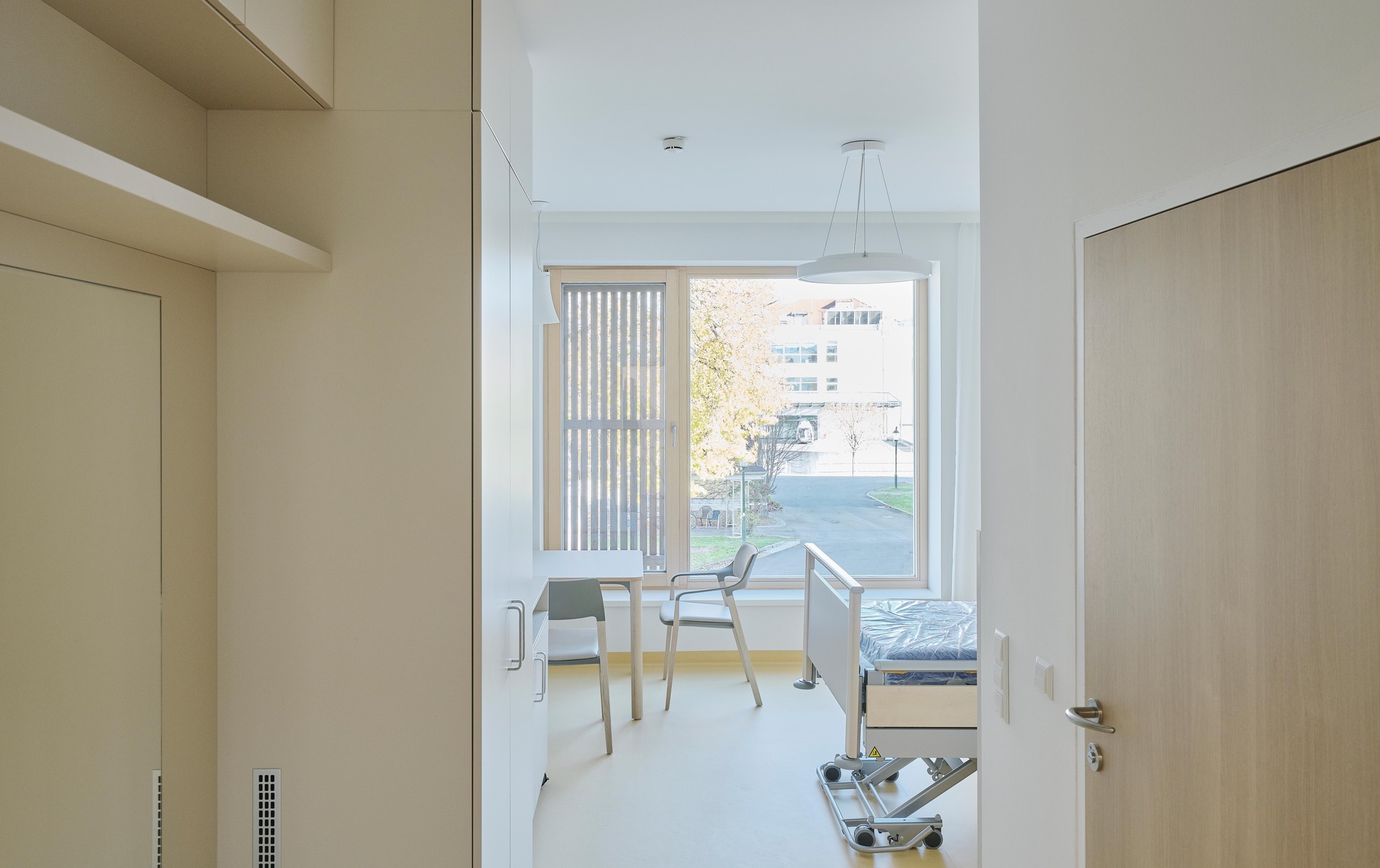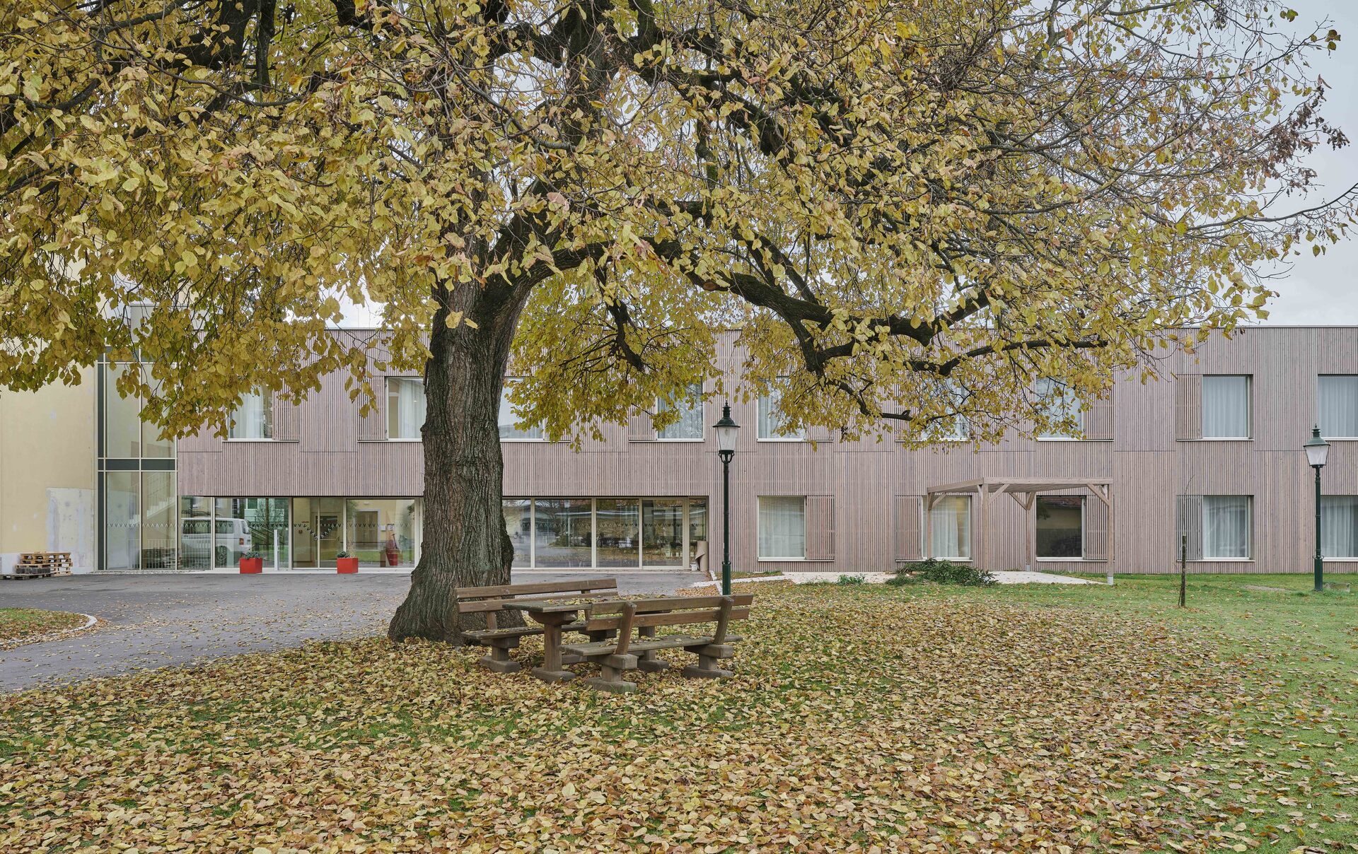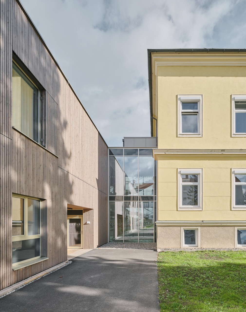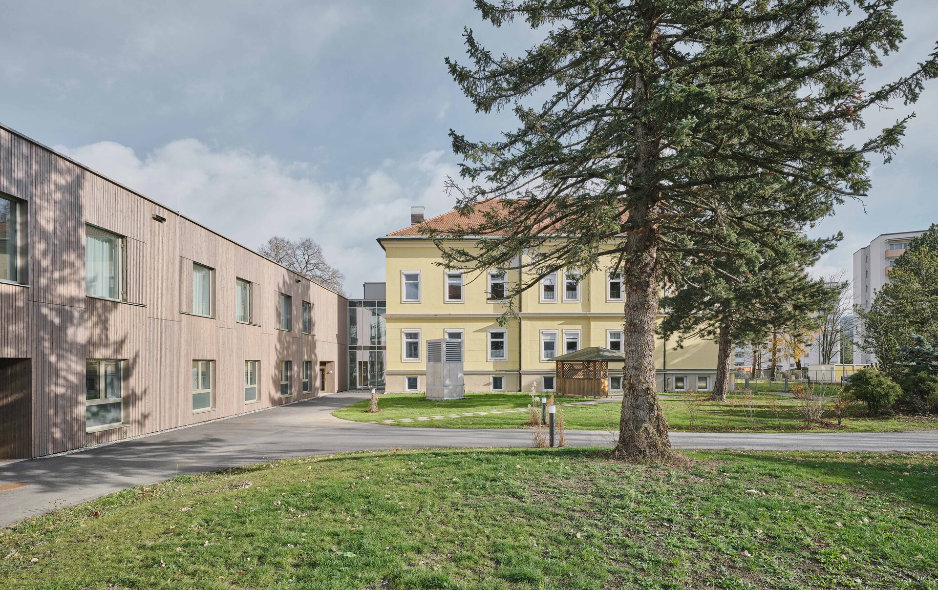 Die Gebäudeanordnung referenziert in seiner Grundform den weitläufig bekannten Vierkanthof, der am Grundstück klare Kanten markiert und differenzierte Außenräume festlegt. Positiv gesehen wird die öffentlichkeitswirksame Adresse des Bestandspflegeheims, welches nur durch minimale Eingriffe renoviert und um einen Zu- bzw. Neubau erweitert wurde. Der Schnittpunkt wurde als gläserne Fuge ausgebildet um von der gegebenen Substanz abzurücken und neue Synergien aus Altbestand und Neuerrichtung hervorzuheben. Der offene Zwischenraum markiert als einladende Geste den Eingang und fungiert im neuen Zustand als Verteiler.