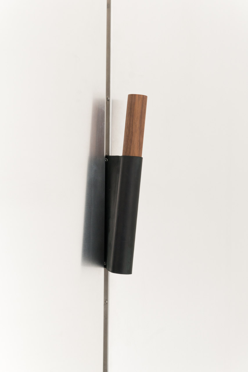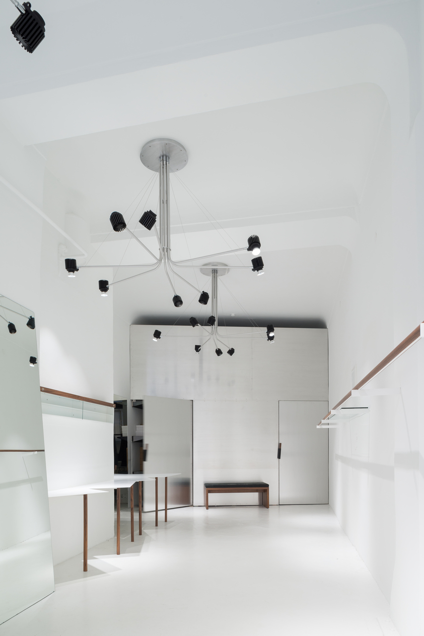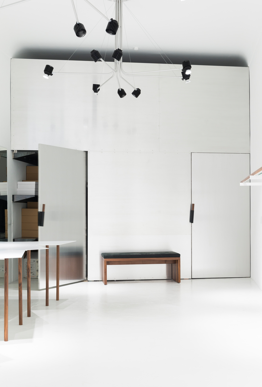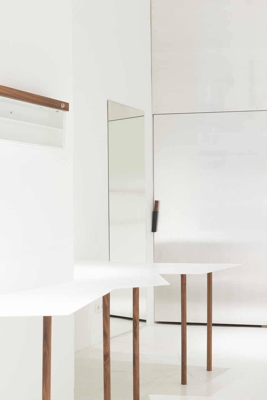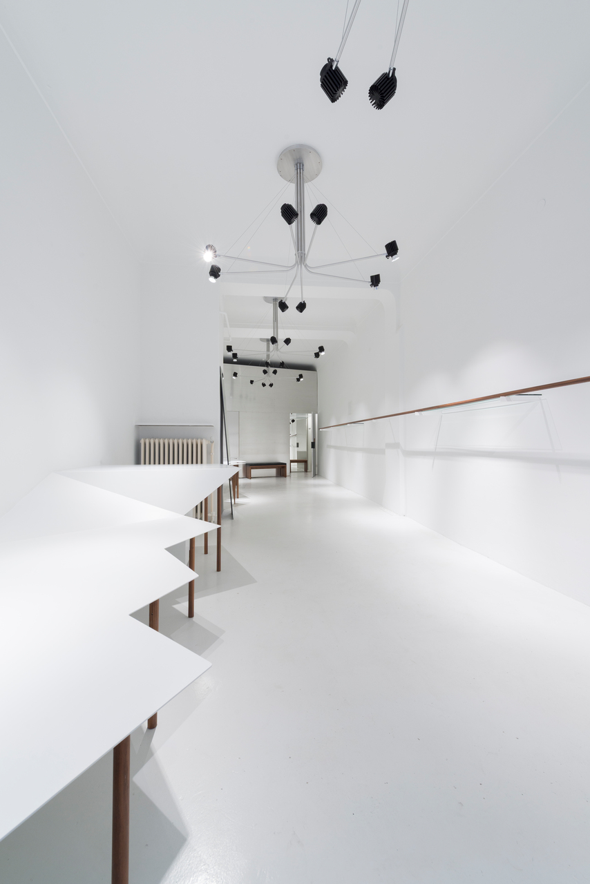 Klar ergab sich die Position der hölzernen Kleiderstange an der längsten, nicht unterbrochenen Wand. Die andere Seite, sollte möglichst viel „Legefläche“ auf Tischhöhe bieten. Sie war jedoch durch die Einengung, dem Platz der Kassa und dem einzigen, recht dominaten alten Heizkörper unterbrochen. Ein „Zick-Zack-Tisch“ - eine weiße Stahlplatte auf vielen dünnen Holzfüßchen - konnte dieses notwendige „Vor und Zurück“ lösen und einen Zusammenhang von vorne und hinten erzeugen. Gleichzeitig wurde so das „handmade in the alps“ fast logoartig vermittelt.