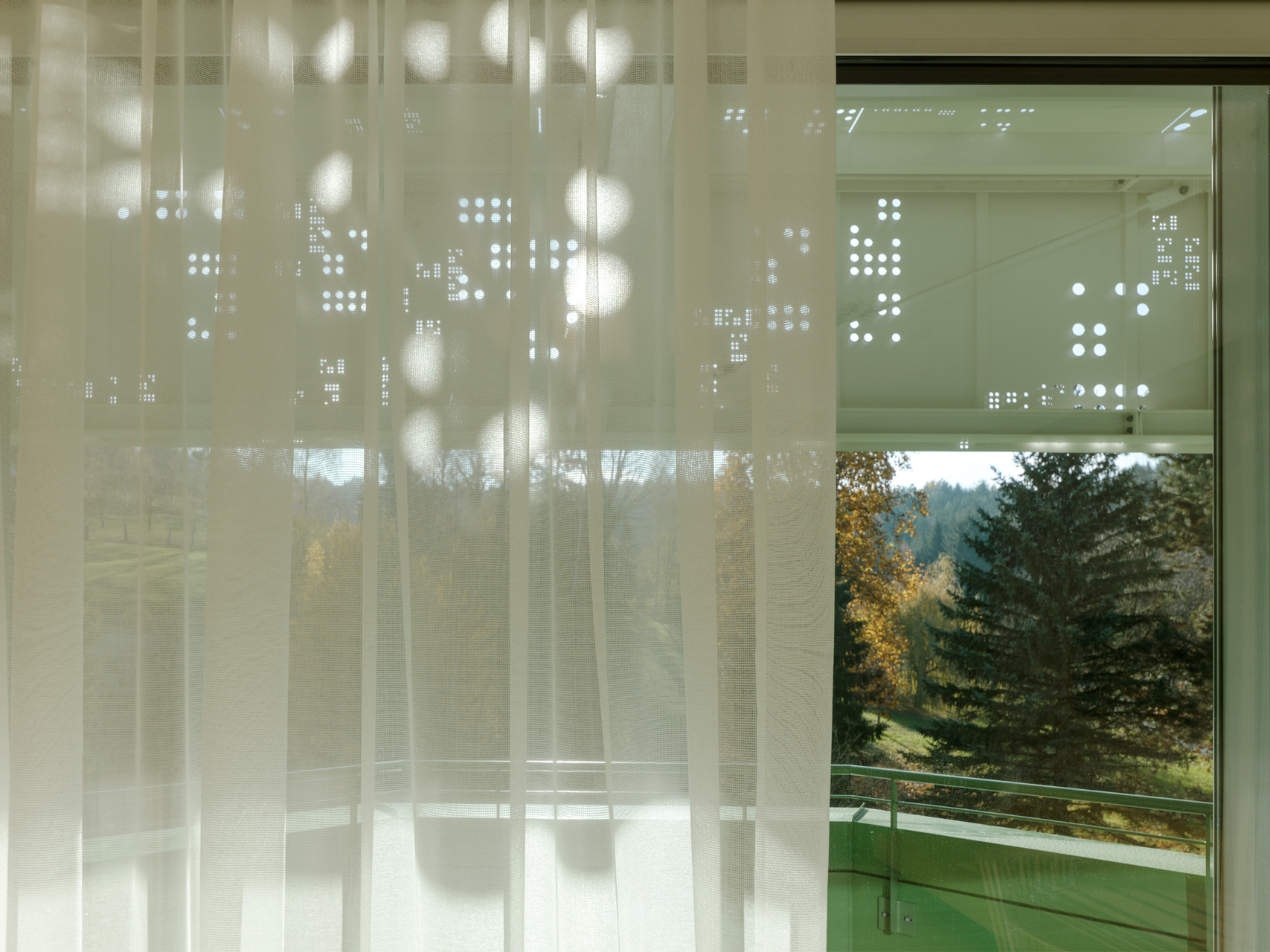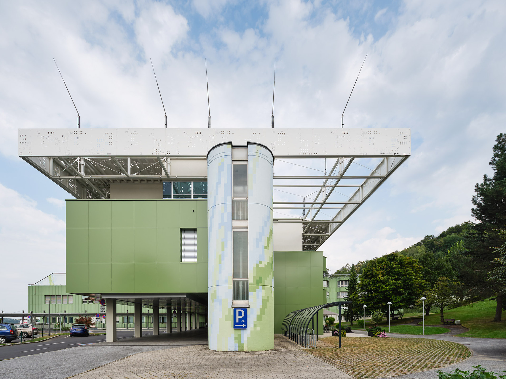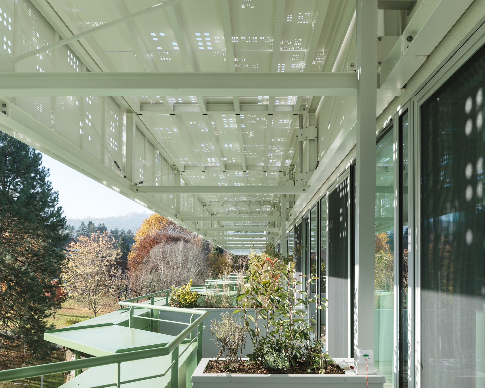 Das Hinzufügen eines neuen Stockwerks zur bestehenden Krankenhaus-Infrastruktur eröffnet neue Perspektiven. Dieses Volumen wurde durch ein schwebendes Metallband umhüllt, um den heterogenen Bestand „zusammenzufassen“. Das durchgängige, weiße mit stressreduktiven „fraktalen“ Mustern perforierte Band bietet nicht nur konstruktiven Sonnenschutz, sondern gewährt auch konstanten Ausblick zur Natur in der Umgebung. Das wissenschaftlich fundierte Design der durchbrochenen Muster, entwickelt in Zusammenarbeit mit Dr. Richard Taylor von der University of Oregon und 13&9 Design, integriert die stressreduzierenden Eigenschaften von Fraktalen basierend auf Dr. Taylors Forschung und ermöglicht das Eindringen des Tageslichts. Dieses dynamische fraktale Zusammenspiel von Licht und Schatten gleicht dem Licht, von natürlichen fraktalen Umgebungen wie Wäldern. Darüber hinaus reflektiert und erweitert es diesen dynamischen Schatten auch im Inneren der Räume, wodurch noch mehr Verbindung zwischen Innenansicht und Außenwelt entsteht.