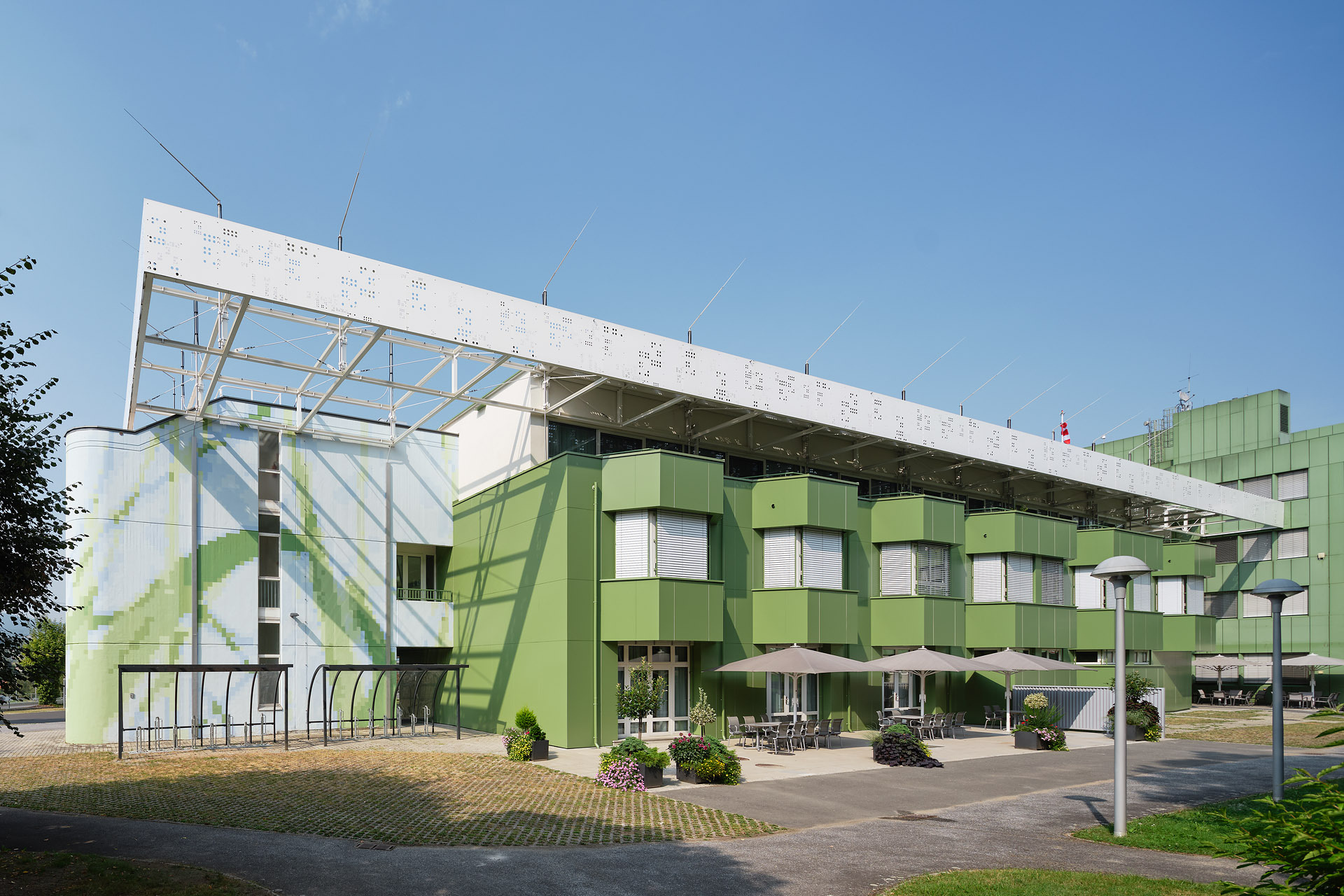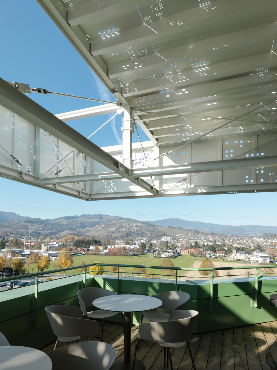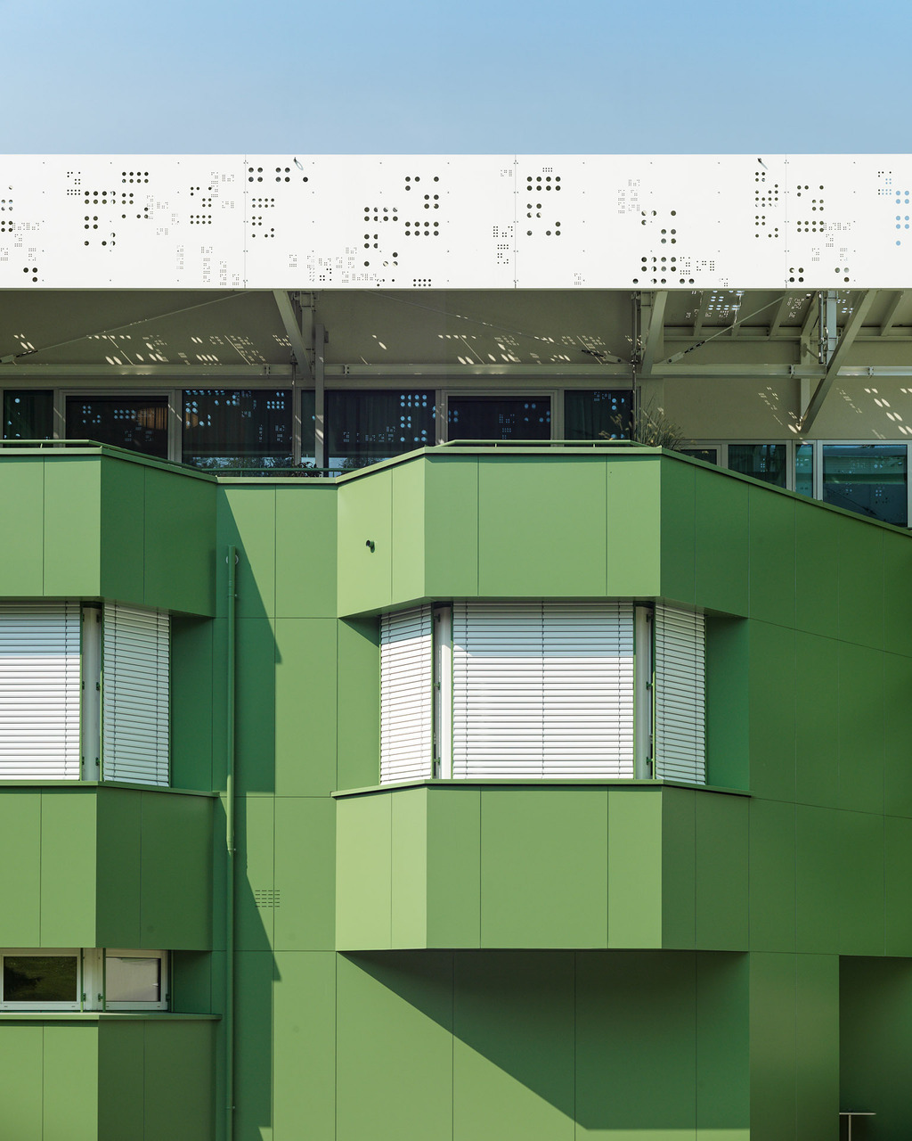Das Hinzufügen eines neuen Stockwerks zur bestehenden Krankenhaus-Infrastruktur eröffnet neue Perspektiven. Dieses Volumen wurde durch ein schwebendes Metallband umhüllt, um den heterogenen Bestand „zusammenzufassen“. Das durchgängige, weiße mit stressreduktiven „fraktalen“ Mustern perforierte Band bietet nicht nur konstruktiven Sonnenschutz, sondern gewährt auch konstanten Ausblick zur Natur in der Umgebung. Das wissenschaftlich fundierte Design der durchbrochenen Muster, entwickelt in Zusammenarbeit mit Dr. Richard Taylor von der University of Oregon und 13&9 Design, integriert die stressreduzierenden Eigenschaften von Fraktalen basierend auf Dr. Taylors Forschung und ermöglicht das Eindringen des Tageslichts. Dieses dynamische fraktale Zusammenspiel von Licht und Schatten gleicht dem Licht, von natürlichen fraktalen Umgebungen wie Wäldern. Darüber hinaus reflektiert und erweitert es diesen dynamischen Schatten auch im Inneren der Räume, wodurch noch mehr Verbindung zwischen Innenansicht und Außenwelt entsteht.