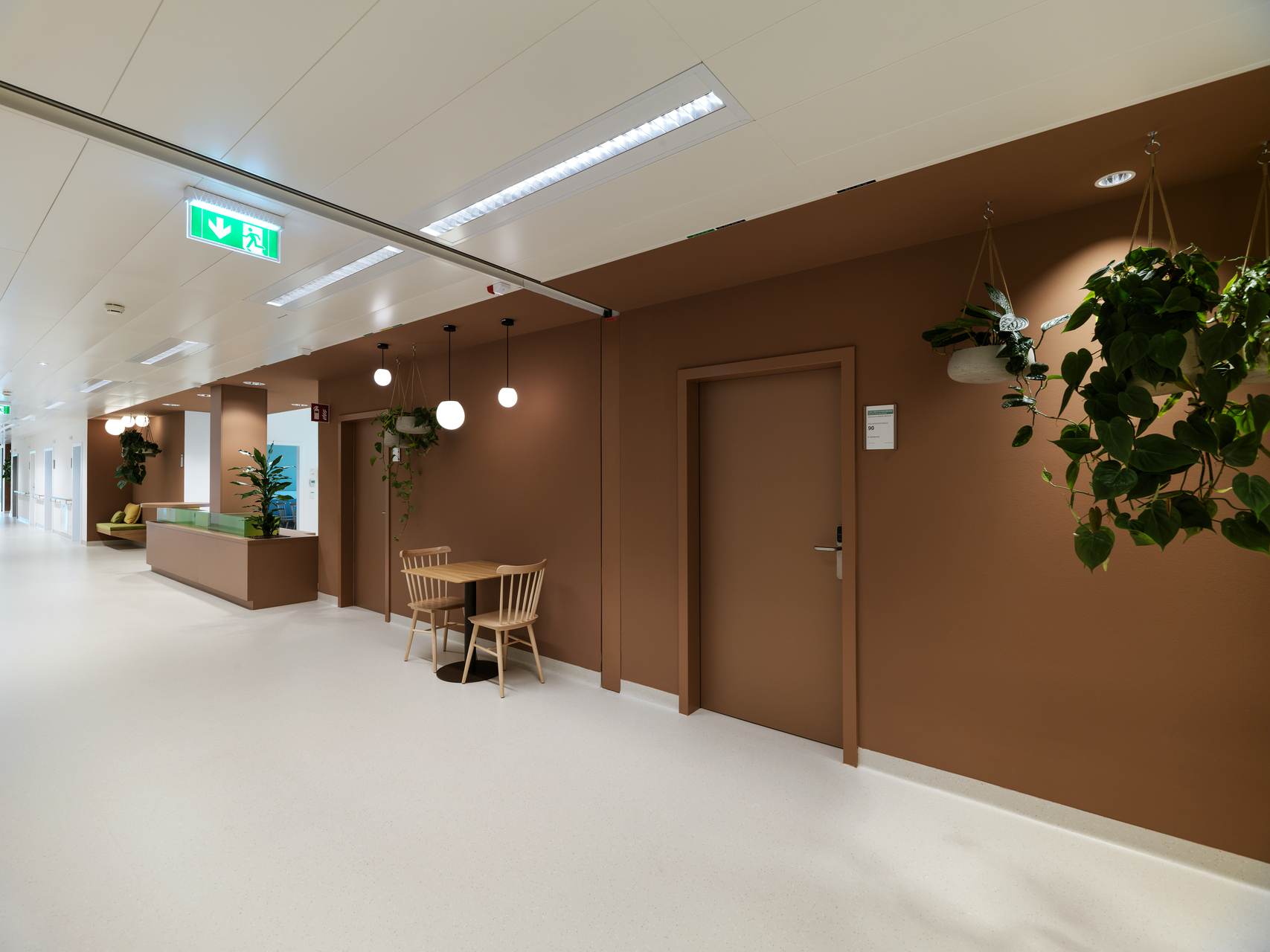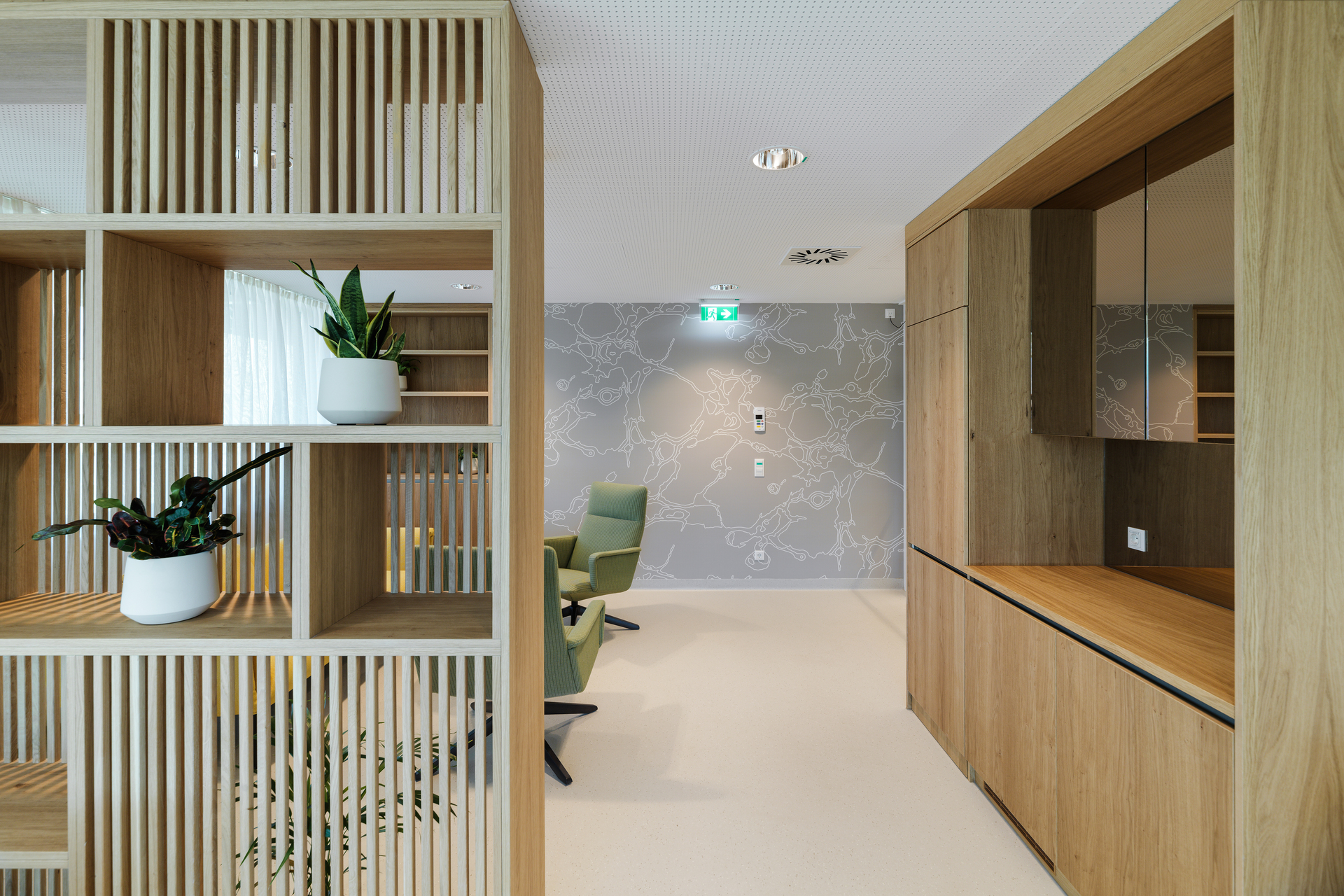 Ziel war es, eine Atmosphäre zu schaffen, die sich eher wie ein Hotel oder ein Zuhause anfühlt als eine klinische Umgebung. Auch an den Wänden sind fraktale Muster integriert, die wissenschaftlich-basierte Stressreduktion fördern und somit nicht nur als dekorative Elemente dienen, sondern auf neurowissenschaftlicher Ebene ihre Sinnhaftigkeit haben.