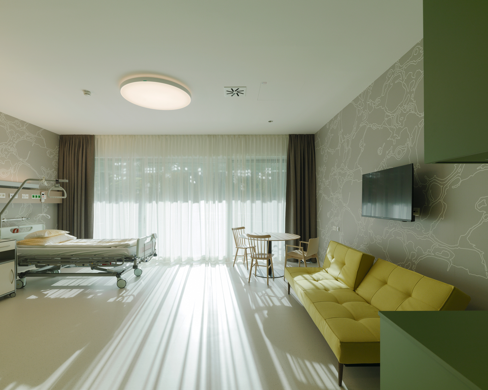 Die Einbeziehung von Gästeausstattungen wie Schlafsofas ermöglichen es, Familienmitgliedern zu übernachten und in der Nähe des Patienten zu bleiben. Jedes Zimmer verfügt über eine eigene Terrasse, die auch mit dem Krankenbett zugänglich ist. Unser Ansatz zum Badedesign harmonisiert Funktionalität und Wohlbefinden mit ansprechender Ästhetik. Durch die Mischung aus hellen Keramiken und dunkleren Natursteinen schaffen wir visuell kontrastierende Räume, die sowohl ansprechend als auch zugänglich für Patienten mit eingeschränktem Sehvermögen sind und damit ihr Gefühl von Unabhängigkeit und Komfort erhöhen.