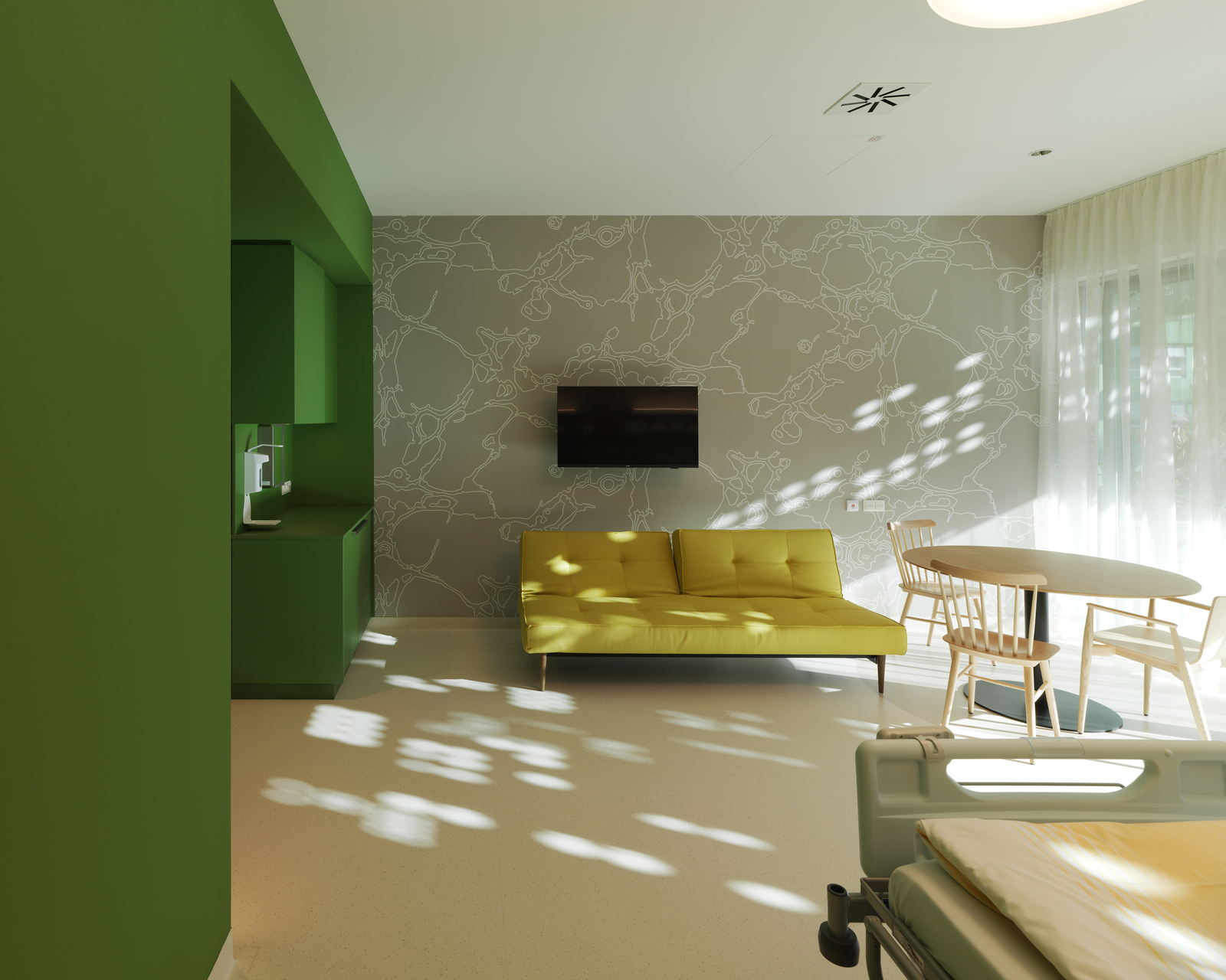 Der Gemeinschaftsbereich, liebevoll als „Wohnzimmer“ bezeichnet, dient als Mittelpunkt für soziale Interaktion und emotionale Unterstützung. Als weitläufiger Raum mit viel natürlichem Licht und üppigem Grün, bequemen Sitzgelegenheiten und fraktalen Mustern, die visuell durch Regale in kleinere Bereiche geteilt werden können, vermittelt dieser Raum ein Gefühl von Zugehörigkeit und Zusammengehörigkeit, dass die Grenzen einer medizinischen Einrichtung überwindet. Dieses architektonische Unterfangen geht nicht nur darum, physische Räume zu konstruieren; es geht darum, Umgebungen zu schaffen, die den menschlichen Geist, Körper und Seele trösten. (Text: Architekt:innen)