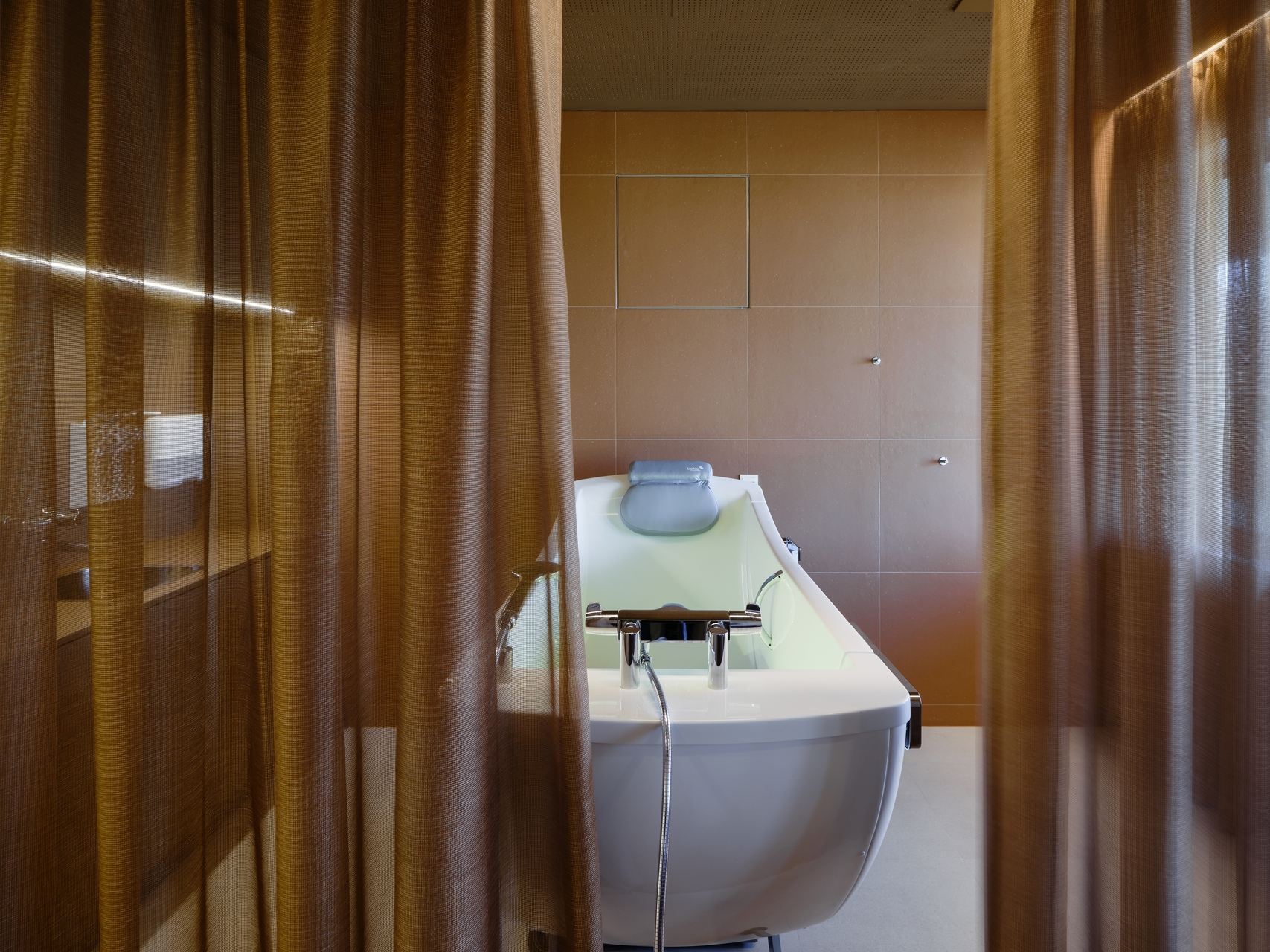 Im Herzen der Station befindet sich das „Kleine Spa“, das eine innovative, Höhen- und Positionsverstellbare Badewanne mit einer seitlichen Öffnungswand für einen einfacheren Einstieg bietet. Diese innovative Annehmlichkeit richtet sich nach den einzigartigen Bedürfnissen der Patienten und ermöglicht ihnen den Zugang und das Baden in ihrer angenehmsten Position.
