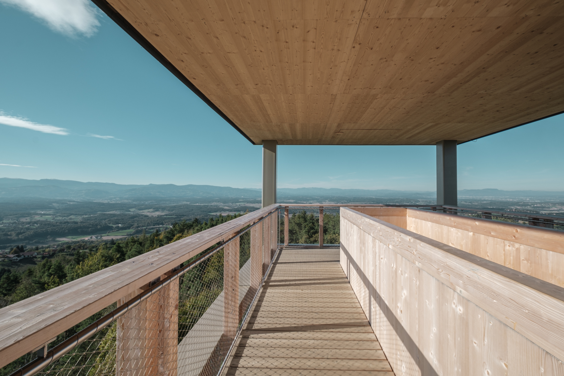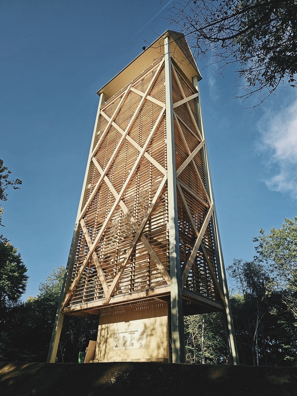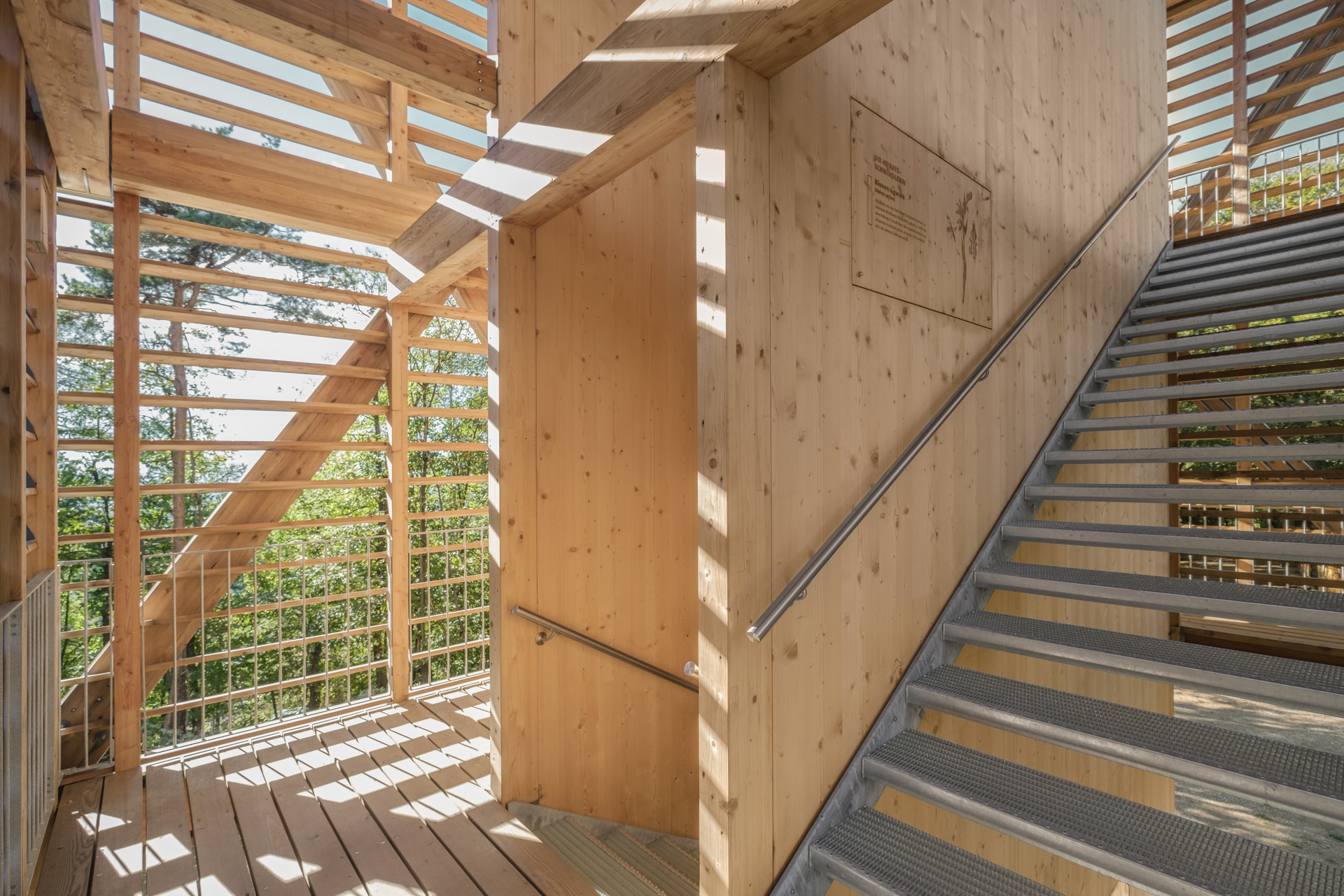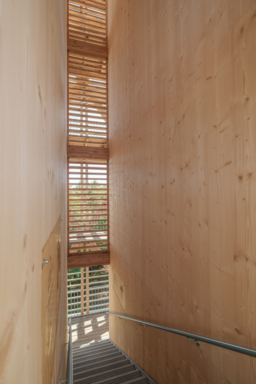 Der Baukörper wurde bewusst schlank gewählt um die von der Natur gegebene Lichtung nicht durch ein monumentales Bauwerk zu verbauen und deren Wirkung zu beeinflussen. Die Treppe markiert mittig den Eingang, ringsum bilden Sitzmöglichkeiten und Infotafeln den Unterstand für Wander:innen. Die Treppe wechselt in den Geschossen den Lauf, wodurch Galeriegeschosse geschaffen werden, die zum einen für das Anbringen und die Betreuung der Nisthilfen dienen und zum anderen zusätzlichen Raum bieten, der mit Informations- und Beobachtungsstationen bespielt werden kann. In Zusammenarbeit mit Natura 2000-Beauftragten, Naturschutzjugend, Jägerschaft, Berg- und Naturwacht und weiteren Organisationen und Personen aus dem Natur-Vermittlungs-Bereich werden die typischen Regionscharakteristika im Horst für Besucher:innen nähergebracht. Durch die horizontale Schalung ist der Aufgang und die Wegeführung von außen geschützt und man kann sich auf die Wissensvermittlung konzentrieren. Am Ende verlässt man den halbgeschlossenen Bereich und gelangt auf die Aussichtsplattform. Auf dieser wurde ein durchlässiges Geländer aus Stahlseilen angebracht um auch den „kleinen“ Besucher:innen die Möglichkeit der Aussicht zu geben.