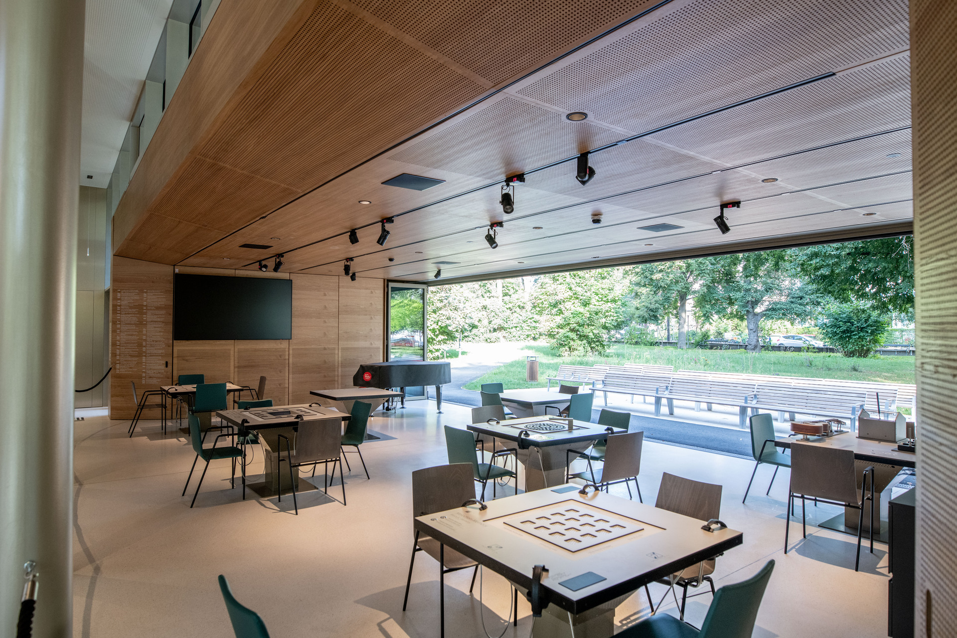 Große Glas-Schiebeelemente geben Blick und Weg in den Park frei. In der kalten Jahreszeit als luftiger Wintergarten geschätzt, stehen jetzt, Anfang September, im Park noch Sitzmöbel für die Zuschauer:innen des nächsten Events. Wenn es gerade keine Veranstaltungen gibt, mutiert die Bühne ebenfalls zum Museum: Sieben mobile unterfahrbare Experimentier- und Spieltische stehen für Musikspielereien, zum Bau eigener Klangräume oder für eine Runde Melodien-Memory bereit, die Stimmgabeln sind beinahe unwiderstehlich für Vorbeigehende. Durch diese großzügige Öffnung zum Park wird auch die hohe strenge Fassade des Bestands, der man trotz der hinzugefügten Balkone das ehemalige Spital anmerkt, zumindest an der Basis aufgelöst zu einem offenen Haus, das mehr verspricht als nur Unterkunft.