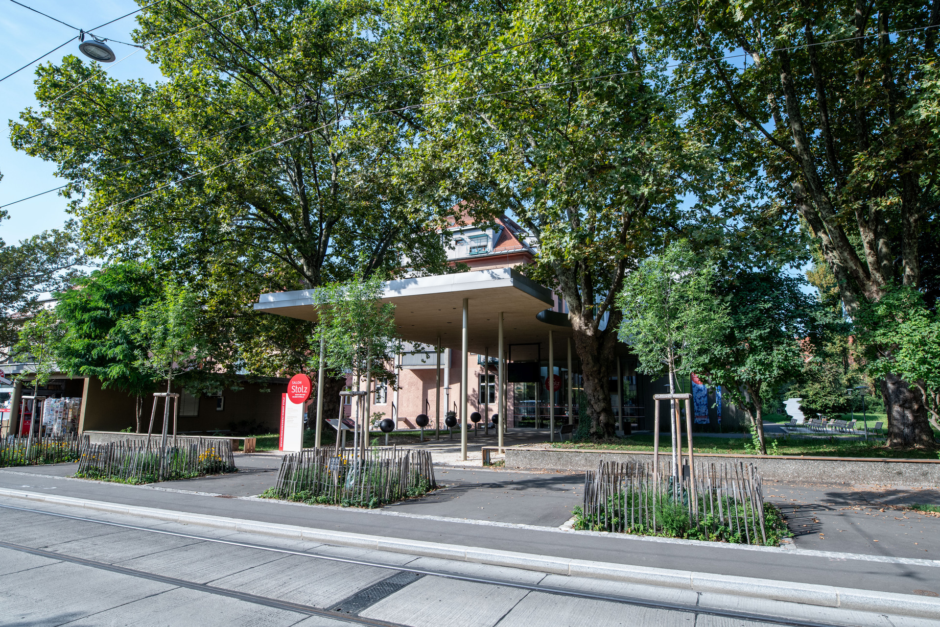 Experimentierbojen locken auch das jüngere Publikum sanft in Richtung Eingang. Zahlreiche Bänke unter diesem Dach, das je nach Jahreszeit als Schattenspender oder Regenschutz dient, ermöglichen das Beobachten des Straßenraums aus gesicherter Position. Schade, dass die in den Wettbewerbsplakaten noch angedachte Bemalung des angrenzenden Kiosks (noch?) nicht erfolgt ist – die kahle Fassade der Seitenfront bietet keine berückende Perspektive. Dagegen zeugt das charmante Detail, durch eine halbkreisförmige Auslassung des Dachs auch einem alten Baum seinen ihm angestammten Raum zu lassen, von jenem Respekt und von der Rücksichtnahme, die Leitmotiv der gesamten Baumaßnahmen sind.