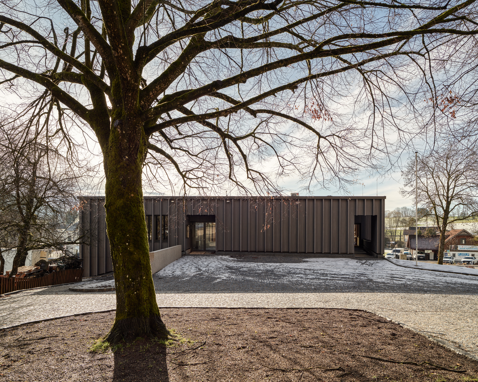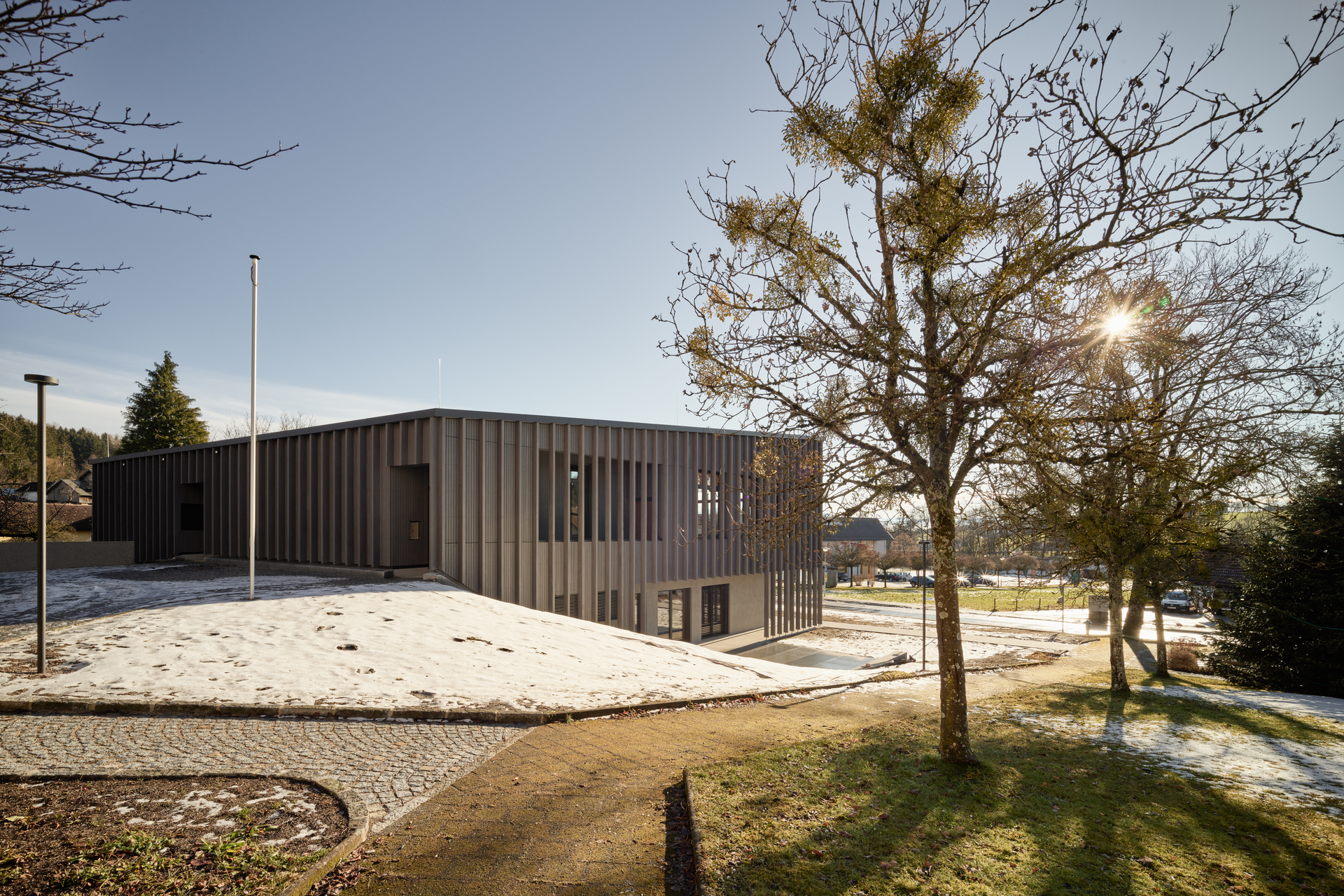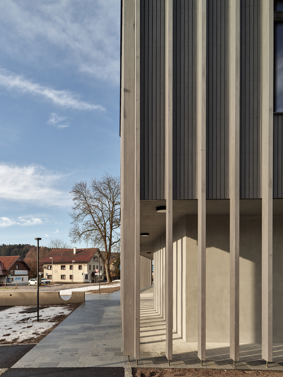 Der Haupteingang liegt im Erdgeschoss, auf dem Niveau der Gemeindestraße. Im Osten schließt ein PKW-Stellplatz, im Westen eine Grünanlage mit Brunnen und großkronigem Baumbestand an. Durch den leichten Flächenüberhang im Obergeschoss entsteht im Erdgeschoss ein auf drei Seiten umlaufender Arkadengang. Dieser weitet sich im Süden und im Westen zu einer überdachten Freifläche auf.
