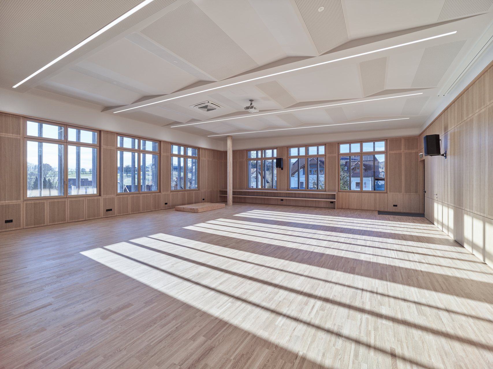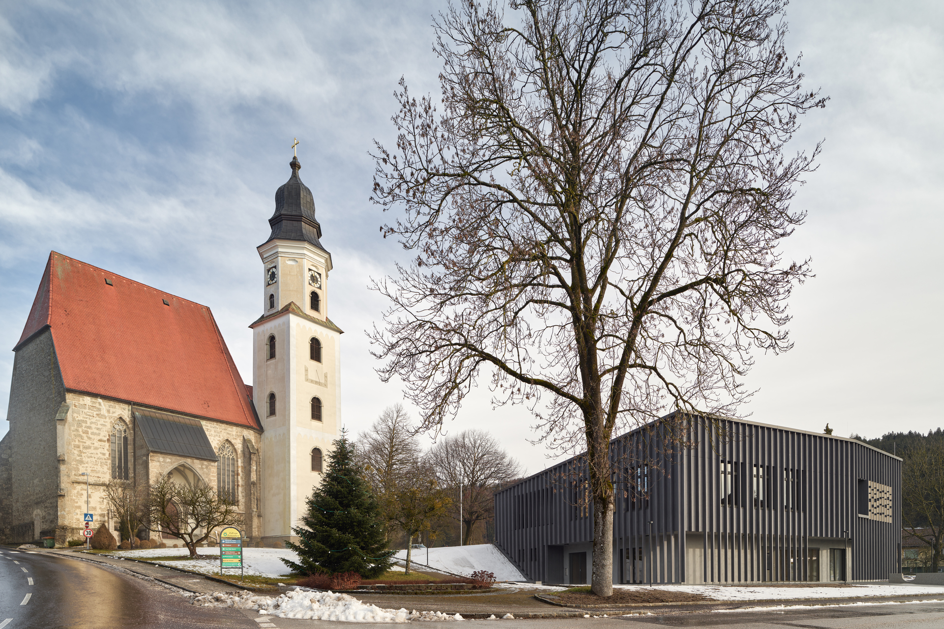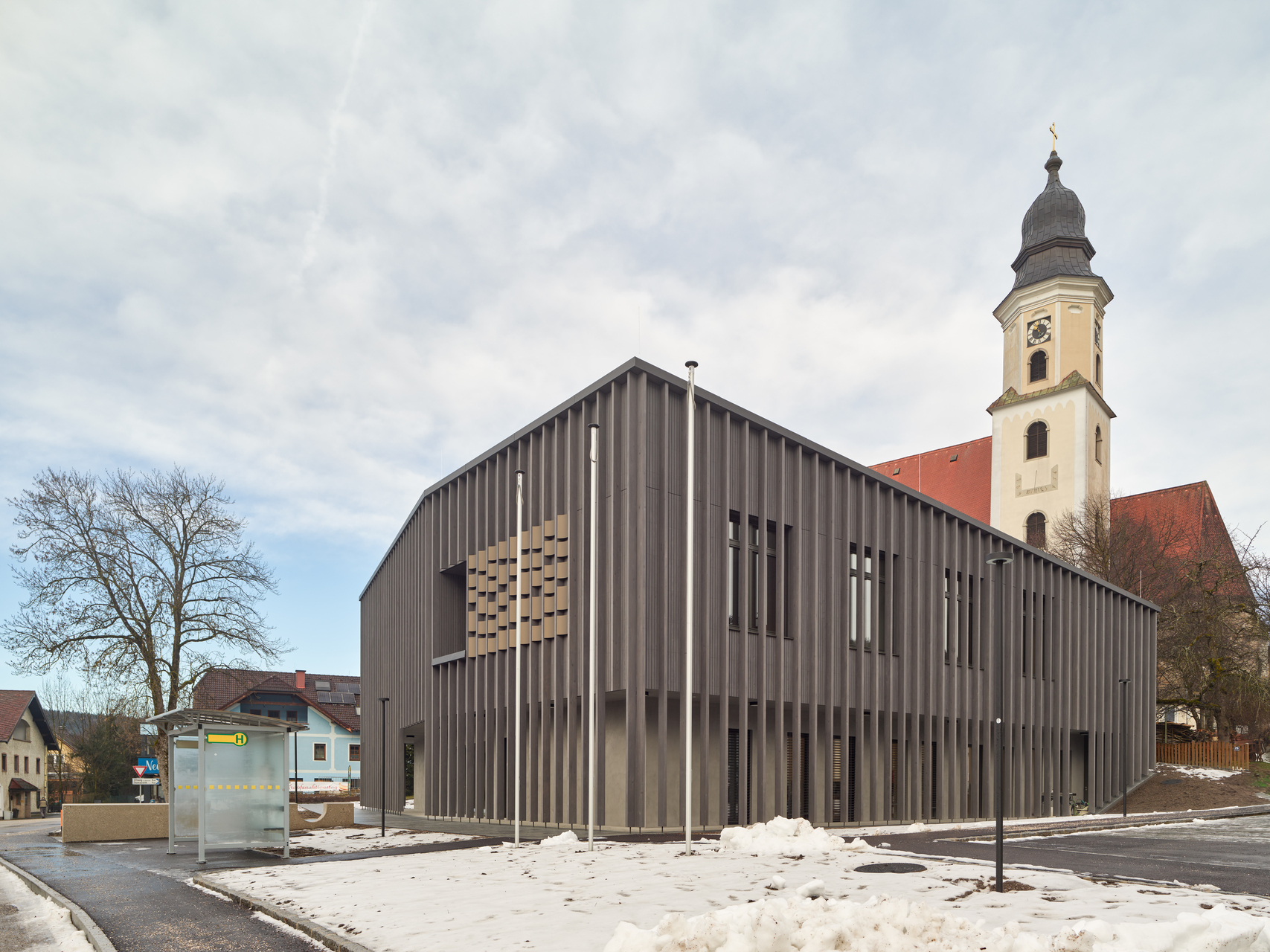 Der Haupteingang liegt im Erdgeschoss, auf dem Niveau der Gemeindestraße. Im Osten schließt ein PKW-Stellplatz, im Westen eine Grünanlage mit Brunnen und großkronigem Baumbestand an. Durch den leichten Flächenüberhang im Obergeschoss entsteht im Erdgeschoss ein auf drei Seiten umlaufender Arkadengang. Dieser weitet sich im Süden und im Westen zu einer überdachten Freifläche auf.