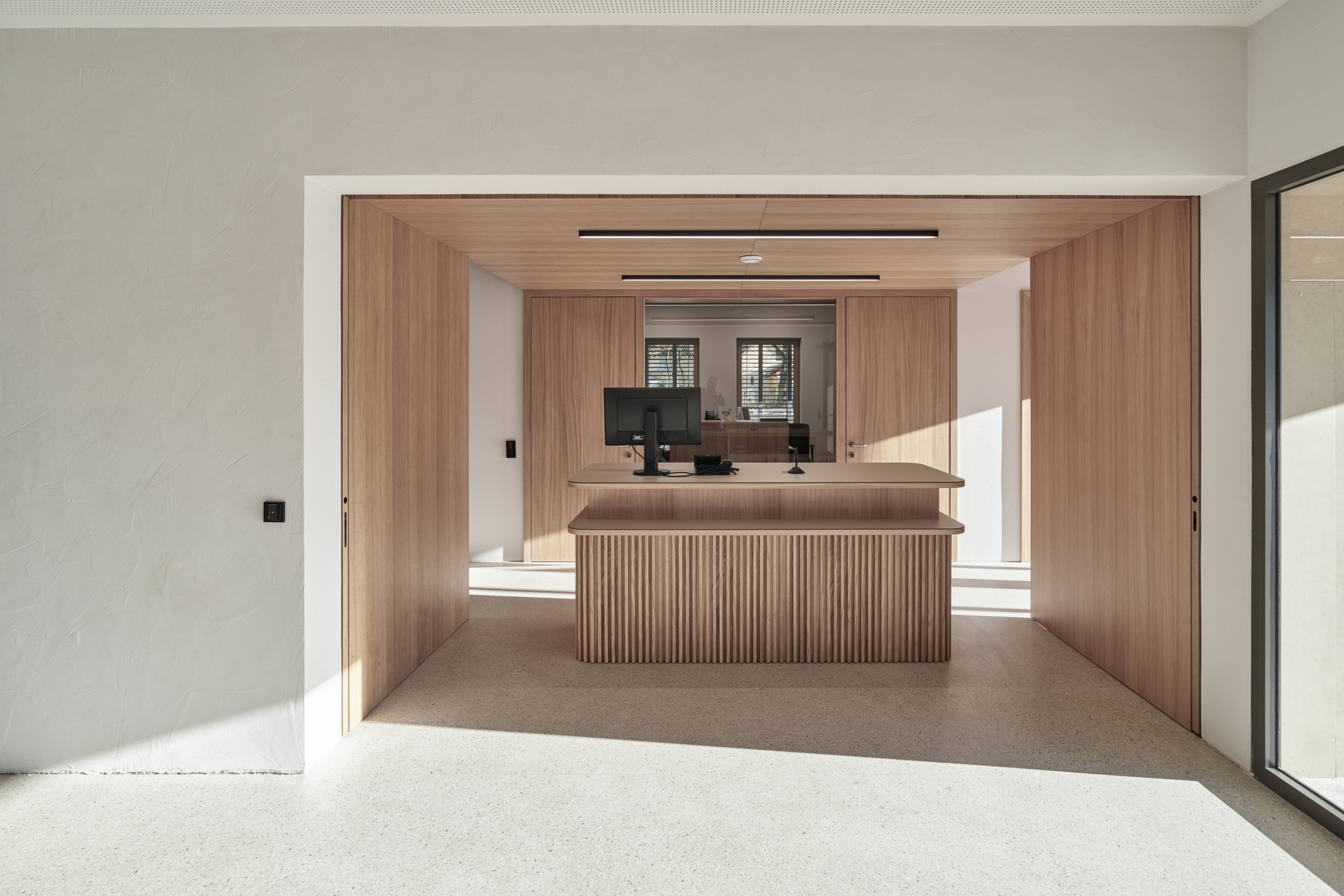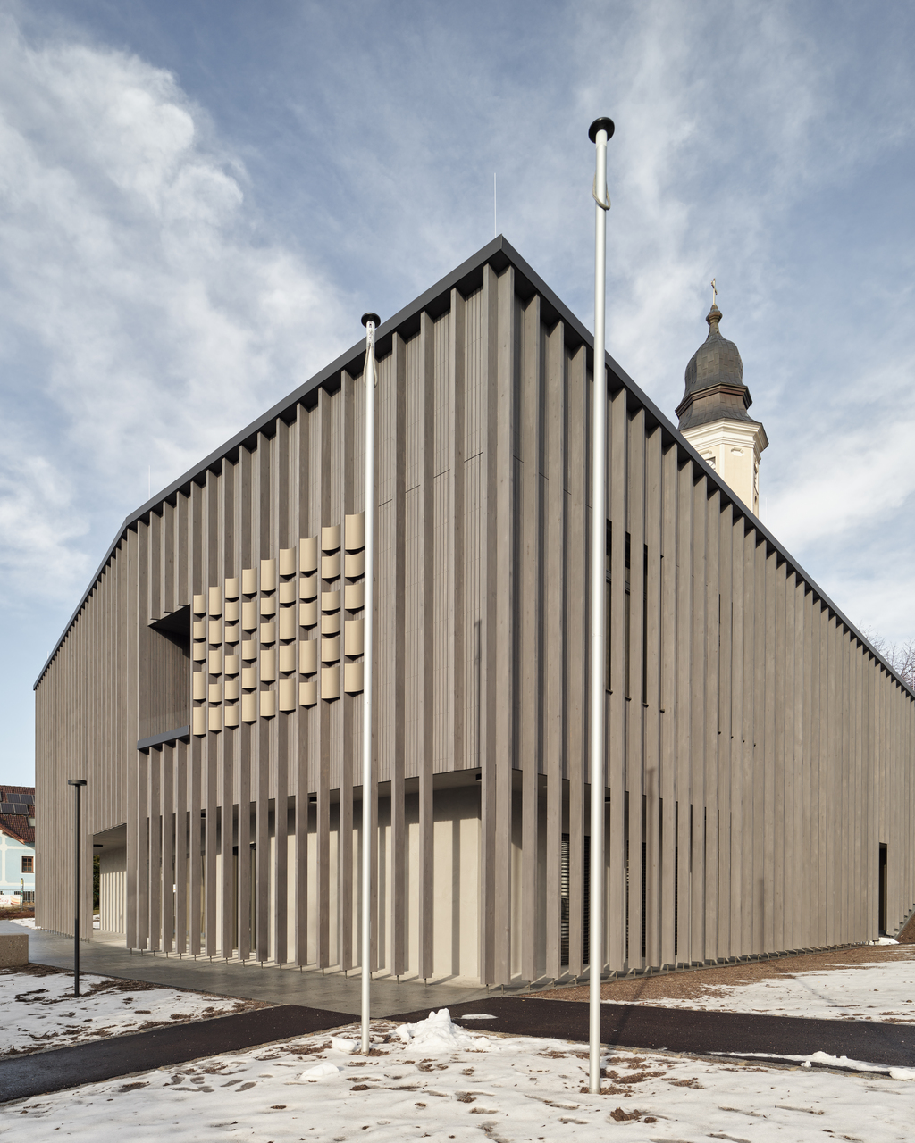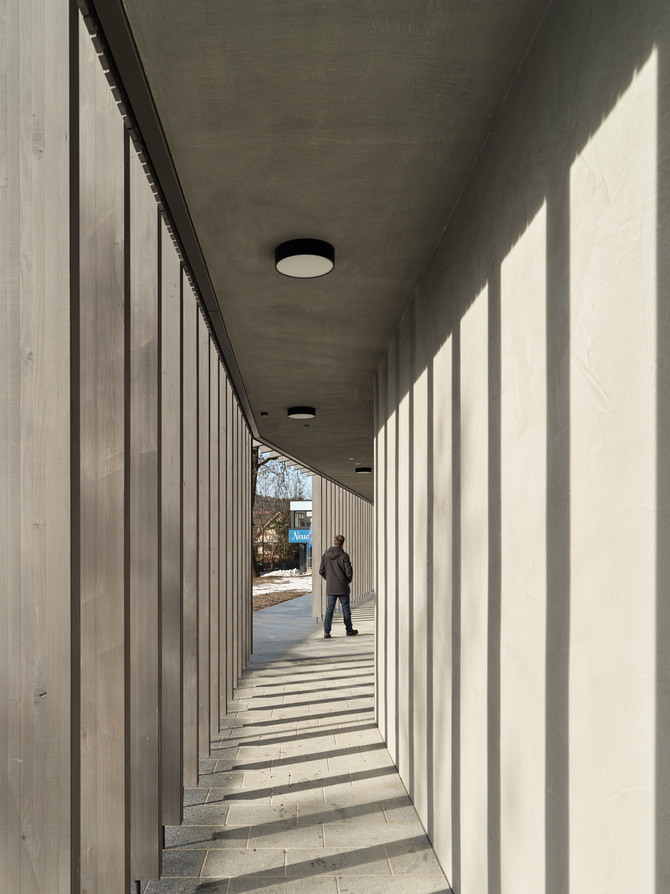 Erdberührende Bauteile sind in Stahlbetonbauweise errichtet. Das Obergeschoss ist in Holzbauweise umgesetzt. Eine vertikal strukturierte Holzfassade bildet die Hülle des Gebäudes. Die Oberflächenmaterialien im Gebäudeinneren sind Beton, Holz, und Glas. (Text: Architekten, bearbeitet)