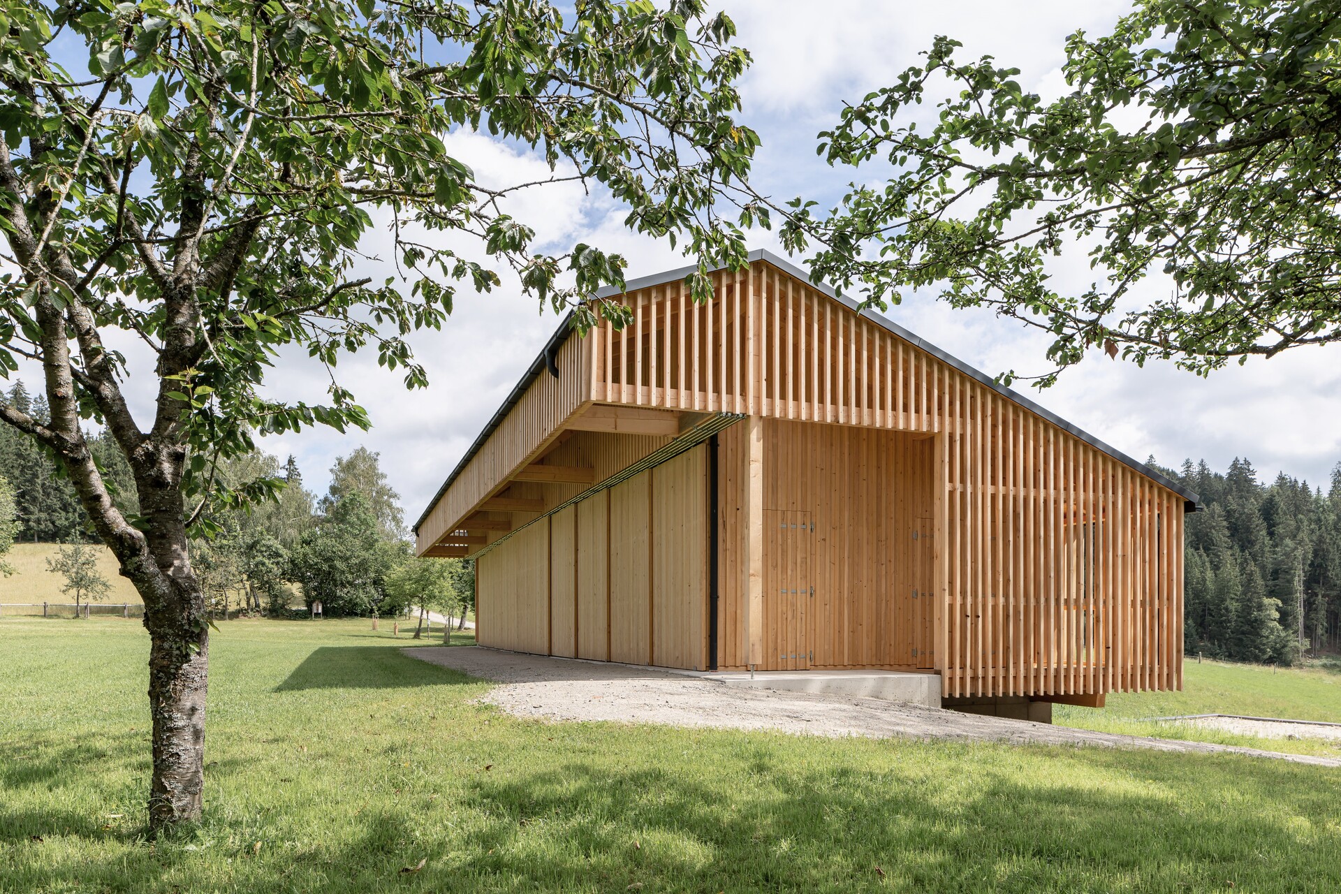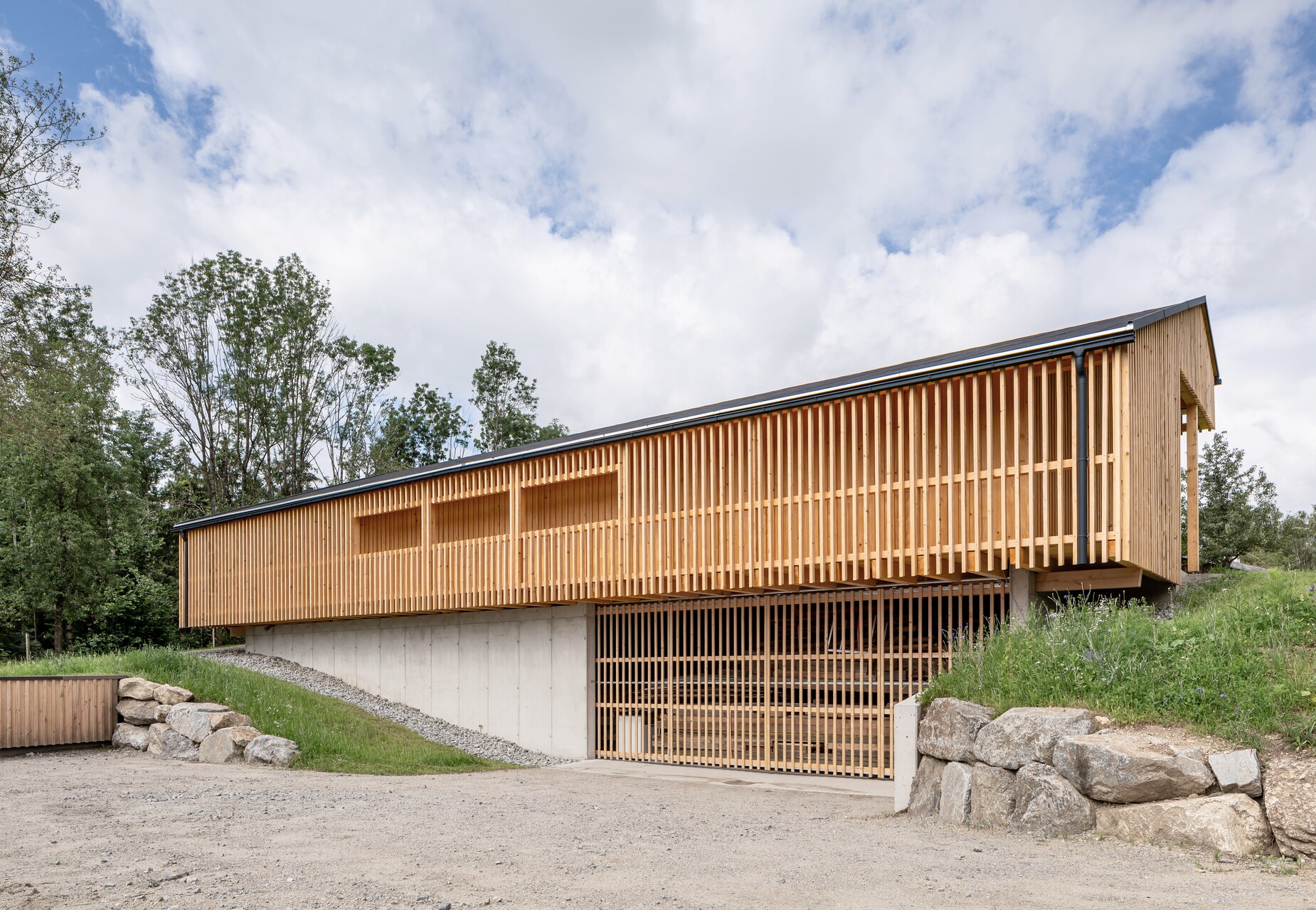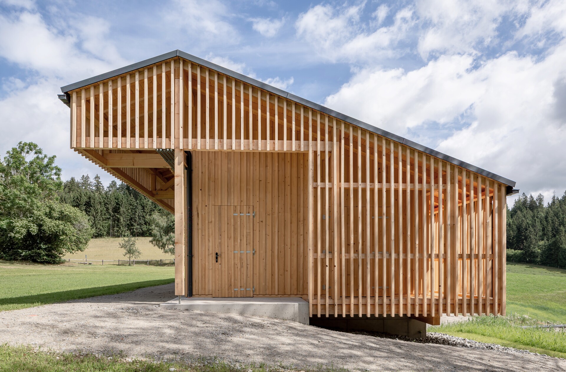 Regionale Wertschöpfung, naturräumliche Einfügung und Identifikation der Nutzer:innen mit dem Objekt standen bei der Entwicklung des Bauwerks im Vordergrund. Hervorzuheben ist das Engagement der Freiwilligen Feuerwehr Auberg, die das Gebäude mit 1.700 freiwilligen Arbeitsstunden innerhalb von weniger als zwei Monaten – von den Erdarbeiten bis zur Fertigstellung, in abgestimmter Zusammenarbeit mit allen Beteiligten – errichtet hat. (Text: Architekt:innen, bearbeitet)