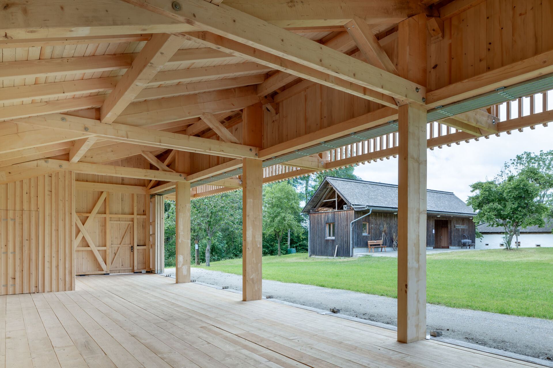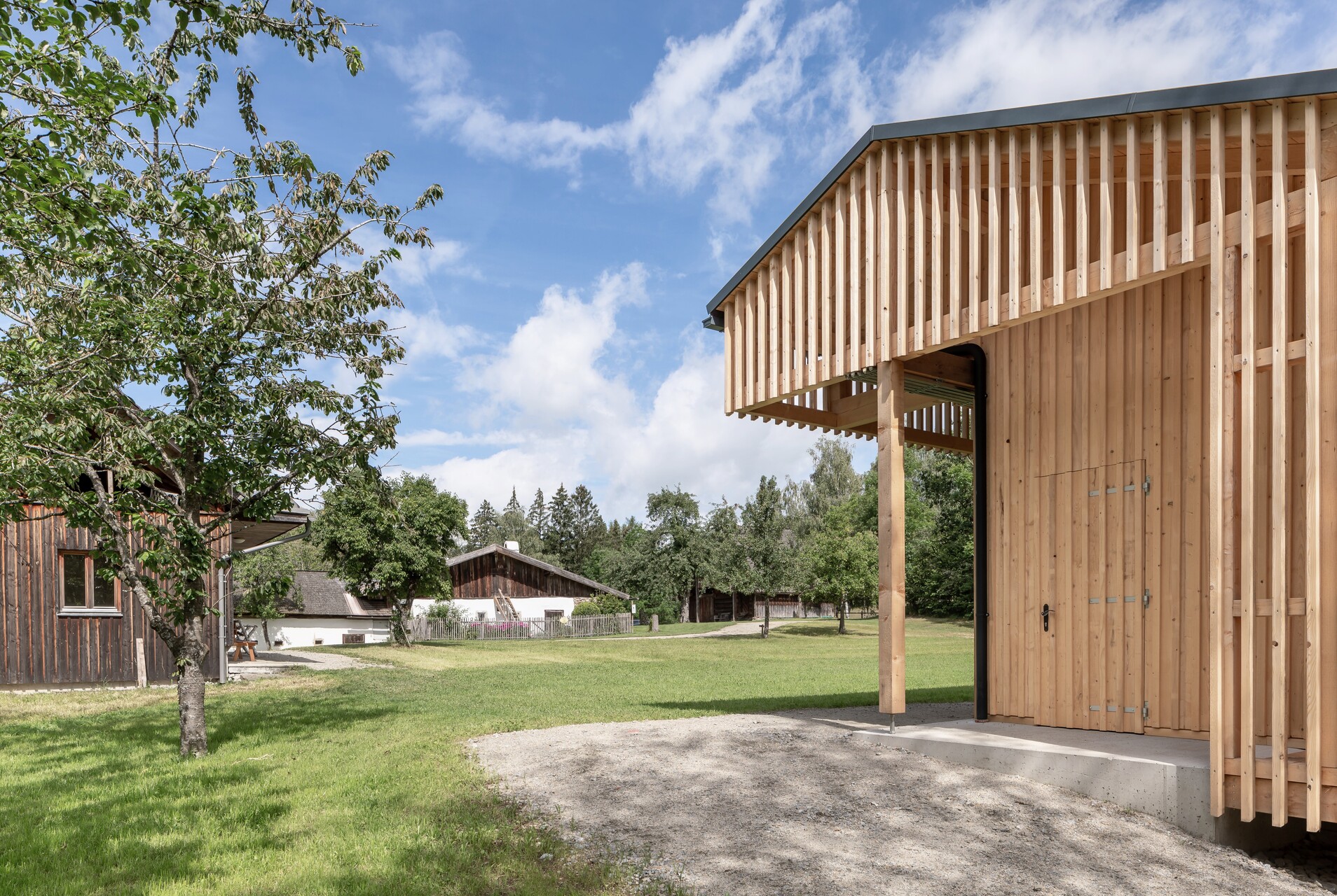Im Frühjahr 2024 wurde das Ensemble des Denkmalhofs durch die Errichtung des sogenannten „Kågerer Stadl“ ergänzt. Der unterkellerte Baukörper wurde an einer Geländekante positioniert und bildet gemeinsam mit einem bereits vorhandenen Bauteil und dem Denkmalhof den räumlichen Abschluss zur Streuobstwiese. Die architektonische Gestaltung wurde aus der Bauweise historischer, freistehender Lagergebäude entwickelt. Das asymmetrische Satteldach war für diese Nutzbauten typisch: Es folgt dem Geländeverlauf und ermöglicht die optimale Nutzung der Gebäudehöhe. Der Keller wird als Einstellfläche für die Veranstaltungen genutzt, während sich die obere Ebene zur Streuobstwiese und zur Hofanlage orientiert. Dank der Schiebe-Elemente lässt sich der Stadel großflächig zur Wiese öffnen und mit den umgebenden Freiräumen verbinden.