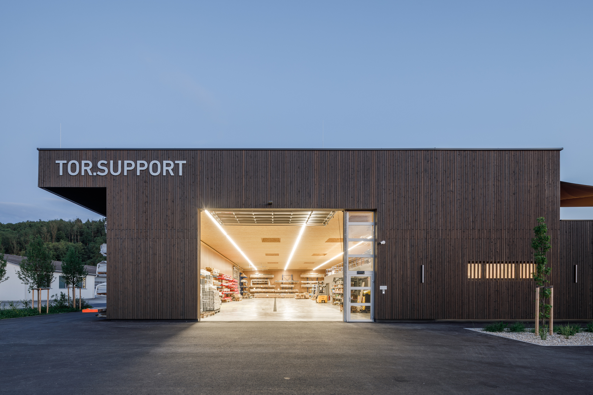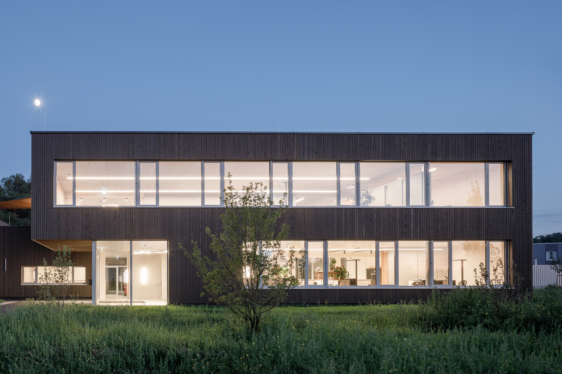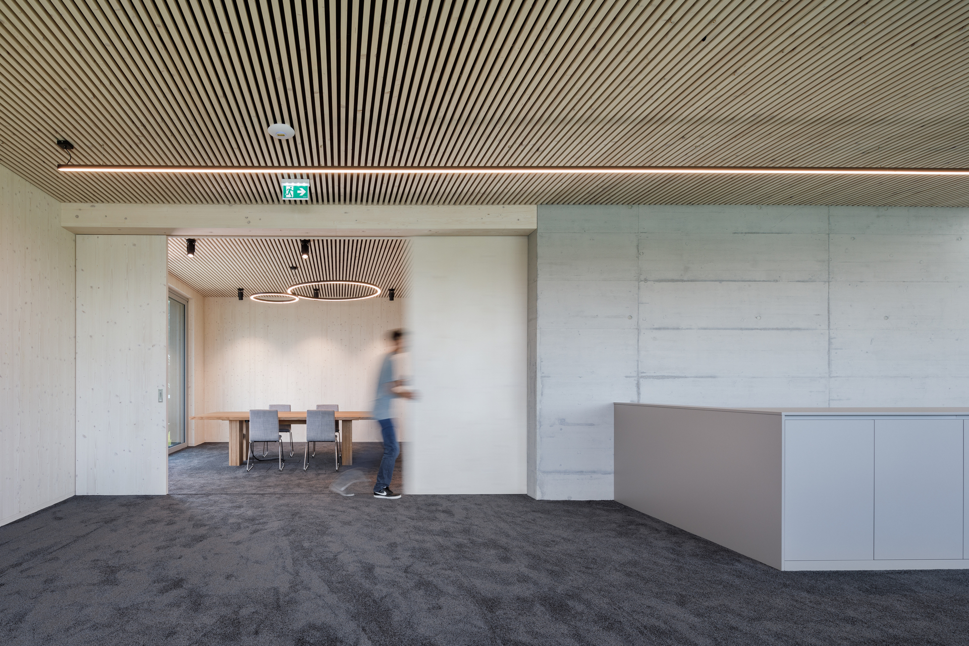 Die Ausführung als konstruktiver Holzbau war von Beginn an vorgesehen und wurde – mit Ausnahme des massiven Kerns – konsequent umgesetzt. Die Wände wurden sowohl im Bürobereich als auch in der Halle in Holzriegelbauweise errichtet. Im Bürotrakt kamen massive Holzdecken zum Einsatz, in der Halle überspannen Gelenksträger mit Auskragung die rund 19 Meter Breite. Die Fassade aus vertikalen Holzlatten bestimmt das äußere Erscheinungsbild. (Text: Architekten, bearbeitet)