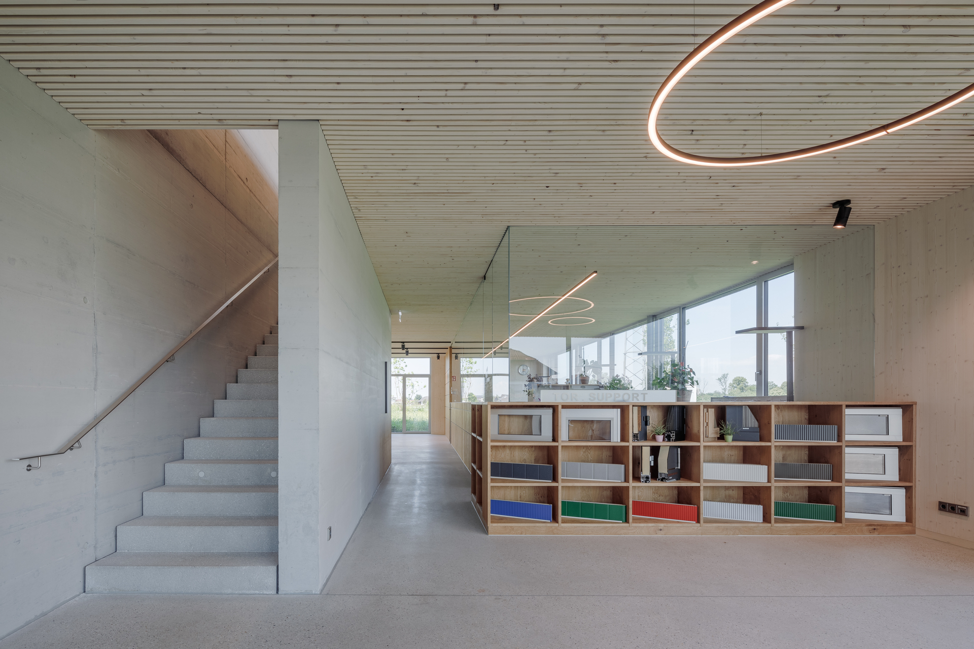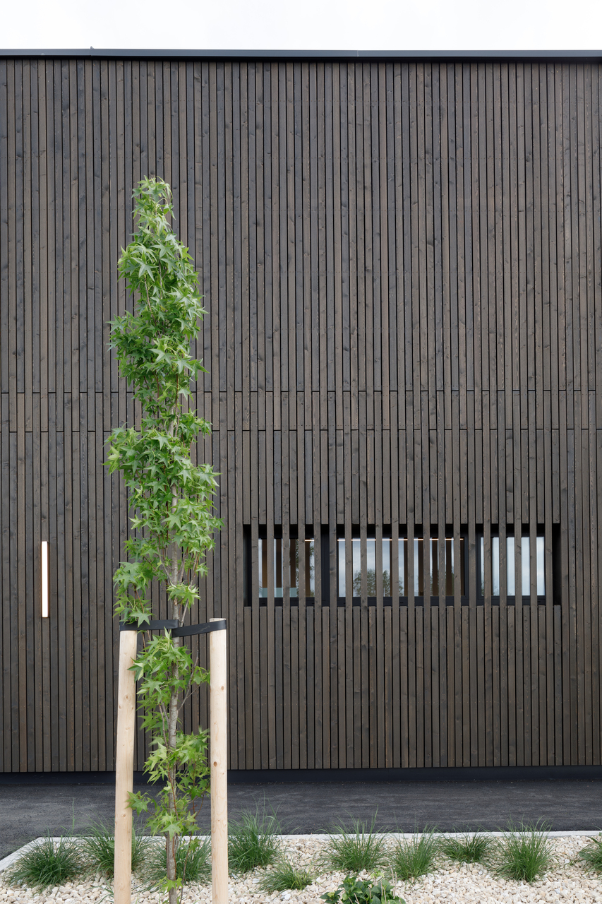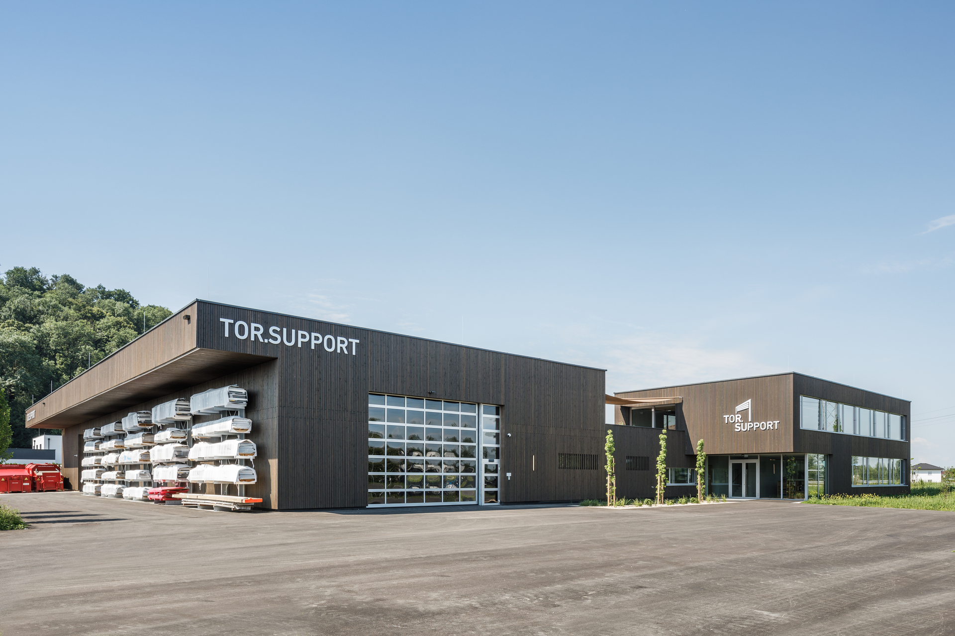 Die Ausführung als konstruktiver Holzbau war von Beginn an vorgesehen und wurde – mit Ausnahme des massiven Kerns – konsequent umgesetzt. Die Wände wurden sowohl im Bürobereich als auch in der Halle in Holzriegelbauweise errichtet. Im Bürotrakt kamen massive Holzdecken zum Einsatz, in der Halle überspannen Gelenksträger mit Auskragung die rund 19 Meter Breite. Die Fassade aus vertikalen Holzlatten bestimmt das äußere Erscheinungsbild. (Text: Architekten, bearbeitet)