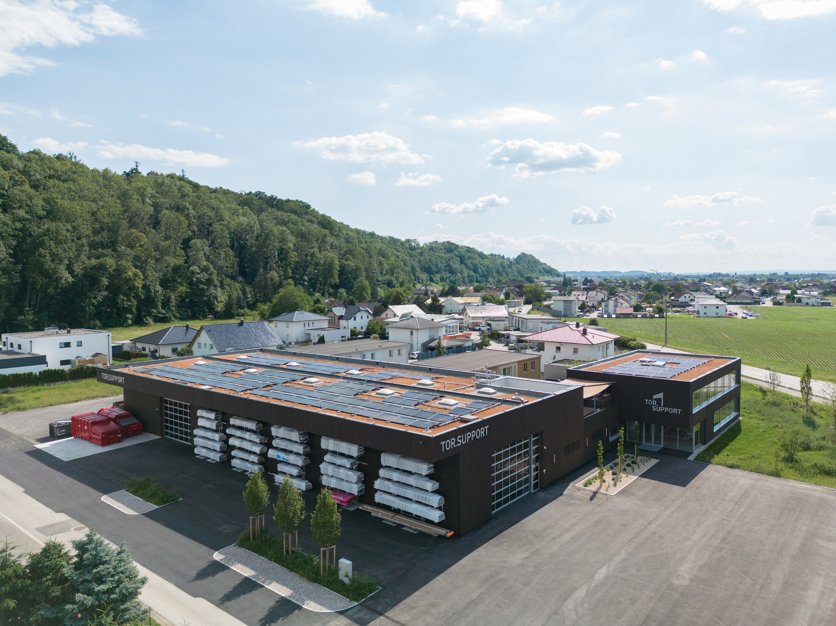 Der Baukörper folgt der L-Form des Grundstücks und reagiert mit seiner städtebaulichen Anordnung auf die benachbarten Wohnbauten. Der nördliche Gebäudeteil mit den Büroräumen ist zur Landesstraße ausgerichtet, während der südliche, parallel zur Zufahrtsstraße gelegene Teil die Lagerhalle mit Anlieferungszone aufnimmt. Die beiden Baukörper sind durch den eingeschossigen Umkleidenbereich miteinander verbunden. Die Abstufung der Attikahöhen gliedert das Gebäudevolumen und reagiert damit auf die Maßstäblichkeit der Umgebung.