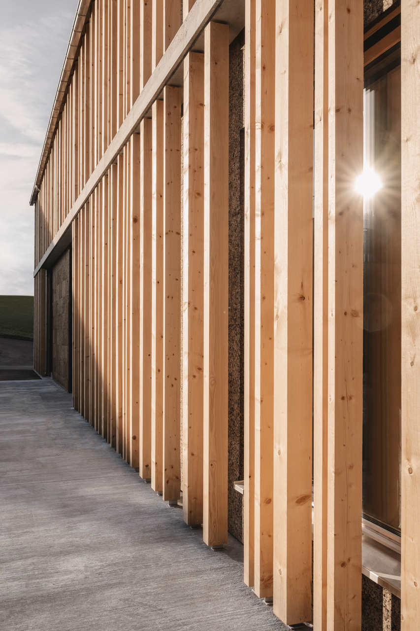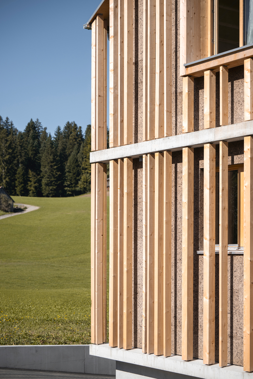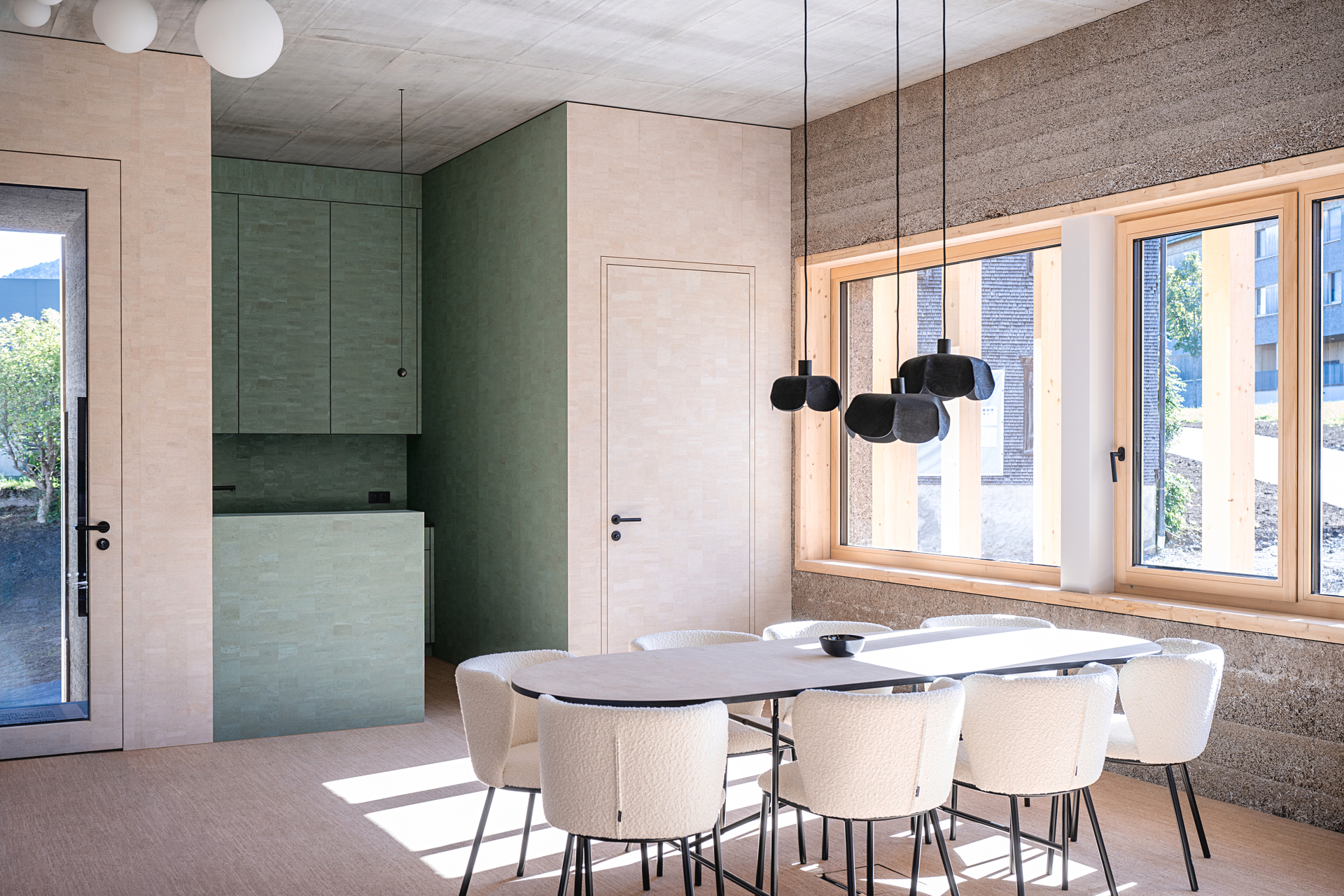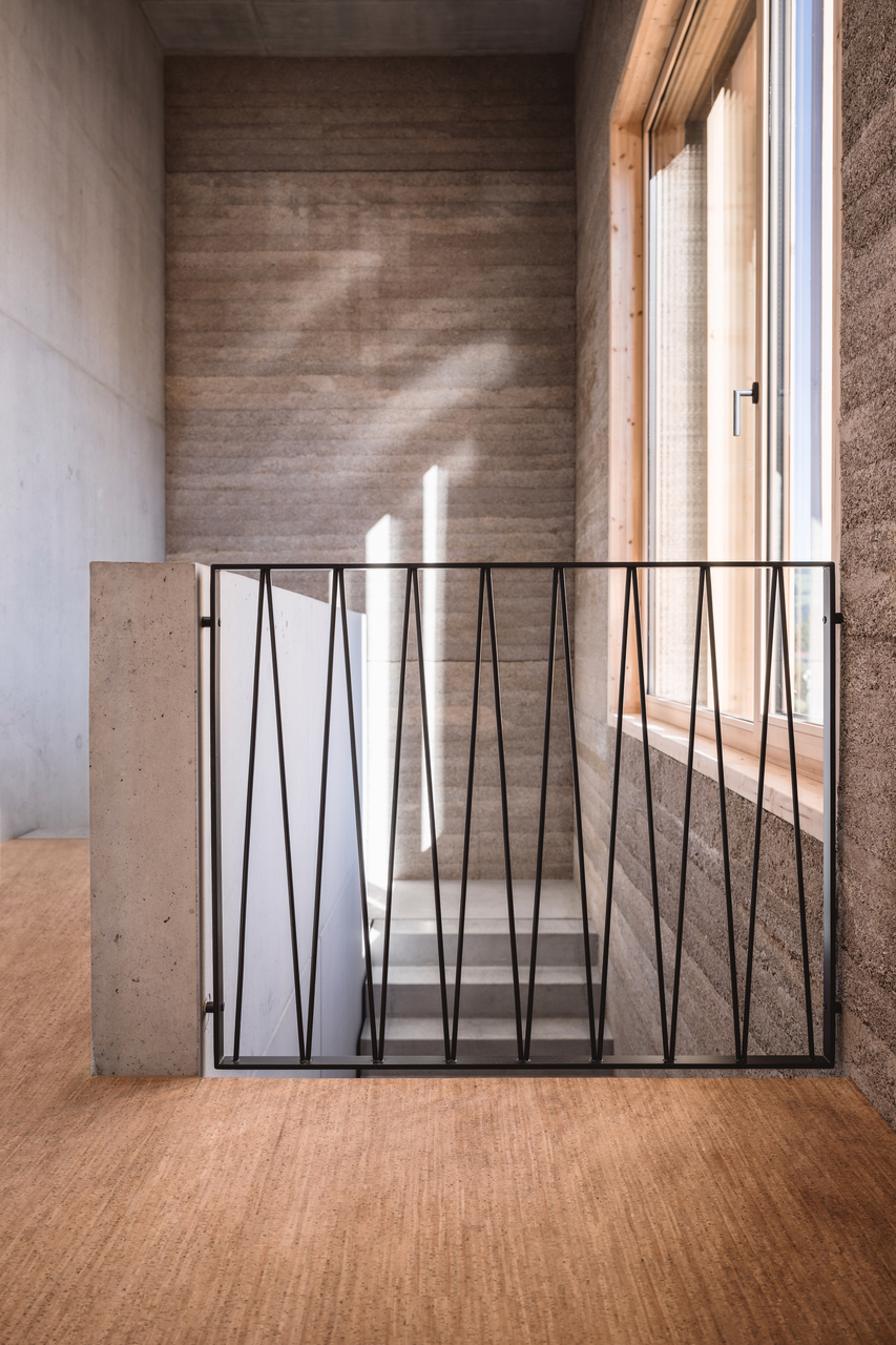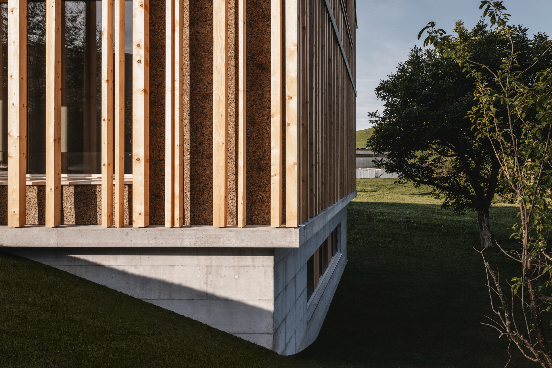 Der Wandaufbau (40 cm Hanf / 4 cm Kork) erreicht einen U-Wert von 0,16 W/m²K. Der gestampfte Hanf hat sehr gute raumakustische Eigenschaften, sodass keine zusätzlichen Akustikmaßnahmen notwendig sind. Zudem reguliert Hanf die Raumluft: Er kann Feuchtigkeit aufnehmen und wieder abgeben, was in einer hohen Behaglichkeit resultiert. Auch optisch entsteht eine sehr ansprechende Oberfläche, welche durch die naturbelassenen Farbtöne ein „warmes“ Raumgefühl vermittelt. Preislich liegt die Ausführung mit Hanf und Kork aktuell teurer als herkömmliche Wandaufbauten. Zudem ist zu beachten, dass es bei unterschiedlichen Untergründen zu Rissbildungen oder Setzungen kommen kann. (Text: Isabella Marboe, nach einem Text der Architekten)