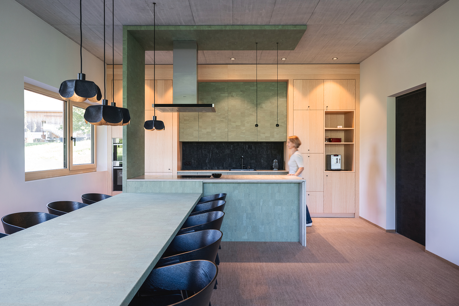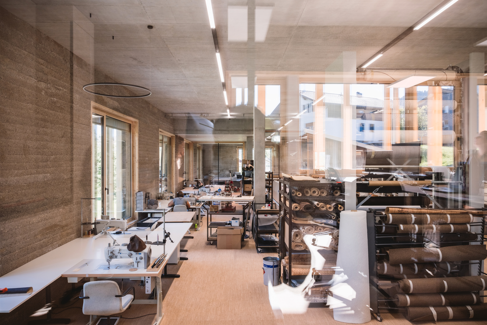Die größte Fläche nimmt der Manufakturbereich im Erdgeschoss ein, wo alle Produktionsschritte erfolgen. Im Inneren von Produktion und Aufenthaltsräume setzte man viel Kork ein. Möbel, Türen und teils ganze Wandpaneele sind mit Korkleder kaschiert, die Korkböden sind weich, gelenkschonend und sehr belastbar.