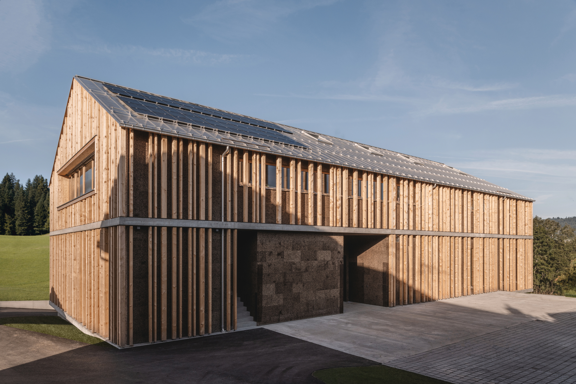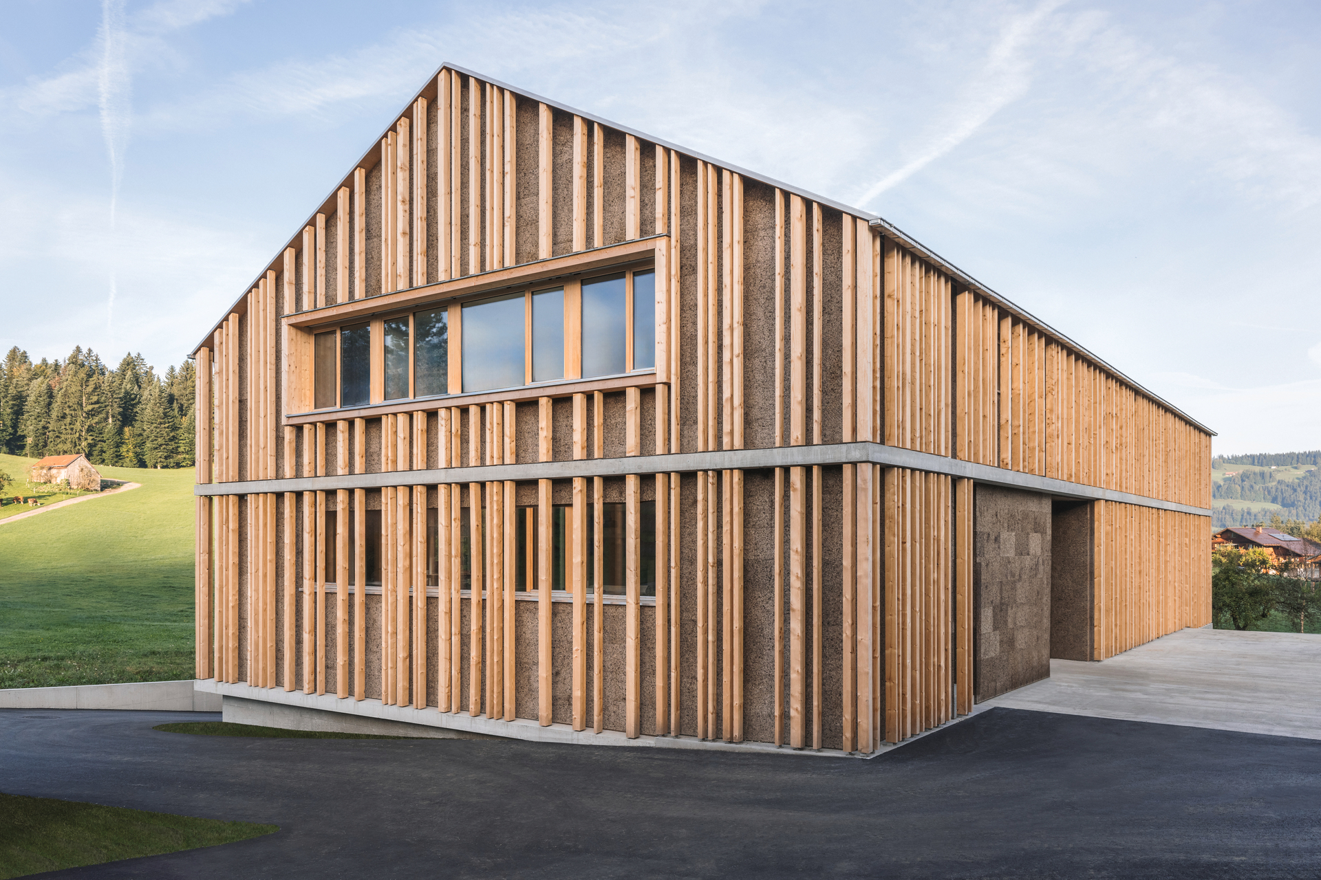 Das Haus ist ein Hybridbau mit massiven Decken, Stahl- und Betonstützen, sowie einer Außenhülle aus Holz, Hanf und Kork, einzig das Untergeschoss mit Technik-, Lager-, Personalräumen und Tiefgarage ist aus Ortbeton. Im Obergeschoss befindet sich die Wohnung der Eigentümerin, deren begrünte Terrasse in den Baukörper eingeschnitten iat.