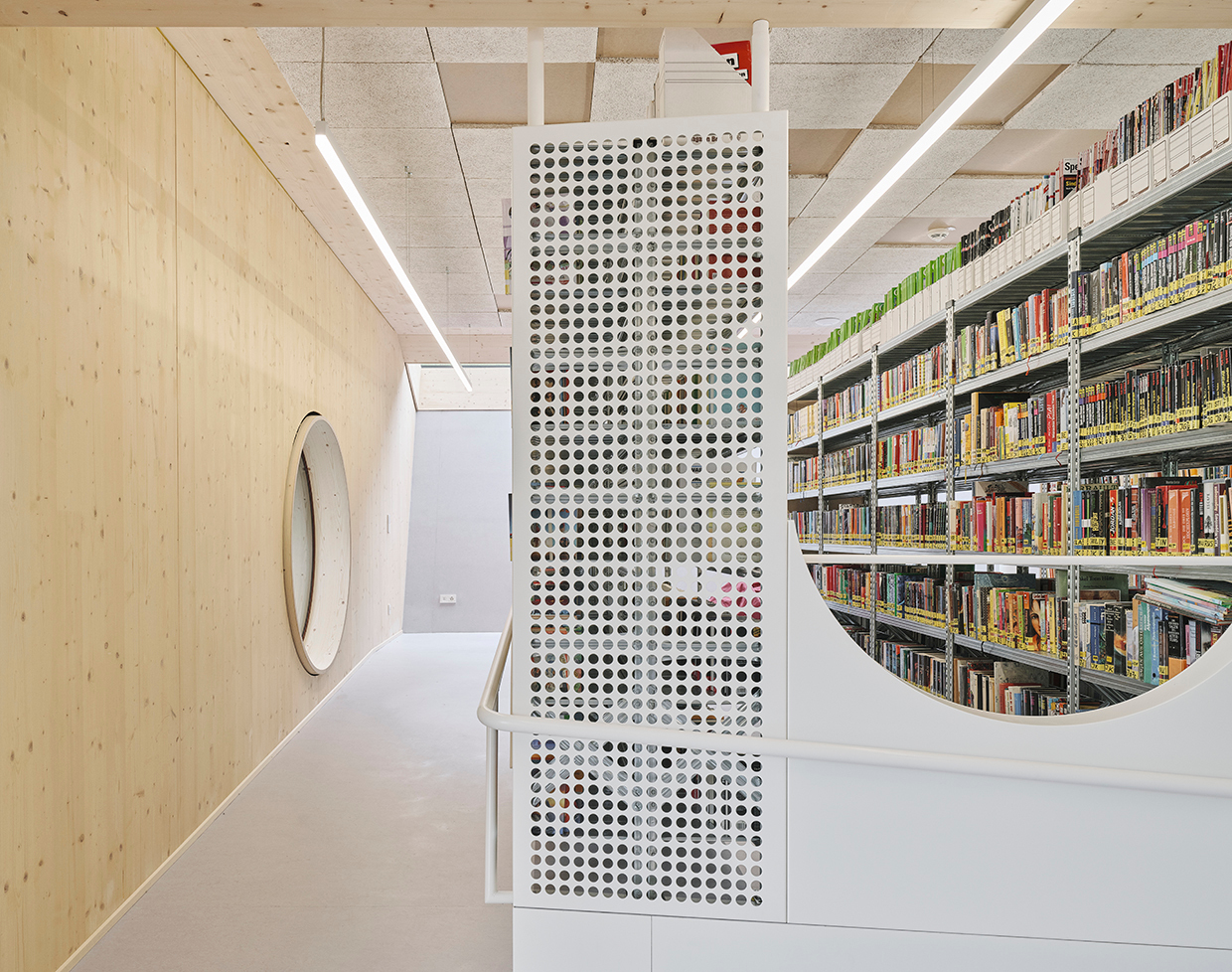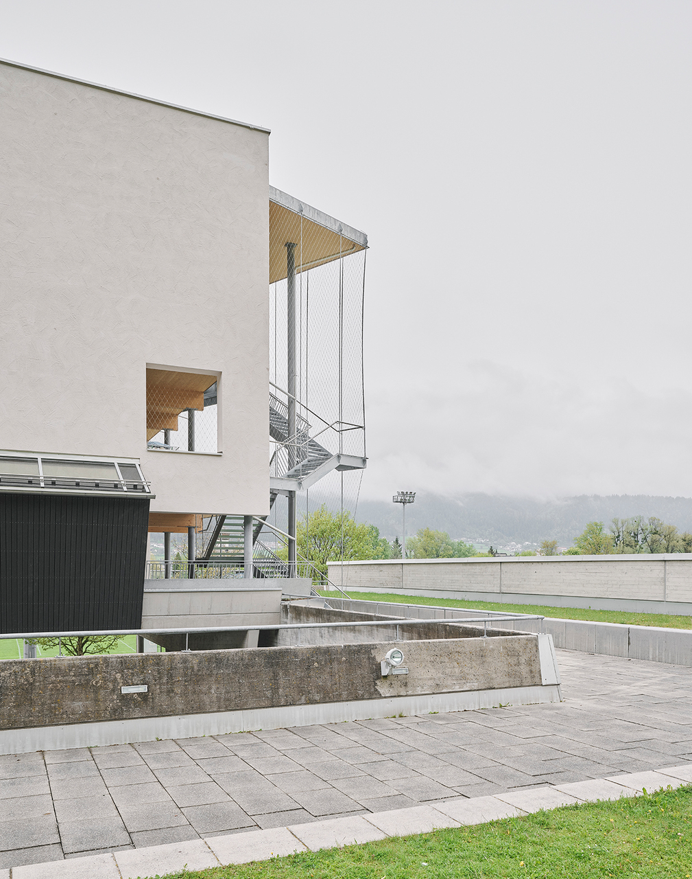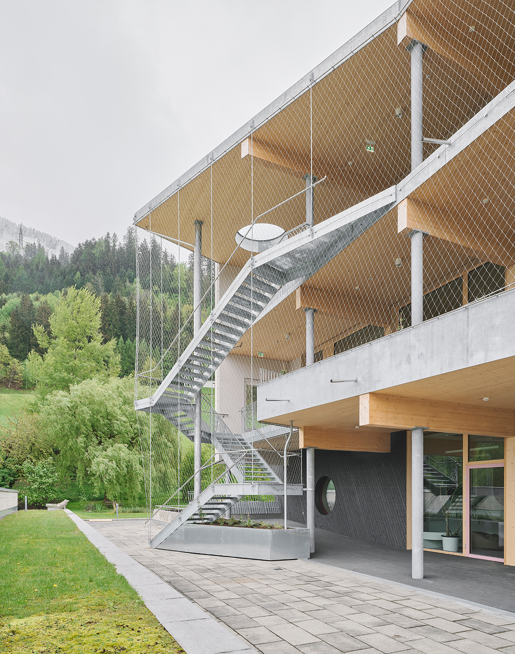 Im ersten Obergeschoß wurde die Bibliothek mit Leselounge untergebracht, der öffentlichste Bereich des Neubaus, der als schwarz ummanteltes Volumen die Fassade markant durchbricht. Der Vorbereich grenzt direkt an die Wegführung rund um das Haus und bindet den Zubau an die bestehende Pausenfläche auf dem Dach der angrenzenden Turnhalle an. Eine skulpturale Fluchttreppe verbindet die drei Ebenen, ein über alle Geschoße gespanntes Netz fungiert nicht nur als durchlässige Absturzsicherung, sondern auch als Rankgerüst für Pflanzen, die in den warmen Monaten ein angenehmes Mikroklima schaffen. (Text: Claudia Wedekind)