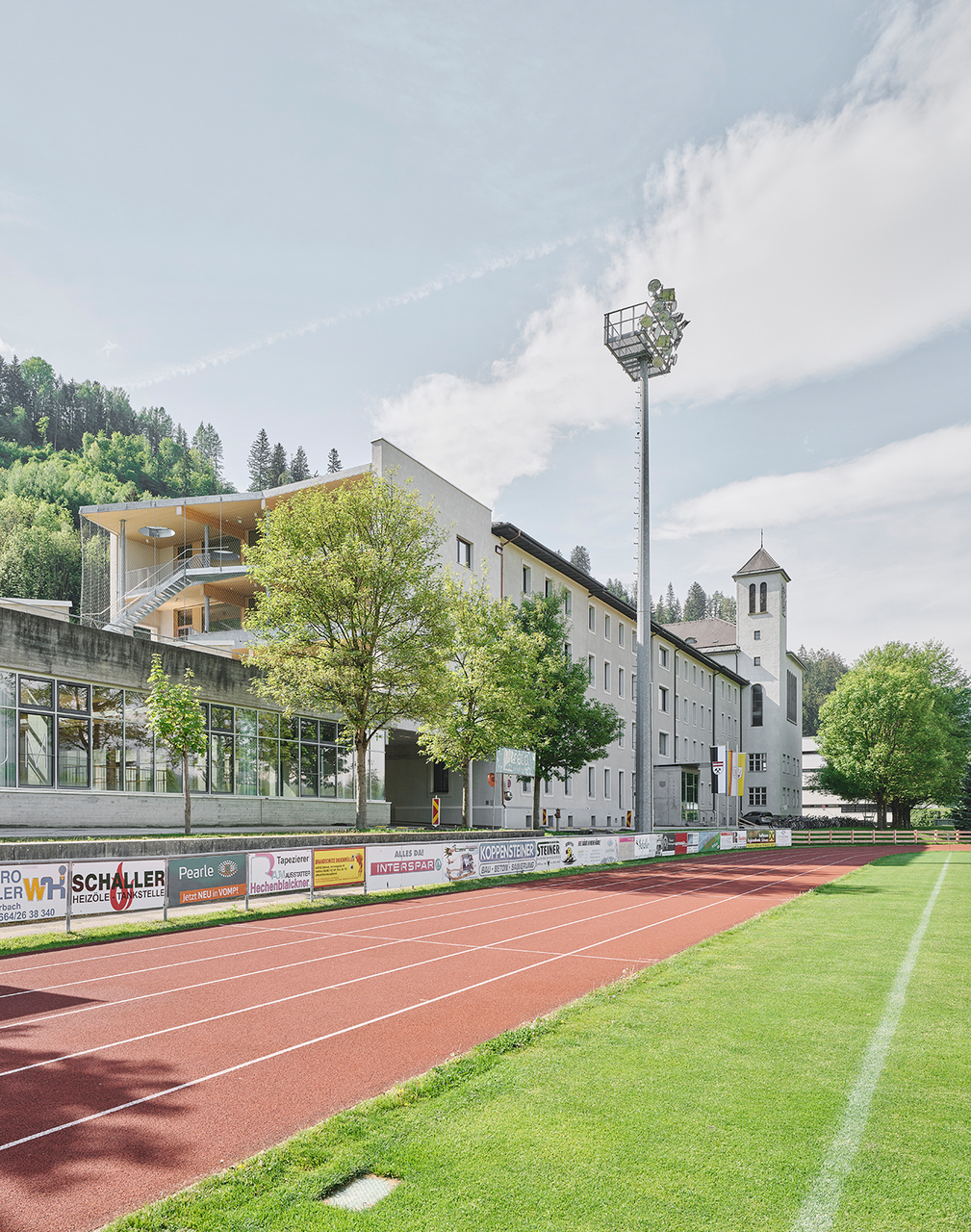Angedockt an den Altbau und über einer Durchfahrt auf Sichtbetonstützen aufgeständert, entstand ein dreigeschoßiger Kopfbau in Massivholzbauweise, der den Bestand nach Nordosten hin verlängert und Richtung Stadt öffnet. Zwei seitliche Scheiben fassen das Volumen, das in den beiden oberen Geschoßen sogenannte „Home Rooms“ beinhaltet, die direkt an die bestehenden Klassenzimmer angebunden sind. In den hellen, holzverkleideten Räumen finden die Schüler:innen mit Lerninseln und Couchen vielfältige Möglichkeiten zum konzentrierten Arbeiten, Spielen oder Chillen. Vorgelagerte, gedeckte Balkone interpretieren das Konzept der „Freiklassen“ der 1950er-Jahre neu und ergänzen das Raumangebot der „Wohnzimmer“. Dazwischen wurde der bestehende Gang des Altbaus verlängert und durch Aufenthaltszonen aufgewertet.