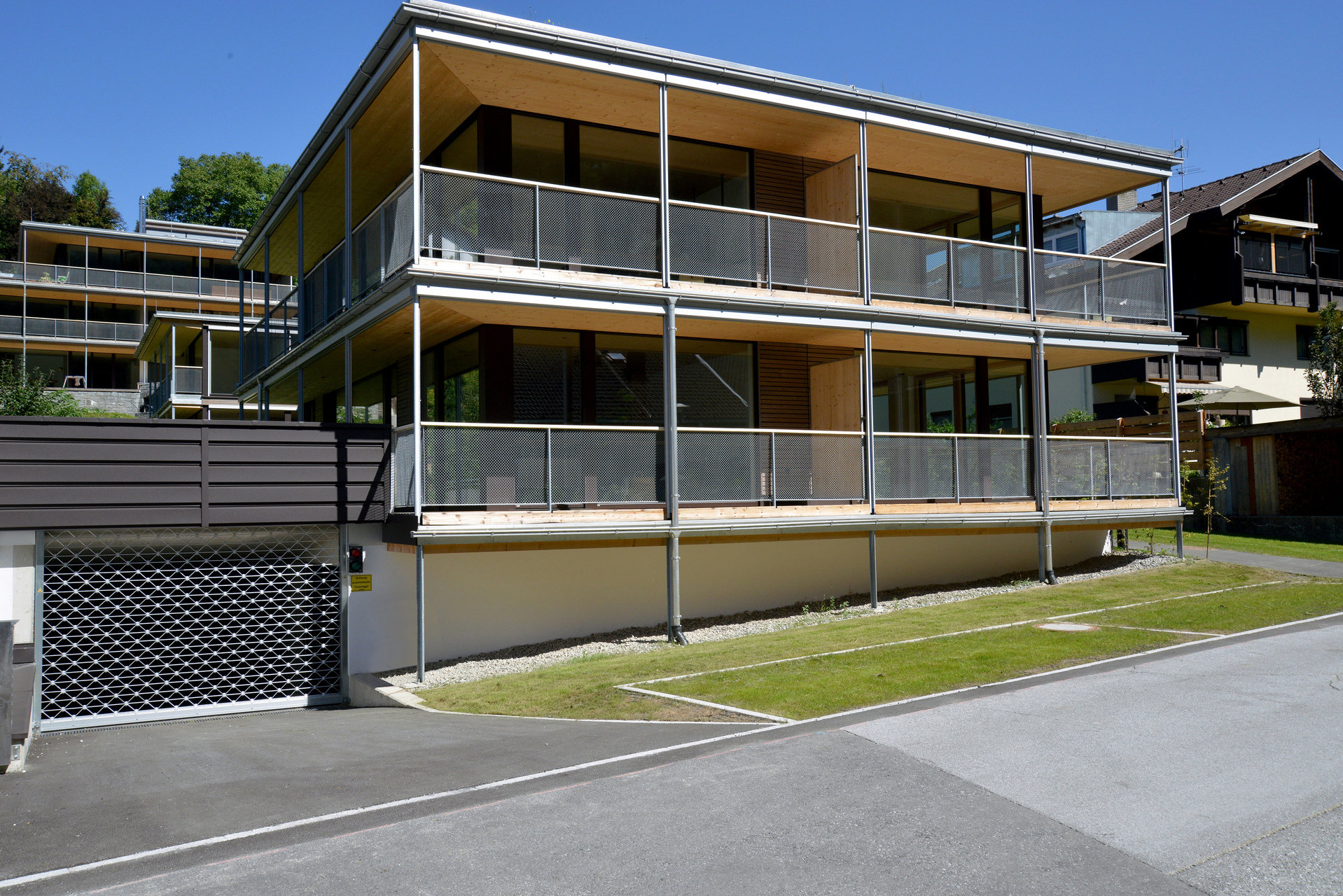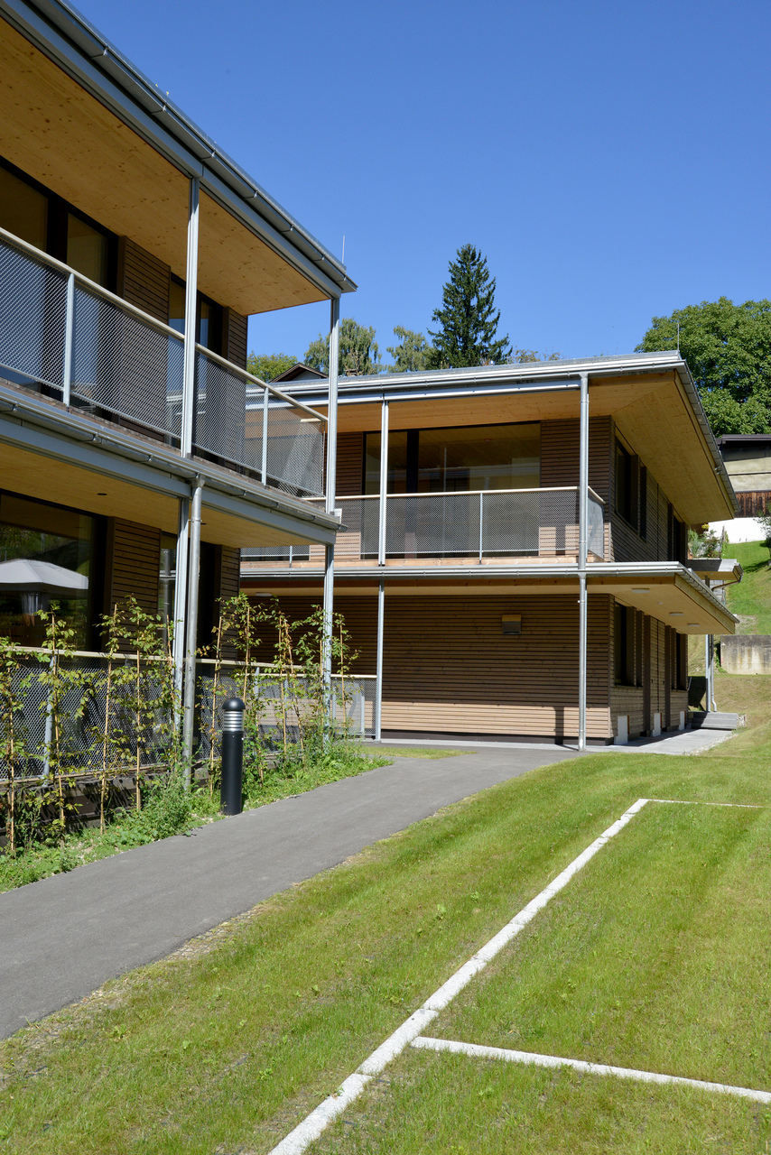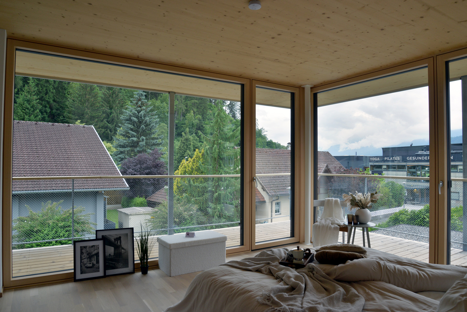 Die in Holzmassivbauweise errichteten Baukörper kommen dank sorgfältiger Detaillierung nahezu ohne Stahlverstärkungen aus – nur an der Fassade sind leichte Stahlstützen vorhanden. Umlaufende, vorgefertigte Holzbalkone, die thermisch getrennt mit einer speziellen Holzknaggenkonstruktion ausgeführt sind, erweitern die Wohnräume ins Freie. Raumhohe Verglasungen und außerhalb der Brüstung angeordnete Sonnenschutzrollos lassen die Räume optisch über die thermisch konditionierten Bereiche hinaus wirken – bei gleichzeitiger Einhaltung der Passivhaus-Grenzwerte gemäß PHPP. (Text: Architekt, bearbeitet)