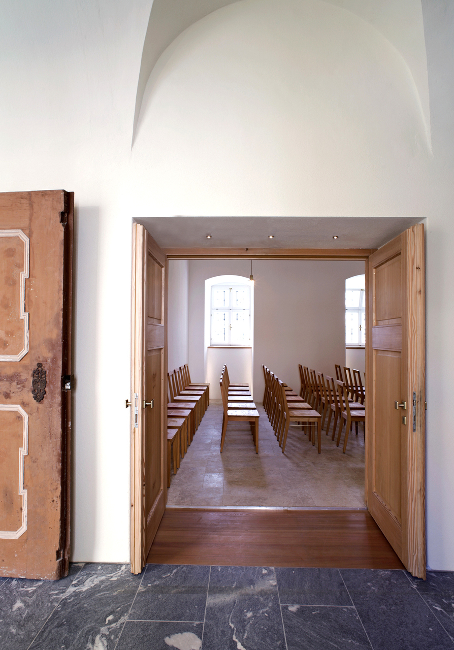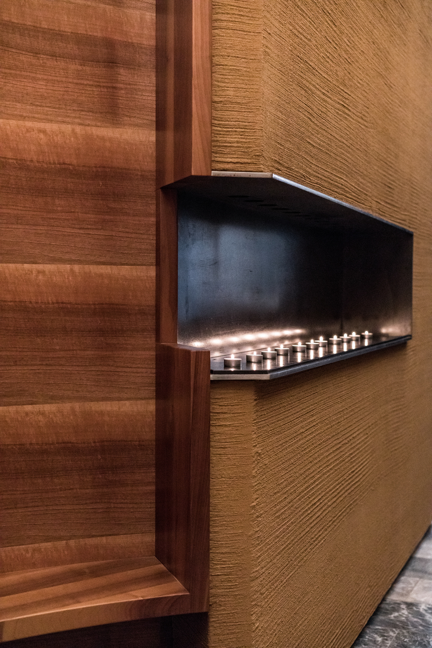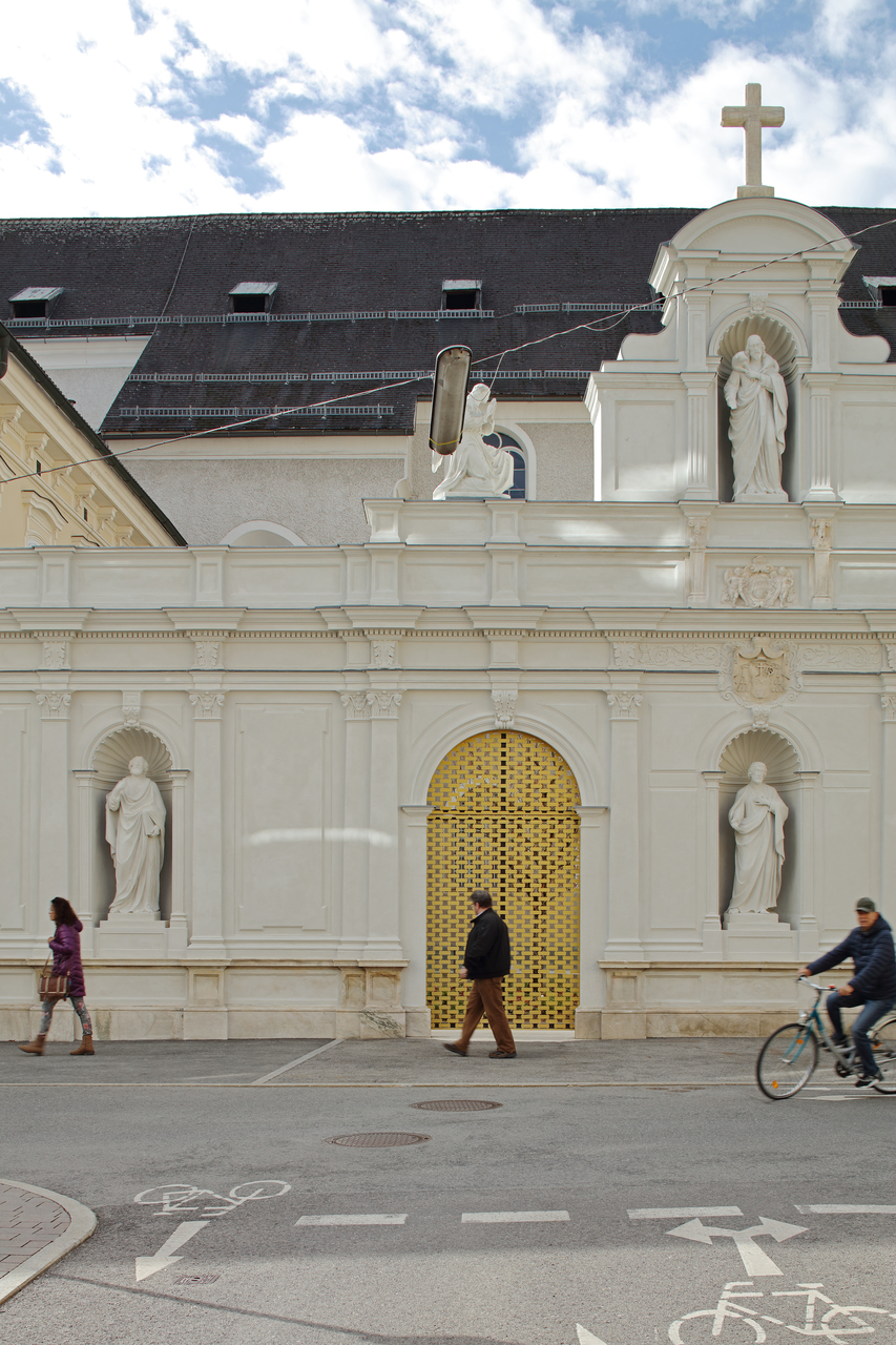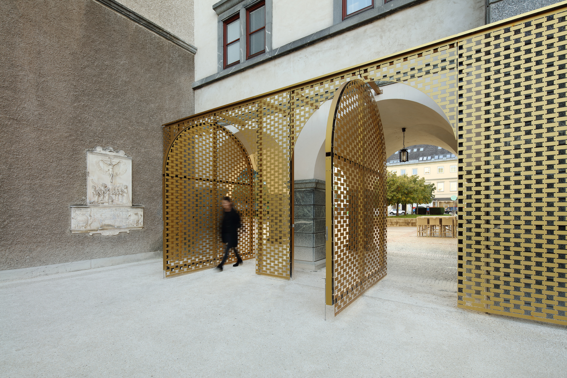 Nachts wird der Friedhof abgesperrt und braucht dazu nach Westen, zum Domplatz hin eine Abgrenzung. Der dafür gestaltete Wandschirm prägt mit seiner Materialität und Messingfarbe den Raum und erlangt einige Bedeutung – zumal er die Namenstafeln der Verstorbenen trägt. Mit seiner Durchlässigkeit wird er kaum als Sperre empfunden, sondern schafft vielmehr eine einladende Atmosphäre, die im Spiel von Licht und Schatten die Passage und den angrenzenden Raum aufwertet.