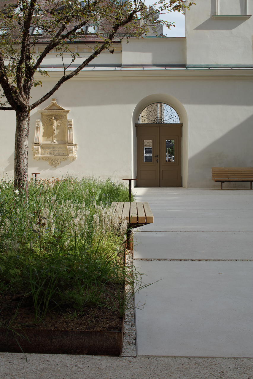 Zwei raumprägende Zierapfelbäume säumen die keilförmige Fläche zwischen den Urnenfeldern und spenden Schatten. Die Pflanzen rundherum tragen symbolischem Gehalt: Sie sind in Mariendarstellungen zu finden – so zum Beispiel Wald-Erdbeere, Akelei, Schafgarbe und Pfingstrose – und verweisen auf den „Hortus Conclusus“, den geschlossenen Garten als Sinnbild für Geschützt-Sein, Paradies, Kirche und für die Reinheit der Muttergottes.