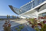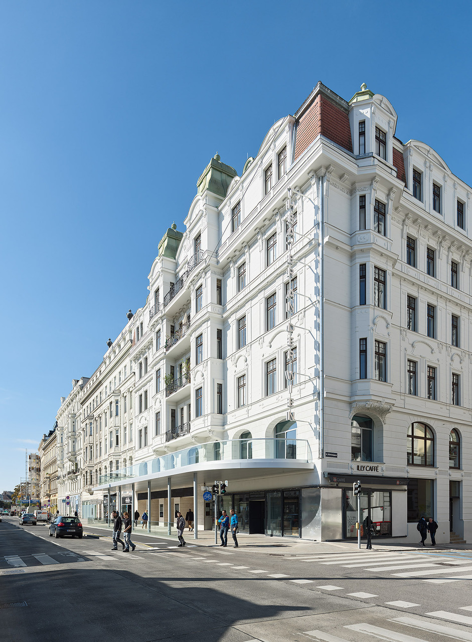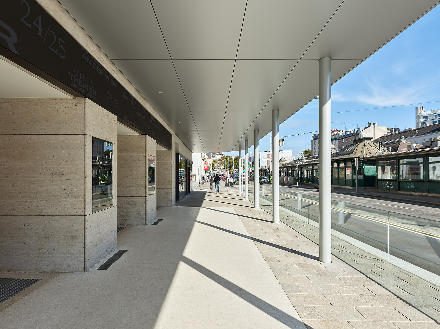 Wie ein Baldachin ragt die matt schimmernde Untersicht aus Aluminium über das Trottoir vor dem Eingang ins Theater an der Wien, dezent dehnt es so sein Foyer in den öffentlichen Raum aus. Endlich. Dass dieses Vordach im ersten Stock einen veritablen Balkon ausbildet, lassen erst die sechs Stahlsäulen am Gehsteigrand erahnen. Beim zweiten Blick hinauf nimmt man die gläserne Brüstung wahr. Für ein Vordach wäre es sehr stark dimensioniert, für den Pausenbalkon eines Theaters hingegen bemerkenswert schmal. Das neue, zweite Foyer, dem dieser Balkon seine Berechtigung verdankt, ist die eigentliche Sensation des Umbaus, den das Theater gerade hinter sich hat. Doch davon später – schon sein neuer Auftritt in der Stadt ist eine Sensation.