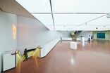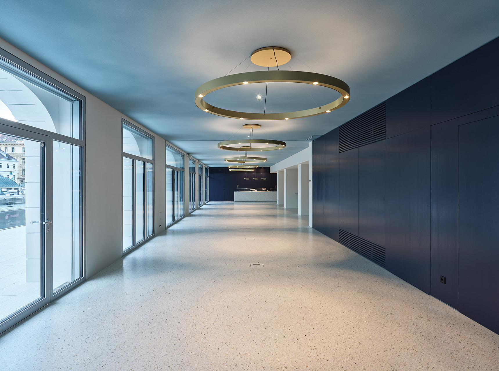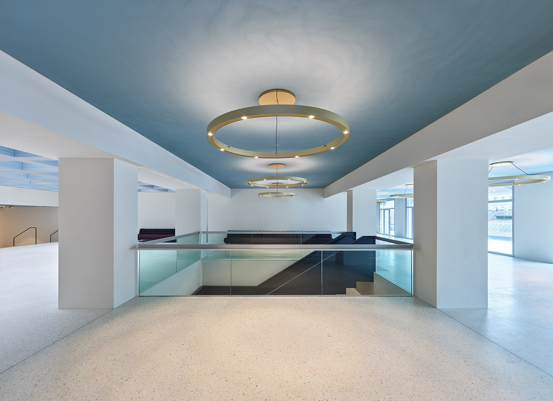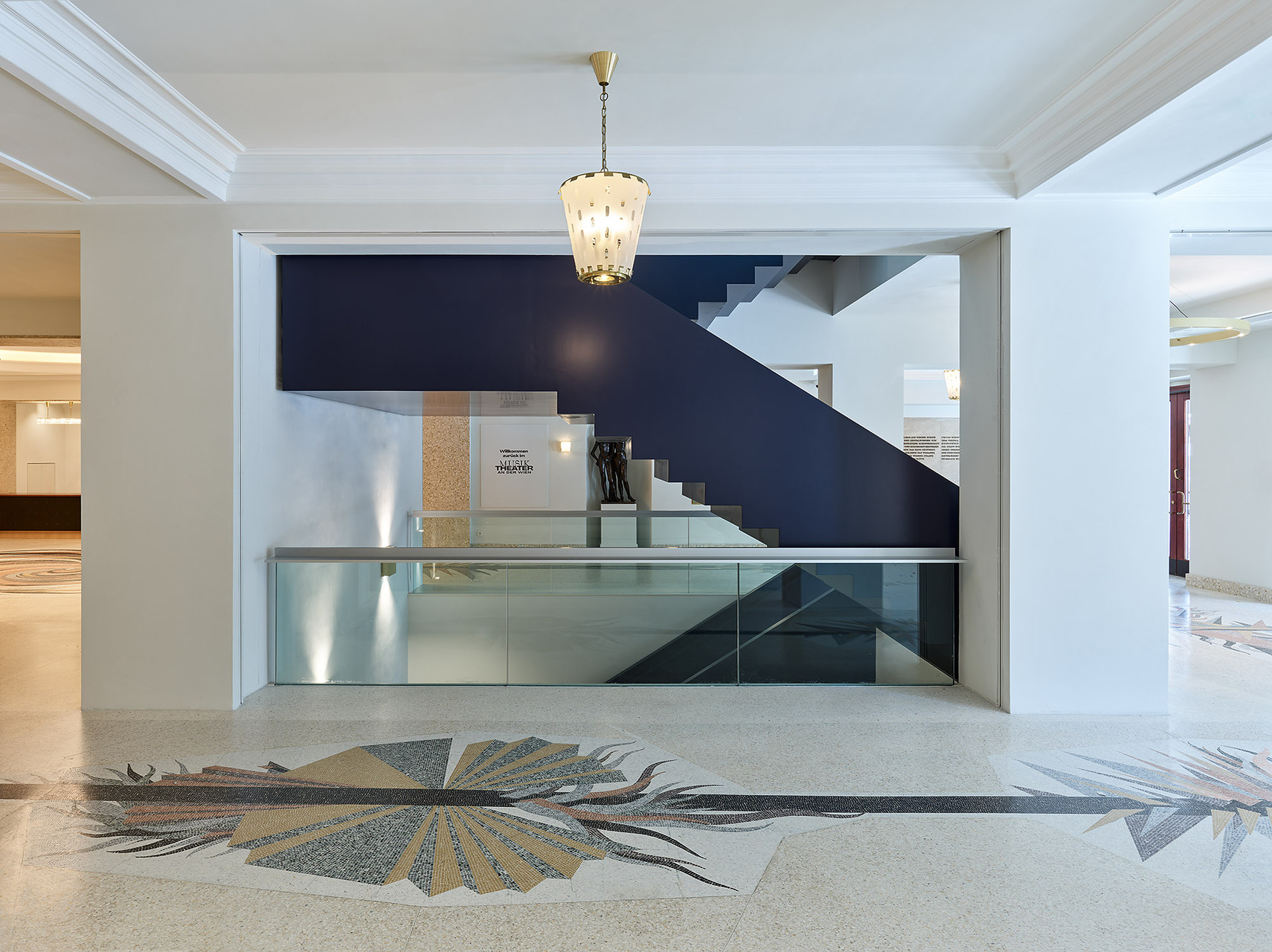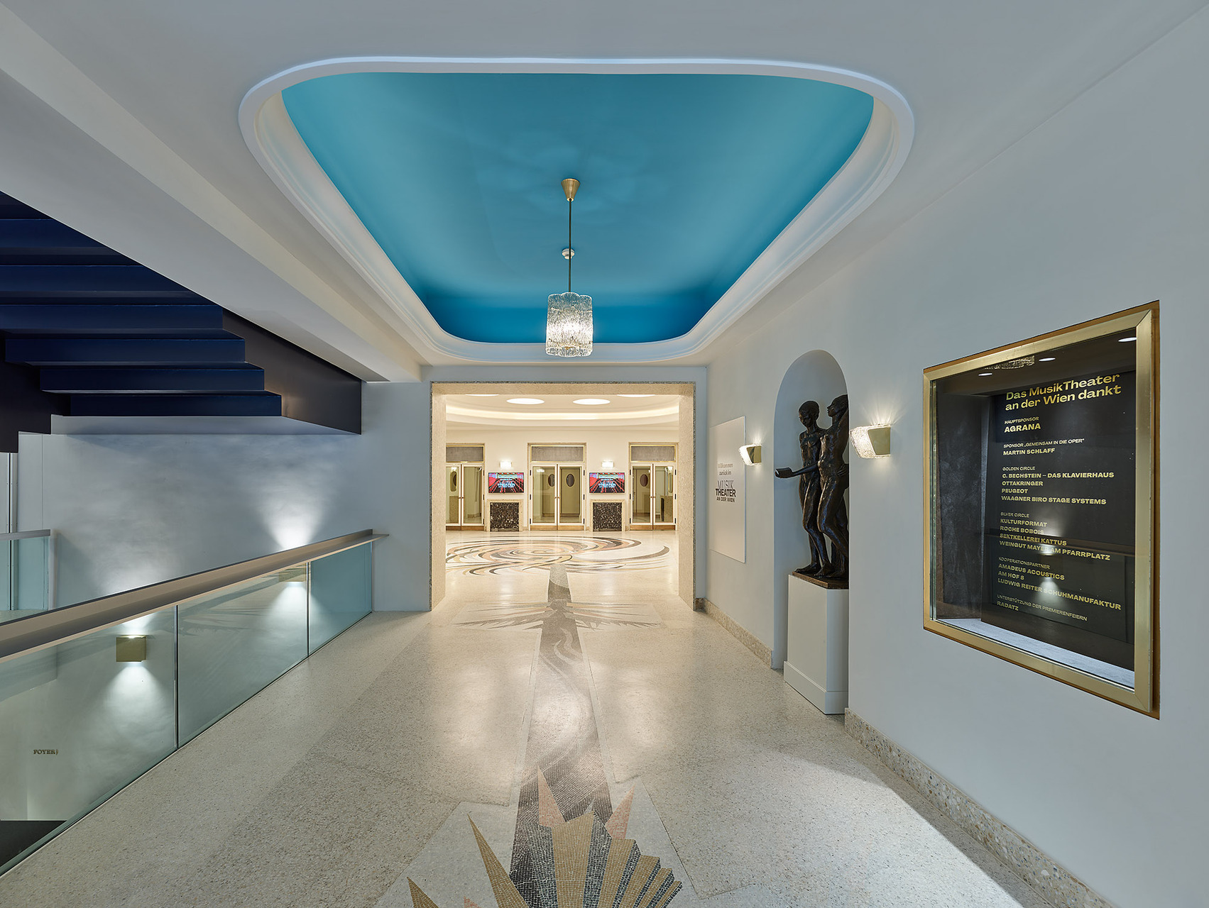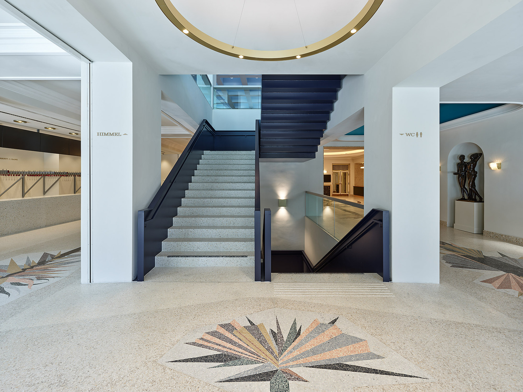 Die Königsidee der Architekten war, die Büros im ersten Stock aufseiten der Wienzeile zu eliminieren und so dem neuen Foyer im ersten Rang den Weg zu ebnen. Das war mutig, denn es antizipierte den nutzerseitigen Verzicht auf Büros mit Aussicht und die Zustimmung des Bundesdenkmalamts zu größeren Eingriffen. Beides geschah. Als großzügiger, offener Raum mit hellbeigem, an die Tonigkeit der 1960er-Jahre angepasstem Terrazzo und mattblauer Decke zieht sich das neue Foyer nun bis zu den verglasten Fenstertüren auf den neuen Balkon. „Himmel“ steht etwas euphemistisch im Parterre auf einem der vier weißen Pfeiler in der Mitte, zwischen denen nun eine leichte Treppe aus Schwarzstahl alle Ebenen vom Untergeschoß – der „Hölle“ – bis zum ersten Rang verbindet.
