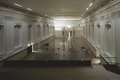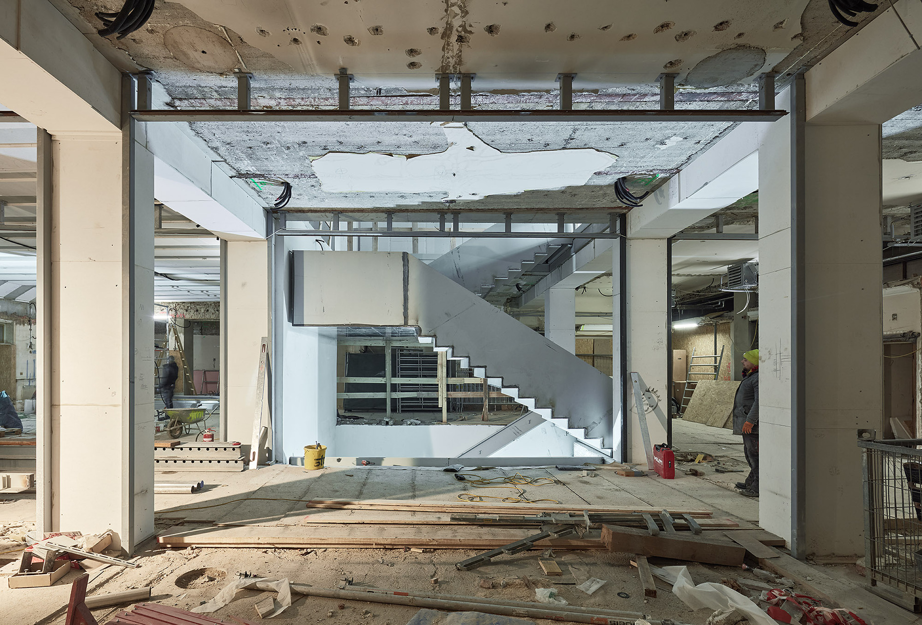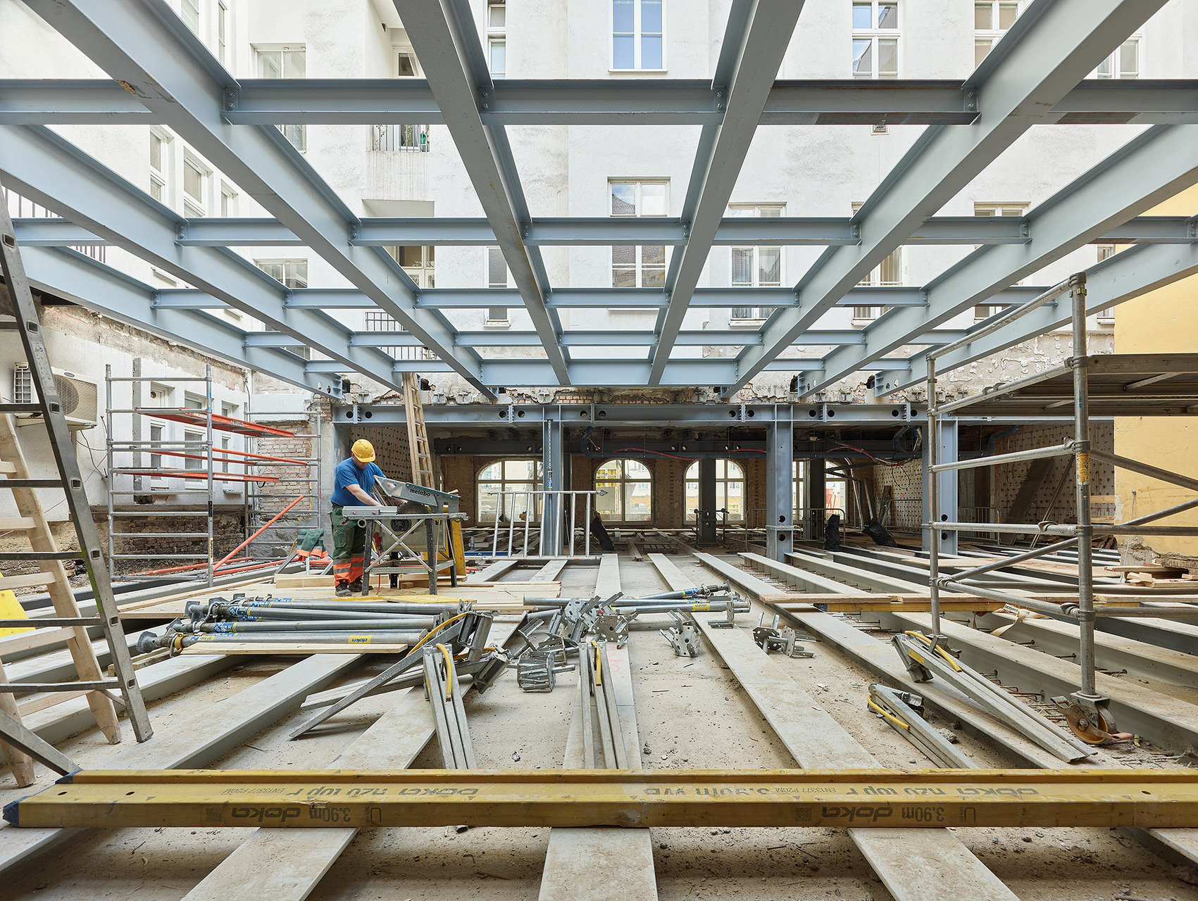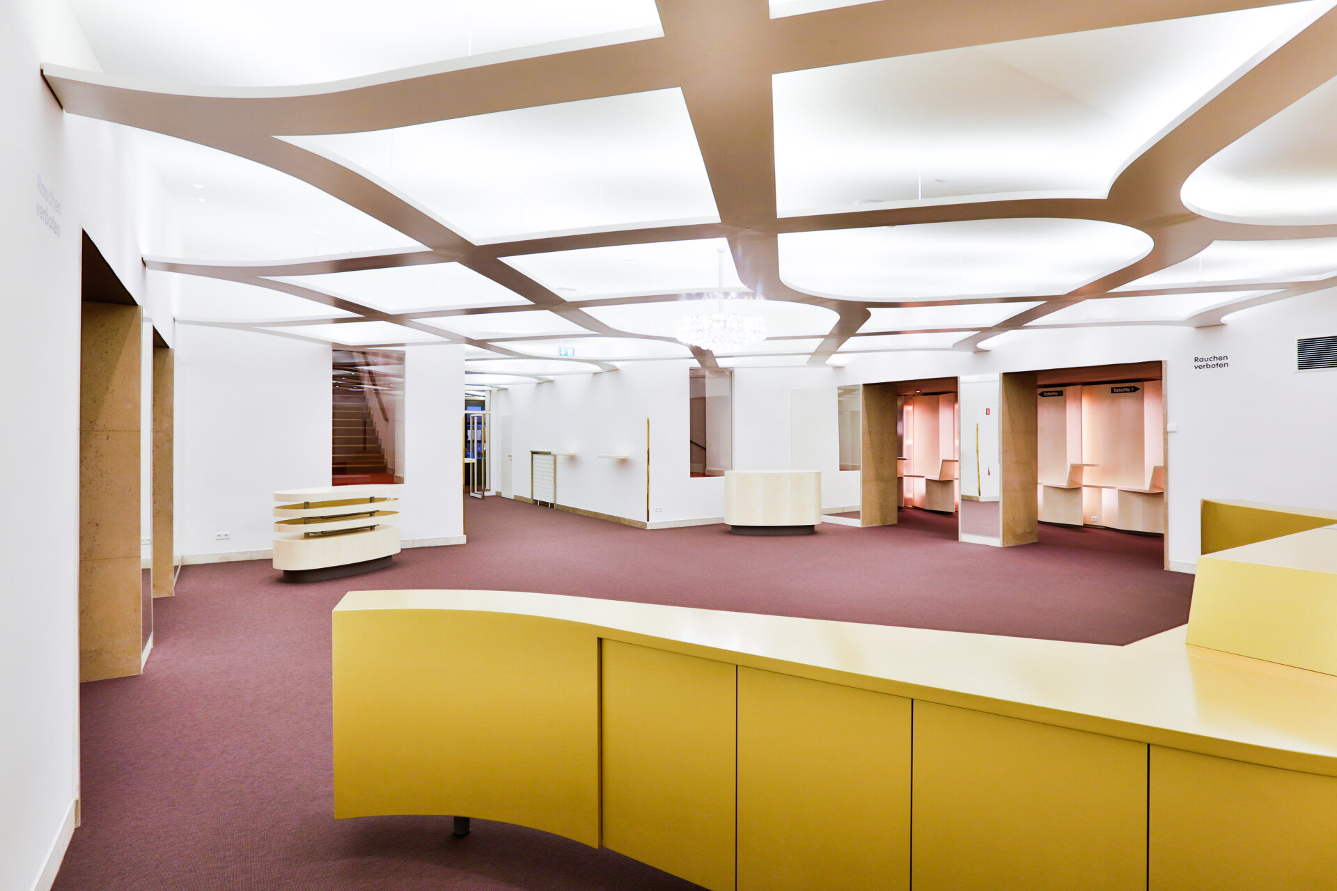 Die Umsetzung war extrem aufwendig. Um der Treppe Raum zu schaffen, musste der mittlere Teil des Foyers entkernt, die ovale, denkmalgeschützte Decke mit den runden Lichtern von Oskar Niedermoser entfernt, wieder eingesetzt und eine eindrucksvolle Stahlkonstruktion errichtet werden: eine Art Grid aus mächtigen, stützenbildenden I-Trägern, Unterzügen und der Konstruktion der Rasterkassettendecke mit Oberlichten im Hof, die nun einen Teil des Foyers belichtet und nicht so drückend erscheinen lässt. Im Kontext seiner neuen Größe wirken die drei Meter Raumhöhe niedrig, was allerdings bei Festbeleuchtung in Pausen und auf Premierenfeiern keine Rolle spielt.